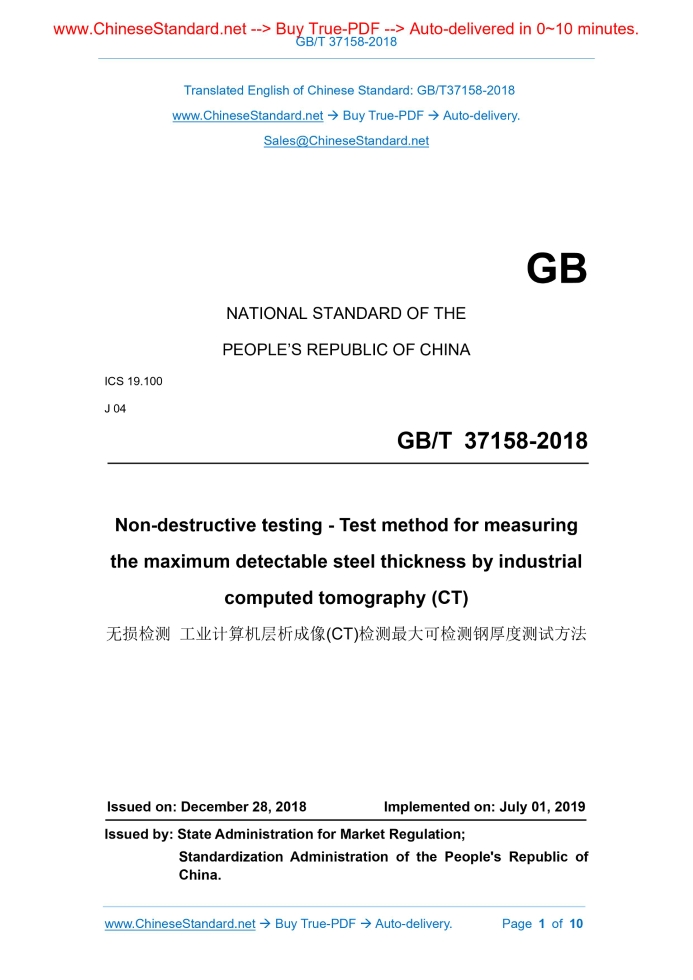 GB/T 37158-2018: Non-destructive testing - Test method for measuring the maximum detectable steel thickness by industrial computed tomography (CT) Delivery: 9 seconds. True-PDF full-copy in English & invoice will be downloaded + auto-delivered via email. See step-by-step procedure Status: Valid