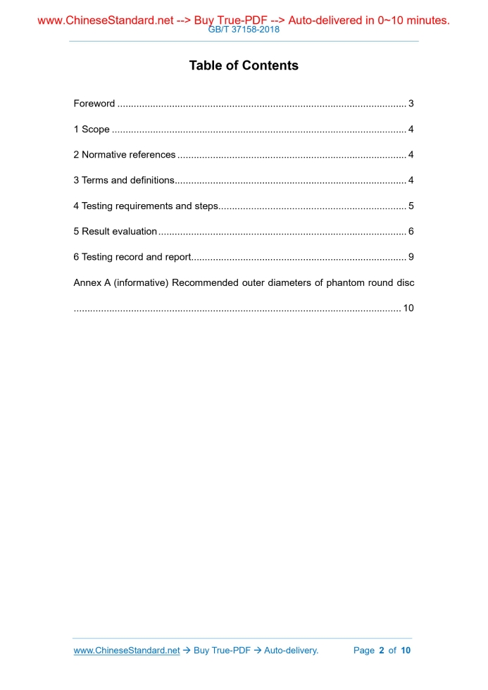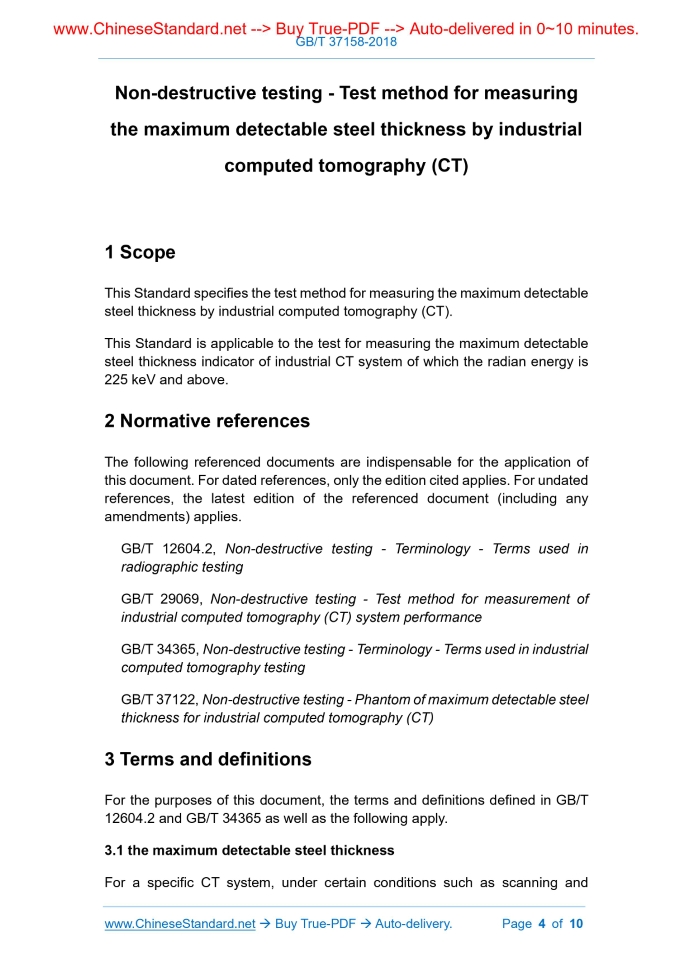 Similar standardsGB/T 37158-2018: Non-destructive testing - Test method for measuring the maximum detectable steel thickness by industrial computed tomography (CT)---This is an excerpt. Full copy of true-PDF in English version (including equations, symbols, images, flow-chart, tables, and figures etc.), auto-downloaded/delivered in 9 seconds, can be purchased online: https://www.ChineseStandard.net/PDF.aspx/GBT37158-2018 NATIONAL STANDARD OF THE PEOPLE’S REPUBLIC OF CHINA ICS 19.100 J 04 Non-destructive testing - Test method for measuring the maximum detectable steel thickness by industrial computed tomography (CT) ISSUED ON: DECEMBER 28, 2018 IMPLEMENTED ON: JULY 01, 2019 Issued by: State Administration for Market Regulation; Standardization Administration of the People's Republic of China. Table of ContentsForeword ... 3 1 Scope ... 4 2 Normative references ... 4 3 Terms and definitions ... 4 4 Testing requirements and steps... 5 5 Result evaluation ... 6 6 Testing record and report ... 9 Annex A (informative) Recommended outer diameters of phantom round disc ... 10 Non-destructive testing - Test method for measuring the maximum detectable steel thickness by industrial computed tomography (CT)1 ScopeThis Standard specifies the test method for measuring the maximum detectable steel thickness by industrial computed tomography (CT). This Standard is applicable to the test for measuring the maximum detectable steel thickness indicator of industrial CT system of which the radian energy is 225 keV and above.2 Normative referencesThe following referenced documents are indispensable for the application of this document. For dated references, only the edition cited applies. For undated references, the latest edition of the referenced document (including any amendments) applies. GB/T 12604.2, Non-destructive testing - Terminology - Terms used in radiographic testing GB/T 29069, Non-destructive testing - Test method for measurement of industrial computed tomography (CT) system performance GB/T 34365, Non-destructive testing - Terminology - Terms used in industrial computed tomography testing GB/T 37122, Non-destructive testing - Phantom of maximum detectable steel thickness for industrial computed tomography (CT)3 Terms and definitionsFor the purposes of this document, the terms and definitions defined in GB/T 12604.2 and GB/T 34365 as well as the following apply. 3.1 the maximum detectable steel thickness For a specific CT system, under certain conditions such as scanning and detectable steel thickness indicator of the system is better than the outer diameter size of phantom round disc. 5.3 Guideline Under specified spatial resolution conditions, when R=10% and CNR=3, the outer diameter size of round disc of tested phantom is defined as the maximum detectable steel thickness. This thickness value usually requires multiple testing of fitting curves. To simplify testing, it usually regards the outer diameter size of round disc of testable maximum phantom as the maximum detectable steel thickness under specified spatial resolution conditions, when R≥10% and CNR≥3.6 Testing record and report6.1 Testing record 6.1.1 Testing record usually shall contain detailed records such as standard test piece name, test purpose, test equipment, ray source parameters, scanning mode, slice thickness, slice position, scanning time, field of view diameter, image matrix, reconstruction parameters, image description, evaluation criteria, tester, reviewer, test date. 6.1.2 Image data file shall generally include image number, standard test piece name, test purpose, test equipment, ray source parameters, scanning mode, slice thickness, slice position, scanning time, field of view diameter, image matrix, reconstruction parameters, etc. 6.2 Testing report Testing report shall usually contain standard test piece name, test purpose, test equipment, test method, slice thickness, slice position, image matrix, test image, evaluation standard, evaluation result, tester, reviewer, approver, test date, report date. ......Source: Above contents are excerpted from the full-copy PDF -- translated/reviewed by: www.ChineseStandard.net / Wayne Zheng et al. Tips & Frequently Asked Questions:Question 1: How long will the true-PDF of English version of GB/T 37158-2018 be delivered?Answer: The full copy PDF of English version of GB/T 37158-2018 can be downloaded in 9 seconds, and it will also be emailed to you in 9 seconds (double mechanisms to ensure the delivery reliably), with PDF-invoice.Question 2: Can I share the purchased PDF of GB/T 37158-2018_English with my colleagues?Answer: Yes. The purchased PDF of GB/T 37158-2018_English will be deemed to be sold to your employer/organization who actually paid for it, including your colleagues and your employer's intranet.Question 3: Does the price include tax/VAT?Answer: Yes. Our tax invoice, downloaded/delivered in 9 seconds, includes all tax/VAT and complies with 100+ countries' tax regulations (tax exempted in 100+ countries) -- See Avoidance of Double Taxation Agreements (DTAs): List of DTAs signed between Singapore and 100+ countriesQuestion 4: Do you accept my currency other than USD?Answer: Yes. www.ChineseStandard.us -- GB/T 37158-2018 -- Click this link and select your country/currency to pay, the exact amount in your currency will be printed on the invoice. Full PDF will also be downloaded/emailed in 9 seconds.How to buy and download a true PDF of English version of GB/T 37158-2018?A step-by-step guide to download PDF of GB/T 37158-2018_EnglishStep 1: Visit website https://www.ChineseStandard.net (Pay in USD), or https://www.ChineseStandard.us (Pay in any currencies such as Euro, KRW, JPY, AUD).Step 2: Search keyword "GB/T 37158-2018". Step 3: Click "Add to Cart". If multiple PDFs are required, repeat steps 2 and 3 to add up to 12 PDFs to cart. Step 4: Select payment option (Via payment agents Stripe or PayPal). Step 5: Customize Tax Invoice -- Fill up your email etc. Step 6: 