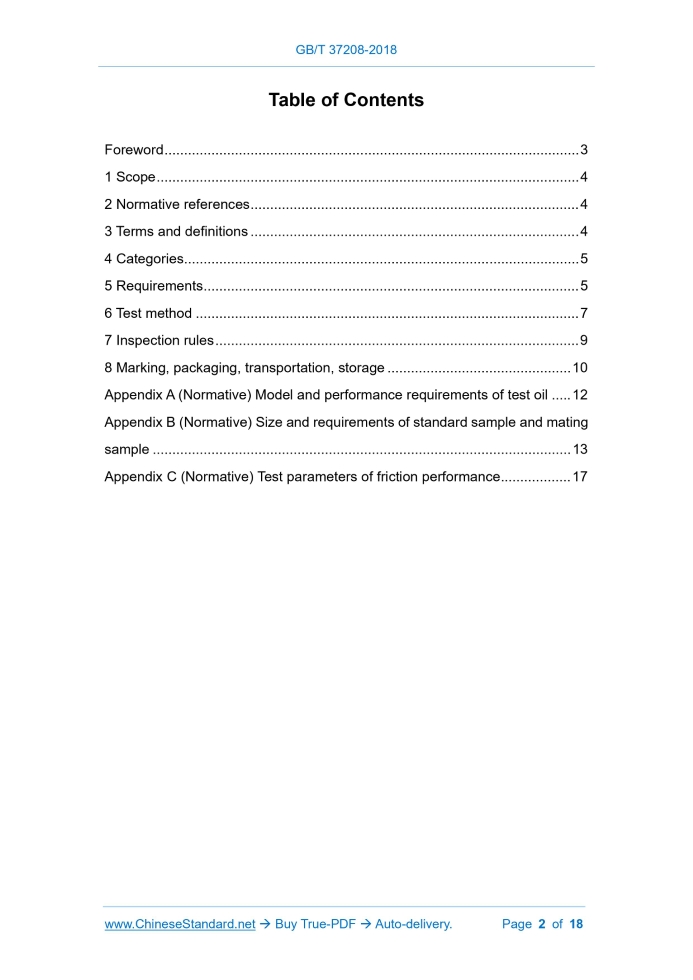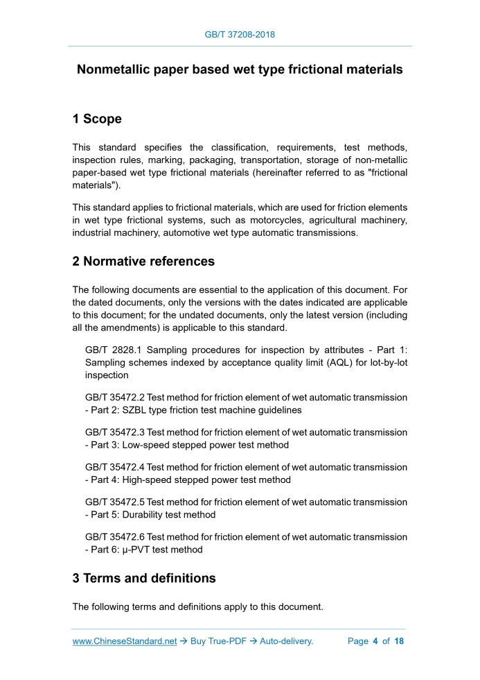 Similar standardsGB/T 37208-2018: Nonmetallic paper based wet type frictional materials---This is an excerpt. Full copy of true-PDF in English version (including equations, symbols, images, flow-chart, tables, and figures etc.), auto-downloaded/delivered in 9 seconds, can be purchased online: https://www.ChineseStandard.net/PDF.aspx/GBT37208-2018GB NATIONAL STANDARD OF THE PEOPLE’S REPUBLIC OF CHINA ICS 43.040.50 Q 69 Nonmetallic paper based wet type frictional materials ISSUED ON: DECEMBER 28, 2018 IMPLEMENTED ON: NOVEMBER 01, 2019 Issued by: General Administration of Quality Supervision, Inspection and Quarantine of PRC; Standardization Administration of PRC. Table of ContentsForeword ... 3 1 Scope ... 4 2 Normative references ... 4 3 Terms and definitions ... 4 4 Categories... 5 5 Requirements ... 5 6 Test method ... 7 7 Inspection rules ... 9 8 Marking, packaging, transportation, storage ... 10 Appendix A (Normative) Model and performance requirements of test oil ... 12 Appendix B (Normative) Size and requirements of standard sample and mating sample ... 13 Appendix C (Normative) Test parameters of friction performance ... 17 Nonmetallic paper based wet type frictional materials1 ScopeThis standard specifies the classification, requirements, test methods, inspection rules, marking, packaging, transportation, storage of non-metallic paper-based wet type frictional materials (hereinafter referred to as "frictional materials"). This standard applies to frictional materials, which are used for friction elements in wet type frictional systems, such as motorcycles, agricultural machinery, industrial machinery, automotive wet type automatic transmissions.2 Normative referencesThe following documents are essential to the application of this document. For the dated documents, only the versions with the dates indicated are applicable to this document; for the undated documents, only the latest version (including all the amendments) is applicable to this standard. GB/T 2828.1 Sampling procedures for inspection by attributes - Part 1: Sampling schemes indexed by acceptance quality limit (AQL) for lot-by-lot inspection GB/T 35472.2 Test method for friction element of wet automatic transmission - Part 2: SZBL type friction test machine guidelines GB/T 35472.3 Test method for friction element of wet automatic transmission - Part 3: Low-speed stepped power test method GB/T 35472.4 Test method for friction element of wet automatic transmission - Part 4: High-speed stepped power test method GB/T 35472.5 Test method for friction element of wet automatic transmission - Part 5: Durability test method GB/T 35472.6 Test method for friction element of wet automatic transmission - Part 6: μ-PVT test method3 Terms and definitionsThe following terms and definitions apply to this document. 6.4.2 The test oil shall meet the requirements of Appendix A. Type 1 frictional materials use No.1 standard test oil. Type 2 frictional materials use No.2 standard test oil. Type 3 frictional materials use No.3 standard test oil. 6.4.3 The size and requirements of the test sample and the mating sample shall meet the requirements of Appendix B. When the size of the inspection lot product is inconsistent with the standard sample, it shall use the standard sample, which is produced at the same time as the inspection lot product, by the same material and process, as the test sample. 6.4.4 Before the test, put the sample in the specified oil. Soak it for more than 30 min, at room temperature. 6.4.5 Carry out the friction performance test, in accordance with the provisions of GB/T 35472.6. The test parameters shall comply with the provisions of Appendix C. 6.5 Determination of wear After the test samples are soaked, measure and record the thickness of each test sample. For each test sample, measure at least three points (circumferentially equal-divided), these points are permanently marked AND used in the measurement after the test. Record the thickness of each measurement point of each test sample. Use its arithmetic average as the thickness value of the test sample before the test. After completing all the test stages, take out the test samples. Measure and record the thickness of each test sample, at the same measurement point, in the same way. Use the arithmetic mean as the thickness value of the test sample after the test. The thickness difference, before and after the test, is taken as the wear of the test sample. Take the value with the largest wear in a group of test samples, as the reported value. Use the micron micrometer, which has an accuracy of 0.001 mm, for measurement. The diameter of the measuring head is not less than 3.2 mm. 6.6 Power increment test The grade test of low-speed power increment test is carried out, according to GB/T 35472.3. The grade test of the high-speed power increment test is carried out, according to GB/T 35472.4. 6.7 Durability test The durability test is carried out, according to GB/T 35472.5. For the durability test, it shall carry out 200 running-in first; THEN carry out 10000 test cycles, according to the single condition in the power increment stepwise grade test. material and standard specimen size. 7.3 Judgment of results 7.3.1 Appearance quality, flatness, thickness shall be tested piece by piece; it is judged according to Table 5, respectively. 7.3.2 The friction performance is tested by standard samples. When the measured midpoint coefficient, the breakaway coefficient, the ratio of the endpoint coefficient to the midpoint coefficient, the wear all meet the requirements of 5.4, THEN, the above four items of the batch of products are determined qualified. If any item does not meet the requirements of 5.4, it shall use the two sets of standard samples, that have not been tested or used, for two repeated tests. If the two repeated test results meet the requirements of 5.4, it is still judged that the four items of the friction performance of the batch of products are qualified; it s