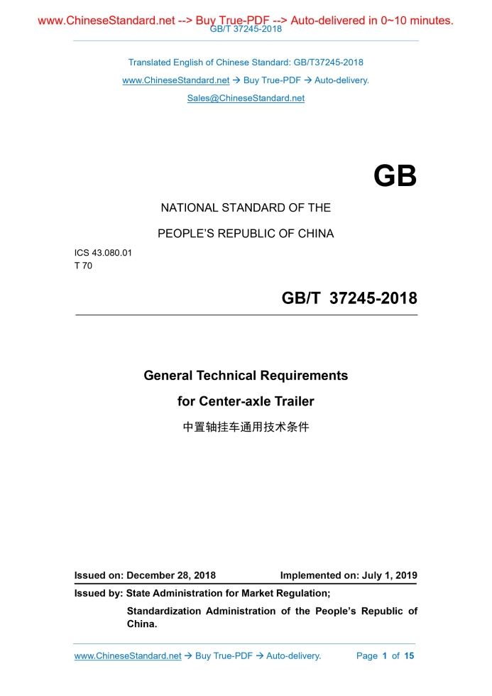 GB/T 37245-2018: General Technical Requirements for Center-axle Trailer Delivery: 9 seconds. True-PDF full-copy in English & invoice will be downloaded + auto-delivered via email. See step-by-step procedure Status: Valid