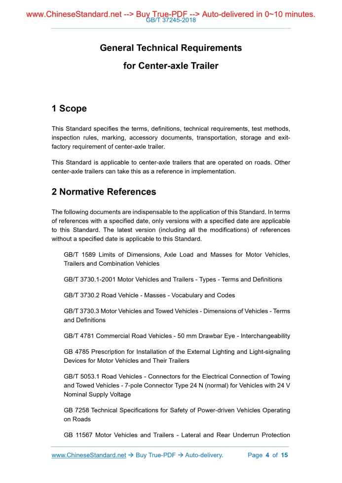 Similar standardsGB/T 37245-2018: General Technical Requirements for Center-axle Trailer---This is an excerpt. Full copy of true-PDF in English version (including equations, symbols, images, flow-chart, tables, and figures etc.), auto-downloaded/delivered in 9 seconds, can be purchased online: https://www.ChineseStandard.net/PDF.aspx/GBT37245-2018GB NATIONAL STANDARD OF THE PEOPLE’S REPUBLIC OF CHINA ICS 43.080.01 T 70 General Technical Requirements for Center-axle Trailer Issued on: DECEMBER 28, 2018 Implemented on: JULY 1, 2019 Issued by. State Administration for Market Regulation; Standardization Administration of the People’s Republic of China. Table of ContentsForeword ... 3 1 Scope ... 4 2 Normative References ... 4 3 Terms and Definitions ... 6 4 Technical Requirements ... 7 5 Test Methods ... 13 6 Inspection Rules ... 14 7 Marking, Accessory Documents, Transportation, Storage and Exit-factory Requirement ... 15 General Technical Requirements for Center-axle Trailer1 ScopeThis Standard specifies the terms, definitions, technical requirements, test methods, inspection rules, marking, accessory documents, transportation, storage and exit- factory requirement of center-axle trailer. This Standard is applicable to center-axle trailers that are operated on roads. Other center-axle trailers can take this as a reference in implementation.2 Normative ReferencesThe following documents are indispensable to the application of this Standard. In terms of references with a specified date, only versions with a specified date are applicable to this Standard. The latest version (including all the modifications) of references without a specified date is applicable to this Standard. GB/T 1589 Limits of Dimensions, Axle Load and Masses for Motor Vehicles, Trailers and Combination Vehicles GB/T 3730.1-2001 Motor Vehicles and Trailers - Types - Terms and Definitions GB/T 3730.2 Road Vehicle - Masses - Vocabulary and Codes GB/T 3730.3 Motor Vehicles and Towed Vehicles - Dimensions of Vehicles - Terms and Definitions GB/T 4781 Commercial Road Vehicles - 50 mm Drawbar Eye - Interchangeability GB 4785 Prescription for Installation of the External Lighting and Light-signaling Devices for Motor Vehicles and Their Trailers GB/T 5053.1 Road Vehicles - Connectors for the Electrical Connection of Towing and Towed Vehicles - 7-pole Connector Type 24 N (normal) for Vehicles with 24 V Nominal Supply Voltage GB 7258 Technical Specifications for Safety of Power-driven Vehicles Operating on Roads GB 11567 Motor Vehicles and Trailers - Lateral and Rear Underrun Protection between Towing Vehicles and Trailers GB/T 35782 Specification for Swap Trailer Transport of Road Vehicles GB/T 36121 Technical Requirements for Caravans JB/T 5943 Engineering Machinery - General Technical Specifications for Weldments JT/T 389 Specification for Van Trailers QC/T 484 Automobile Paint Coating ISO 11407 Commercial Road Vehicles - Mechanical Coupling between Towing Vehicles with Coupling Mounted Forward and Below, and Center-axle Trailers - Interchangeability ISO 12357 Road Vehicles - Drawbar Couplings and Eyes for Rigid Drawbars - Strength Tests3 Terms and DefinitionsThe following terms and definitions, and what is defined in GB 1589, GB/T 3730.1 ~ 3730.3 and GB/T 17350 are applicable to this document. In order to make it convenient for usage, some terms and definitions in GB/T 3730.1 are repeatedly listed out below. 3.1 Center-axle Trailer Center-axle trailer refers to a kind of trailer, whose traction device cannot vertically move (relative to trailer) and whose axle is close to the center of gravity (when evenly loaded). In terms of this kind of trailer, only a little vertical static load is acting on the tractor, and not more than 10% of the maximum total mass of trailer or 10,000 N of load (the smaller one shall prevail). One axle or multiple axles can be driven by the tractor. [GB/T 3730.1-2001, definition 2.2.3] 3.2 Center-axle Trailer Combination Center-axle trailer combination refers to the combination of truck and center-axle trailer. 3.3 Van Center-axle Trailer Van center-axle trailer refers to center-axle trailer, which has an independent closed compartment structure, including fixed compartment and interchangeable compartment, and can endure the stipulated load. 4.1.8 After van center-axle trailer is connected with truck, when center-axle trailer’s supporting device is withdrawn, the minimum ground clearance shall be not less than 320 mm. 4.1.9 The dimension parameters of connecting device of center-axle trailer (excluding caravan) and position parameter of adapted truck connector shall be marked in a conspicuous position of the front-end beam of the frame and clarified in technical documents. 4.1.10 Center-axle trailer for vehicle transportation shall comply with relevant requirements of finished trailers in GB/T 26774; center-axle caravan shall comply with relevant requirements of finished trailers in GB/T 36121. 4.1.11 Refrigeration and insulation performance of refrigerating van center-axle trailer shall comply with the stipulation in GB 29753. 4.2 Frame 4.2.1 When the total length of frame is not more than 8,000 mm, the dimensional deviation of its length shall be ± 5 mm. Every 1,000 mm of increase in length (when the increase is less than 1,000 mm, count by 1,000 mm), the dimensional deviation of length is allowed to increase 1 mm. The dimensional deviation of the measured width at random measurement point shall be ± 4 mm. 4.2.2 The longitudinal straightness tolerance of longitudinal web shall be 2 mm in random 1,000 mm of length; it shall be 1‰ length in the full length. 4.2.3 At random cross section of the longitudinal and horizontal beam, the perpendicularity tolerance of the upper and lower air foil against the web shall be not more than 1% of the width of the flange. 4.2.4 The symmetric upper plane of the left and right longitudinal beam of the frame assembly shall be within the same plane. The flatness t