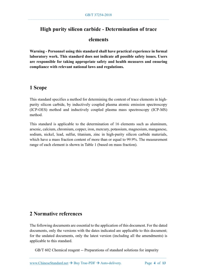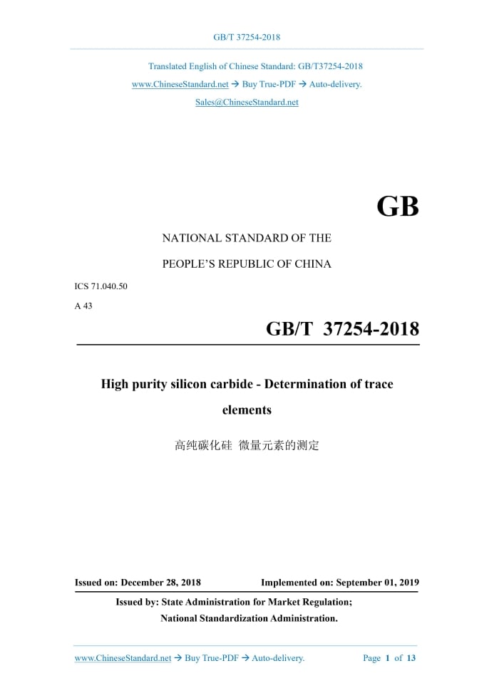 GB/T 37254-2018: High purity silicon carbide -- Determination of trace elements Delivery: 9 seconds. True-PDF full-copy in English & invoice will be downloaded + auto-delivered via email. See step-by-step procedure Status: Valid