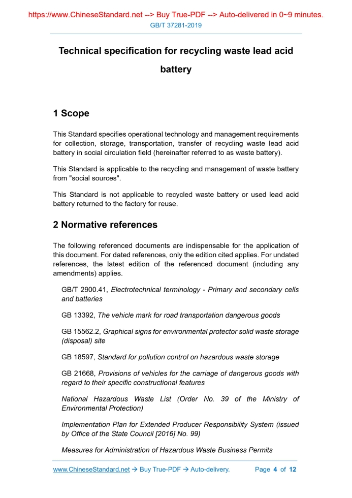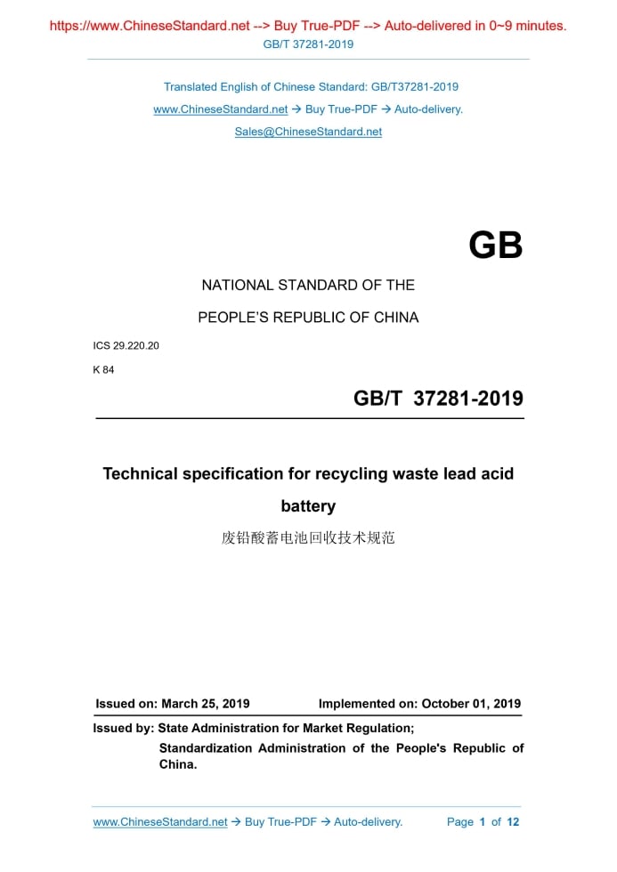 GB/T 37281-2019: Technical specification for recycling waste lead acid battery Delivery: 9 seconds. True-PDF full-copy in English & invoice will be downloaded + auto-delivered via email. See step-by-step procedure Status: Valid