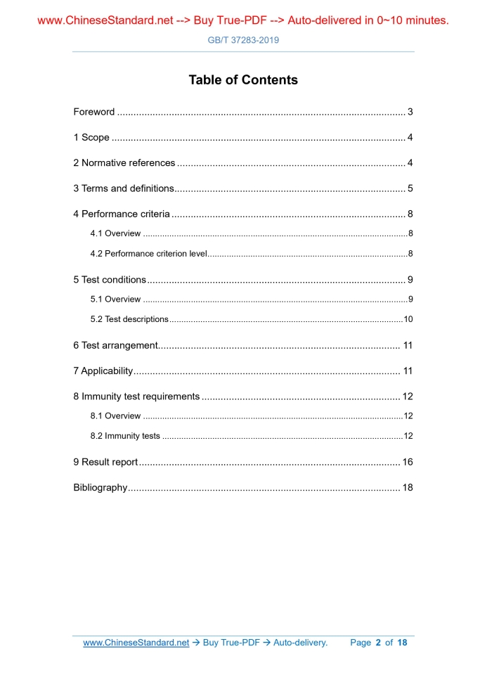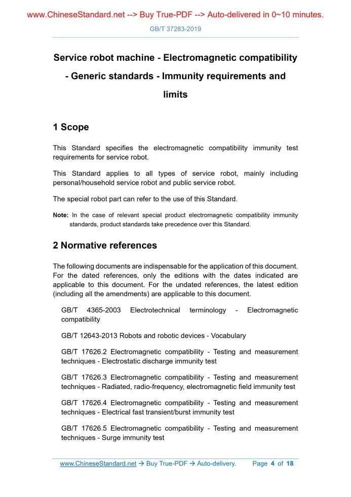 Similar standardsGB/T 37283-2019: Service robot machine - Electromagnetic compatibility - Generic standards - Immunity requirements and limits---This is an excerpt. Full copy of true-PDF in English version (including equations, symbols, images, flow-chart, tables, and figures etc.), auto-downloaded/delivered in 9 seconds, can be purchased online: https://www.ChineseStandard.net/PDF.aspx/GBT37283-2019 NATIONAL STANDARD OF THE PEOPLE’S REPUBLIC OF CHINA ICS 33.100 L 06 Service robot machine - Electromagnetic compatibility - Generic standards - Immunity requirements and limits ISSUED ON: MARCH 25, 2019 IMPLEMENTED ON: OCTOBER 01, 2019 Issued by: State Administration for Market Regulation; Standardization Administration of the PRC. Table of ContentsForeword ... 3 1 Scope ... 4 2 Normative references ... 4 3 Terms and definitions ... 5 4 Performance criteria ... 8 4.1 Overview ... 8 4.2 Performance criterion level ... 8 5 Test conditions ... 9 5.1 Overview ... 9 5.2 Test descriptions ... 10 6 Test arrangement ... 11 7 Applicability ... 11 8 Immunity test requirements ... 12 8.1 Overview ... 12 8.2 Immunity tests ... 12 9 Result report ... 16 Bibliography ... 18 Service robot machine - Electromagnetic compatibility - Generic standards - Immunity requirements and limits1 ScopeThis Standard specifies the electromagnetic compatibility immunity test requirements for service robot. This Standard applies to all types of service robot, mainly including personal/household service robot and public service robot. The special robot part can refer to the use of this Standard. Note: In the case of relevant special product electromagnetic compatibility immunity standards, product standards take precedence over this Standard.2 Normative referencesThe following documents are indispensable for the application of this document. For the dated references, only the editions with the dates indicated are applicable to this document. For the undated references, the latest edition (including all the amendments) are applicable to this document. GB/T 4365-2003 Electrotechnical terminology - Electromagnetic compatibility GB/T 12643-2013 Robots and robotic devices - Vocabulary GB/T 17626.2 Electromagnetic compatibility - Testing and measurement techniques - Electrostatic discharge immunity test GB/T 17626.3 Electromagnetic compatibility - Testing and measurement techniques - Radiated, radio-frequency, electromagnetic field immunity test GB/T 17626.4 Electromagnetic compatibility - Testing and measurement techniques - Electrical fast transient/burst immunity test GB/T 17626.5 Electromagnetic compatibility - Testing and measurement techniques - Surge immunity test GB/T 17626.6 Electromagnetic compatibility - Testing and measurement techniques - Immunity to conducted disturbances, induced by radio- frequency fields GB/T 17626.7 Electromagnetic compatibility - Testing and measurement techniques - General guide on harmonics and interharmonics measurements and instrumentation, for power supply systems and equipment connected thereto GB/T 17626.8 Electromagnetic compatibility (EMC) - Part 8: Testing and measurement techniques - Power frequency magnetic field immunity test GB/T 17626.11 Electromagnetic compatibility - Testing and measurement techniques - Voltage dips, short interruptions and voltage variations immunity tests GB/T 17626.34 Electromagnetic compatibility - Testing and measurement techniques - Voltage dips, short interruptions and voltage variations immunity tests for equipment with mains current more than 16 A per phase3 Terms and definitionsThe terms and definitions defined in GB/T 4365-2003 and GB/T 12643-2013 and the following apply to this document. For ease of use, some of the terms and definitions in GB/T 4365-2003 and GB/T 12643-2013 are repeated below. 3.1 Robot An actuator with two or more programmable axes and a certain degree of autonomy that can move within its environment to perform the intended task. Note 1: The robot includes a control system and a control system interface. Note 2: According to the intended use, the robot can be classified into industrial robot and service robot. [GB/T 12643-2013, definition 2.6] 3.2 Service robot Except industrial automation applications, robots which can perform useful tasks for humans or equipment. Note 1: Industrial automation applications include, but are not limited to, manufacturing, inspection, packaging, and assembly. 3.8 Electromagnetic compatibility; EMC The ability of an equipment or system to function satisfactorily in its electromagnetic environment without introducing intolerable electromagnetic disturbances to anything in that environment. [GB/T 4365-2003, definition 161-01-07] 3.9 Port A specific interface between the equipment and the external electromagnetic environment. Note: In some cases, different ports may be combined. 3.10 Enclosure port The physical interface of the equipment through which electromagnetic fields can radiate or invade. 3.11 Power port The port through which the wires or cables required to power the operation of the equipment or related equipment are connected to the equipment. 3.12 A.c. power port This port is connected to the AC power distribution system outside the equipment, to supply power to the equipment. These power supplies include common or dedicated power supply facilities, as well as equivalent power supplies such as motor-driven generators and uninterrupted power supplies. 3.13 D.c. power port A port used to connect to a low voltage DC power system or energy storage or to another source/load. Note: Such a system may be a photoelectric or fuel cell power system, or a battery. 3.14 Configuration The operating mode and other operating conditions of the EUT. [GB/T 9254-2008, definition 3.9] 3.15 Mobile service robot A service robot based on its own control and movement. The user has reason to require that the equipment used meets this provision. 4.2.3 Performance criterion B After the test, without the intervention o