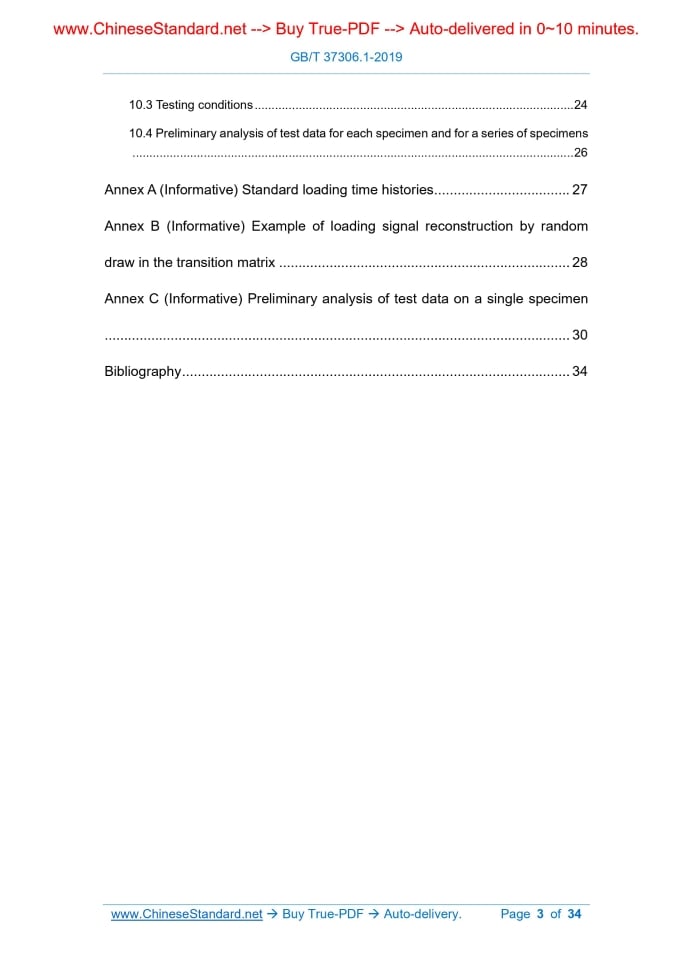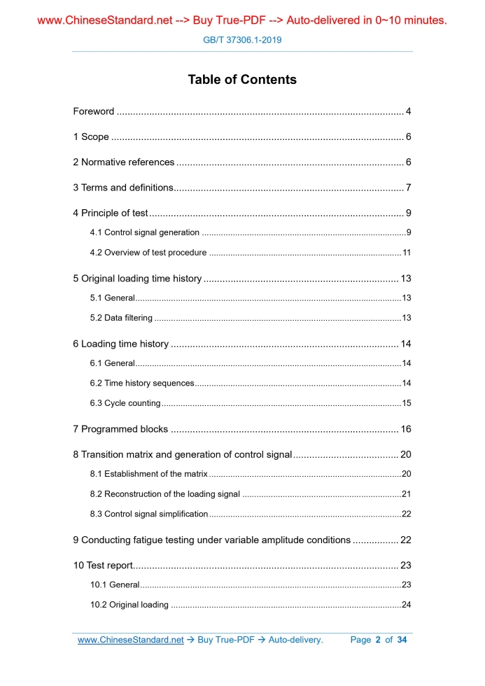 Similar standardsGB/T 37306.1-2019: Metallic materials -- Fatigue testing -- Variable amplitude fatigue testing -- Part 1: General principles, test method and reporting requirements---This is an excerpt. Full copy of true-PDF in English version (including equations, symbols, images, flow-chart, tables, and figures etc.), auto-downloaded/delivered in 9 seconds, can be purchased online: https://www.ChineseStandard.net/PDF.aspx/GBT37306.1-2019 Metallic materials--Fatigue testing--Variable amplitude fatigue testing--Part 1. General principles, test method and reporting requirements ICS 77.040.10 H22 National Standards of People's Republic of China Metal material fatigue test variable amplitude fatigue test Part 1. General, test methods and reporting requirements Part 1. Generalprinciples, testmethodandreportingrequirements (ISO 12110-1.2013, IDT) Published on.2019-03-25 2020-02-01 implementation State market supervision and administration China National Standardization Administration issued Content Foreword I 1 Scope 1 2 Normative references 1 3 Terms and Definitions 1 4 Test principle 3 4.1 Control signal generation 3 4.2 Test Method Overview 3 5 original load time history 5 5.1 General 5 5.2 Data Filtering 5 6 loading time history 5 6.1 General 5 6.2 Time History Sequence 5 6.3 Cycle Counting Method 6 7 program module 6 8 Conversion matrix and its control signal generation 9 8.1 Matrix establishment 9 8.2 Reconstruction of load signals 9 8.3 Control signal simplification 10 9 Variable amplitude fatigue test 10 10 Test report 11 10.1 General 11 10.2 Raw loading 11 10.3 Test conditions 11 10.4 Initial analysis of test data for individual and serial samples 12 Appendix A (informative) Standard loading time history 13 Appendix B (informative) Randomly extracted loading signal reconstruction example in the transformation matrix Appendix C (informative) Initial analysis of test data for individual samples 16 Reference 19 ForewordGB/T 37306 "Metal material fatigue test variable amplitude fatigue test" is divided into two parts. --- Part 1. General, test methods and reporting requirements; --- Part 2. Loop count and related data reduction methods. This part is the first part of GB/T 37306. This part is drafted in accordance with the rules given in GB/T 1.1-2009. This part uses the translation method equivalent to ISO 12110-1.2013 "Metal material fatigue test variable amplitude fatigue test Part 1. General rules, test methods and reporting requirements. The documents of our country that have a consistent correspondence with the international documents referenced in this part are as follows. ---GB/T 3075-2008 Metal material fatigue test axial force control method (ISO 1099.2006, MOD); ---GB/T 6398-2017 fatigue fatigue crack propagation method for metal materials (ISO 12108.2012, MOD); ---GB/T 24176-2009 Metal material fatigue test data statistical program and analysis method (ISO 12107.2003, IDT); ---GB/T 26077-2010 Metal material fatigue test axial strain control method (ISO 12106.2003, MOD); ---GB/T 34104-2017 Metallic material testing machine for testing the coaxiality of the test (ISO 23788.2012, MOD). This section has made the following editorial changes. ---Using the national standard GB/T 37306.2 "Metal materials fatigue test variable amplitude fatigue test Part 2. Cycle count and phase The Data Reduction Method replaces the international standard ISO 12110-2 (see 6.3, Chapter 9). This part was proposed by the China Iron and Steel Association. This part is under the jurisdiction of the National Steel Standardization Technical Committee (SAC/TC183). This section drafted by. Guangzhou University, Shanghai University, Guangdong Entry-Exit Inspection and Quarantine Bureau Inspection and Quarantine Technology Center, Shanghai entry and exit inspection Quarantine Bureau Industrial Products and Raw Materials Testing Technology Center, Shenzhen Wan Testing Equipment Co., Ltd. Drafters of this section. Xu Zhonggen, Wu Yiwen, Wang Hongbin, Zhou Qi, Guo Xuan, Huang Xing. Metal material fatigue test variable amplitude fatigue test Part 1. General, test methods and reporting requirements1 ScopeThis part of GB/T 37306 specifies the general rules for the cyclical fatigue test of laboratory samples for each cycle of amplitude variation. This section specifies and gives general rules for variable amplitude fatigue tests to generate for comparison when considering the typical dispersion of fatigue data. Consistent results. This section is theoretically applicable to strain and force control or loading conditions for controlling fatigue crack growth rate, using this part of the loading Mode, not force - Appropriate protection should be taken when controlling the loading mode. This section applies to single actuator loading mode for single axis loading. The variable loading time history referred to in this section is deterministic, which is why this part deals with variable amplitude loading rather than random loading. The following items are outside the scope of this section. --- Constant amplitude fatigue test with isolated overload or underload phenomenon; ---Experiment of large parts or structural parts; --- Environmental impacts such as corrosion, temperature/time related creep leading to effects on frequency and waveforms; --- Multi-axis loading.2 Normative referencesThe following documents are indispensable for the application of this document. For dated references, only dated versions apply to this article. Pieces. For undated references, the latest edition (including all amendments) applies to this document. ISO 1099 metal material fatigue test axial force control method (Metalicmaterials-Fatiguetesting-Axial Force-controledmethod) ISO 12106 Metal material fatigue test axial strain control method (Metalicmaterials-Fatiguetesting- Axial-strain-controledmethod) ISO 12107 Metal material fatigue test data statistical program and analysis method Metalicmaterials-Fatigue testing-Statisticalplanningandanalysis