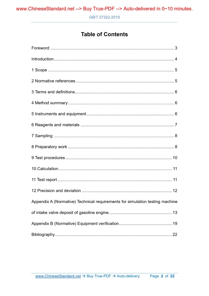 Similar standardsGB/T 37322-2019: Test method for evaluating gasoline cleanliness - Simulation test of intake valve deposit (IVD) of gasoline engine---This is an excerpt. Full copy of true-PDF in English version (including equations, symbols, images, flow-chart, tables, and figures etc.), auto-downloaded/delivered in 9 seconds, can be purchased online: https://www.ChineseStandard.net/PDF.aspx/GBT37322-2019 NATIONAL STANDARD OF THE PEOPLE’S REPUBLIC OF CHINA ICS 75.160.20 E 31 Test method for evaluating gasoline cleanliness - Simulation test of intake valve deposit (IVD) of gasoline engine Issued on. MARCH 25, 2019 Implemented on. OCTOBER 01, 2019 Issued by. State Administration for Market Regulation; Standardization Administration of the PRC. Table of ContentsForeword... 3 Introduction... 4 1 Scope... 5 2 Normative references... 5 3 Terms and definitions... 6 4 Method summary... 6 5 Instruments and equipment... 6 6 Reagents and materials... 7 7 Sampling... 8 8 Preparatory work... 8 9 Test procedures... 10 10 Calculation... 11 11 Test report... 11 12 Precision and deviation... 12 Appendix A (Normative) Technical requirements for simulation testing machine of intake valve deposit of gasoline engine... 13 Appendix B (Normative) Equipment verification... 19 Bibliography... 22ForewordThis Standard is drafted in accordance with the rules given in GB/T 1.1-2009. This Standard was proposed by and shall be under the jurisdiction of National Technical Committee 280 on Petroleum Products and Lubricants of Standardization Administration of China (SAC/TC 280). Responsible drafting organization of this Standard. SINOPEC Research Institute of Petroleum Processing. Participating drafting organizations of this Standard. Lanzhou Weike Petrochemical Instrument Co., Ltd., Shenzhen Academy of Metrology & Quality Inspection, Shandong Chambroad Petrochemicals Co., Ltd., Shenzhen Jimmy Chemical Technology Co., Ltd., Guangdong (Huizhou) Quality Supervision & Testing Centre for Petroleum Products, Lubrizol Additives (Zhuhai) Co., Ltd., Beijing Petroleum Product Quality Supervision and Inspection Center, Tianjin Yuetai Petrochemical Technology Co., Ltd., Zhuhai Laikeli Environmental Protection Technology Co., Ltd. Main drafters of this Standard. Zhang Xin, Chen Yumeng, Zhang Demin, Zhao Yan, Wang Jiqin, Li Ruibo, Wen Huan, Dai Song, Wang Shoucheng, Zhong Liang, Dong Shuangjian, Zhang Jia, Huang Weilin.1 ScopeThis Standard specifies the simulation test method of the intake valve deposit of the inlet jet gasoline engine, is used for evaluating the tendency of the formation of intake valve deposit of gasoline engine. This Standard applies to motor gasoline and motor gasoline detergent. Note. The test conditions for the application of this Standard to motor ethanol gasoline have not been determined. Further investigations of the engine correlation are required.2 Normative referencesThe following documents are indispensable for the application of this document. For the dated references, only the editions with the dates indicated are applicable to this document. For the undated references, the latest edition (including all the amendments) are applicable to this document. GB/T 4756 Method for manual sampling of petroleum liquids GB 17930 Gasoline for motor vehicles GB/T 19230.6 Test method for evaluating gasoline detergent in use - Part 6. Engine dynamometer test method for influence of intake valve and combustion chamber deposit tendencies of gasoline detergent (M111 method)3 Terms and definitionsThe following terms and definitions apply to this document. 3.1 Intake valve deposit Any substance deposited on the surface of intake valve which is generated by fuel, lubricating oil, and additives or which is drawn in from the outside. 3.2 Calibration reference fuel A stable fuel with gasoline characteristics for calibrating the simulation testing machine of intake valve deposit of gasoline engine. 3.4 Deposit accelerant The substance which, in a high-temperature and oxygen environment, causes metal surfaces to rapidly generate deposits on the intake valve similar to those after long-term operation of engine.4 Method summaryUnder the specified test conditions, the quantitative sample is mixed with air through a nozzle and sprayed onto a deposit collector which has been weighed and heated to the test temperature, to simulate the formation of intake valve deposit of gasoline engine.5 Instruments and equipment5.1 Test equipment Simulation testing machine of intake valve deposit of gasoline engine. See Appendix A for technical requirements. 5.2 Test instruments 5.2.4 Micro sample injector. 1000 μL, 250 μL. 5.2.5 Volumetric flask. 300 mL. 5.2.6 Tweezers. 5.2.7 Balance gloves. 5.2.8 Digital camera. no less than 8 million pixels.6 Reagents and materials6.1 Reagents 6.1.1 N-heptane. analytically pure. 6.1.6 Anhydrous ethanol. analytically pure. 6.1.7 Isopropanol. analytically pure. 6.2 Materials 6.2.1 Scouring pad. particle size 240~280. 6.2.2 Water sandpaper. 62 μm. 6.2.3 Deposit accelerant. See the requirements of B.2.1 in Appendix B. 6.2.4 Iron naphthenate diluent. See B.2.2. 6.2.5 Calibration reference fuel. The composition requirements are shown in Table B.1. 6.2.8 Detergent. commercially available detergent. 6.2.9 Paper stick. It is rolled from filter paper and has a diameter of 1.5 mm. 6.2.10 Sponge. 35D.7 Sampling7.1 In accordance with GB/T 4756, a representative gasoline sample is taken. Samples shall be taken and stored in opaque containers, such as dark brown glass bottles and metal cans, to avoid exposure to sunlight or ultraviolet light. 7.2 Before the test, samples shall be placed indoors until being close to room temperature.8 Preparatory work8.1 Preparation of deposit collector 8.1.1 The deposit collector is sanded using a scouring pad dipped in water and a detergent along the length of the collector plate. For used collectors with heavier deposits, USE water sandpaper dipped in water to grind; then USE the scour