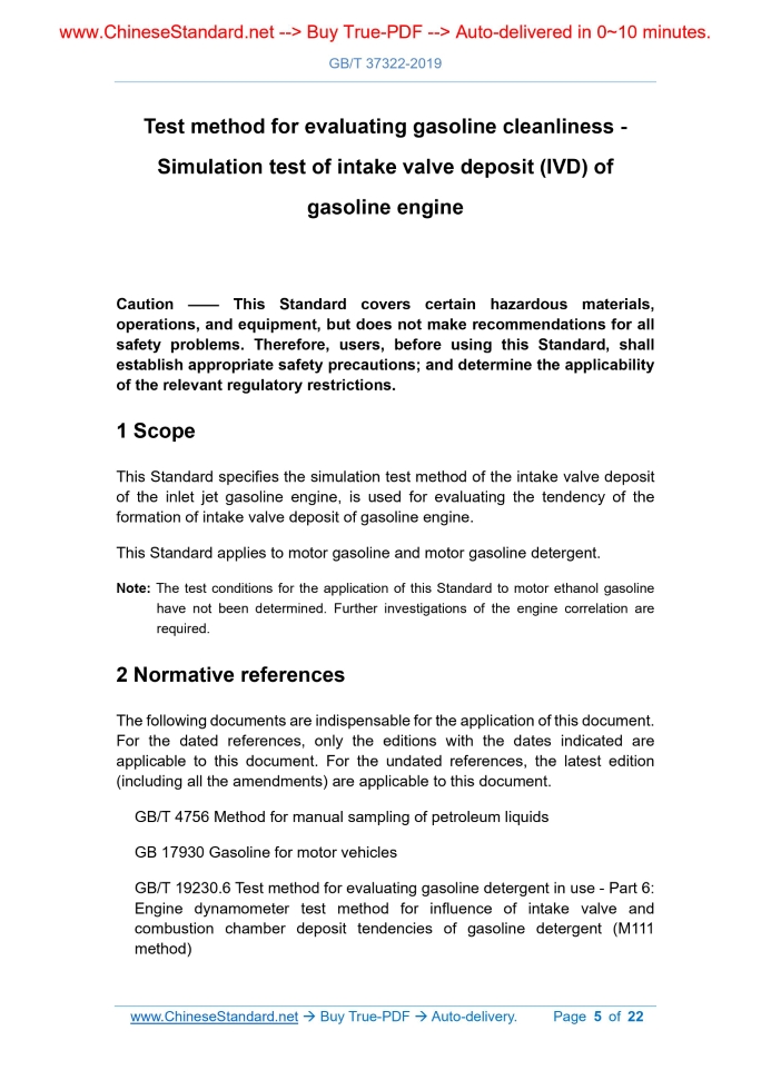 GB/T 37322-2019: Test method for evaluating gasoline cleanliness - Simulation test of intake valve deposit (IVD) of gasoline engine Delivery: 9 seconds. True-PDF full-copy in English & invoice will be downloaded + auto-delivered via email. See step-by-step procedure Status: Valid