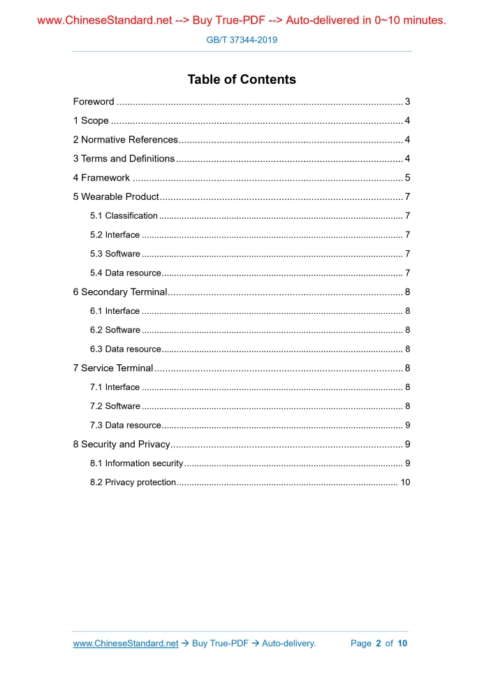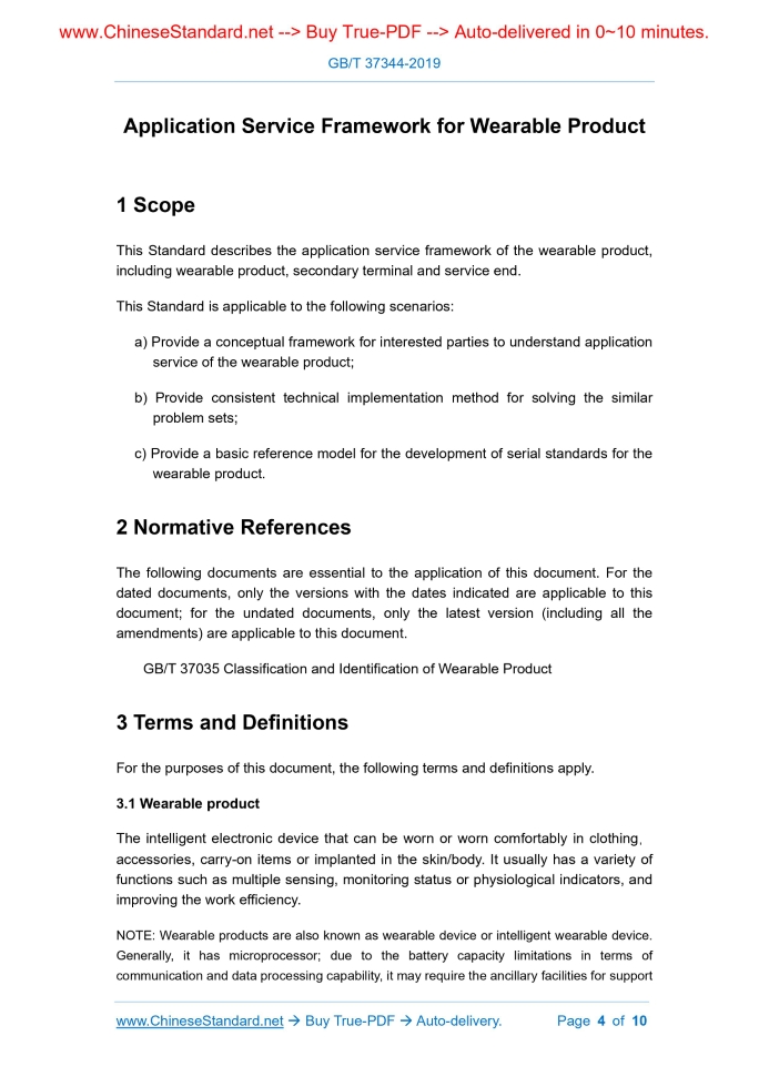 Similar standardsGB/T 37344-2019: Application Service Framework for Wearable Product---This is an excerpt. Full copy of true-PDF in English version (including equations, symbols, images, flow-chart, tables, and figures etc.), auto-downloaded/delivered in 9 seconds, can be purchased online: https://www.ChineseStandard.net/PDF.aspx/GBT37344-2019NATIONAL STANDARD OF THE PEOPLE’S REPUBLIC OF CHINA ICS 35.180 L 70 Application Service Framework for Wearable Product ISSUED ON: MARCH 25, 2019 IMPLEMENTED ON: OCTOBER 01, 2019 Issued by: State Administration for Market Regulation; Standardization Administration of PRC. Table of ContentsForeword ... 3 1 Scope ... 4 2 Normative References ... 4 3 Terms and Definitions ... 4 4 Framework ... 5 5 Wearable Product ... 7 5.1 Classification ... 7 5.2 Interface ... 7 5.3 Software ... 7 5.4 Data resource ... 7 6 Secondary Terminal ... 8 6.1 Interface ... 8 6.2 Software ... 8 6.3 Data resource ... 8 7 Service Terminal ... 8 7.1 Interface ... 8 7.2 Software ... 8 7.3 Data resource ... 9 8 Security and Privacy ... 9 8.1 Information security ... 9 8.2 Privacy protection ... 10 Application Service Framework for Wearable Product1 ScopeThis Standard describes the application service framework of the wearable product, including wearable product, secondary terminal and service end. This Standard is applicable to the following scenarios: a) Provide a conceptual framework for interested parties to understand application service of the wearable product; b) Provide consistent technical implementation method for solving the similar problem sets; c) Provide a basic reference model for the development of serial standards for the wearable product.2 Normative ReferencesThe following documents are essential to the application of this document. For the dated documents, only the versions with the dates indicated are applicable to this document; for the undated documents, only the latest version (including all the amendments) are applicable to this document. GB/T 37035 Classification and Identification of Wearable Product3 Terms and DefinitionsFor the purposes of this document, the following terms and definitions apply. 3.1 Wearable product The intelligent electronic device that can be worn or worn comfortably in clothing, accessories, carry-on items or implanted in the skin/body. It usually has a variety of functions such as multiple sensing, monitoring status or physiological indicators, and improving the work efficiency. NOTE: Wearable products are also known as wearable device or intelligent wearable device. Generally, it has microprocessor; due to the battery capacity limitations in terms of communication and data processing capability, it may require the ancillary facilities for support The security and privacy management span every aspect of the wearable product application service.5 Wearable Product5.1 Classification The wearable product can be classified according to GB/T 37035. Similar wearable products can be implemented with the same or similar application service framework; while different types of wearable products have large differences. 5.2 Interface The wearable product interface is used for data exchange between the wearable product and the external device, including network interface, hardware device interface, driver software interface, etc.: a) Network interface: used to connect to the internet, local area network, personal area network, and the like networks; b) Hardware device interface: used to connect to various components such as sensor, actuator, etc.; c) Driver software interface: used to provide hardware resource access to the operating system. 5.3 Software The wearable product software includes: a) System software: the operating system built into the wearable product and the application and tools provided with the device; providing the device resource management and application software management of the wearable product; b) Application software: realizing the functions of the wearable product terminal such as data collection, human-computer interaction etc.; it can be distributed to the wearable product through the application service and application store. 5.4 Data resource The data resource processed by the wearable product includes: a) Original data: data collected by the wearable product; b) Pre-processed data: data from the wearable product that preprocesses the original data; 7.3 Data resource The services terminal processes the pre-processed data from the wearable product or secondary terminal, and forms processed data.8 Security and Privacy8.1 Information security The hardware, firmware and system software of wearable product shall take security mechanisms to ensure proper operation and maintenance of the system, and provide the necessary security support for the software. Through different technical means and security measures, construct the security protection system for the wearable product application service; implement the security protection covering the hardware and software from 4 aspects such as network security, host security, application security and data security, ensuring the security of the wearable product application service. a) Network security: through the network security technology, ensure the normal operation of data processing, storage and maintenance. b) Host security: through the means of security hardening of the operating system in the device, ensuring the normal operation of the node. NOTE: Typical host security mechanism shall include: hardware encryption and decryption engine, secure storage of the information, trusted execution environment, secure starting, trusted storage root, trusted authentication root, application source authentication, application installation control, rights management, system log, security service, security service API, system security upgrade, etc. c) Application security: including behavioral security and business security, thereof: 1) Behavioral security means that the application 