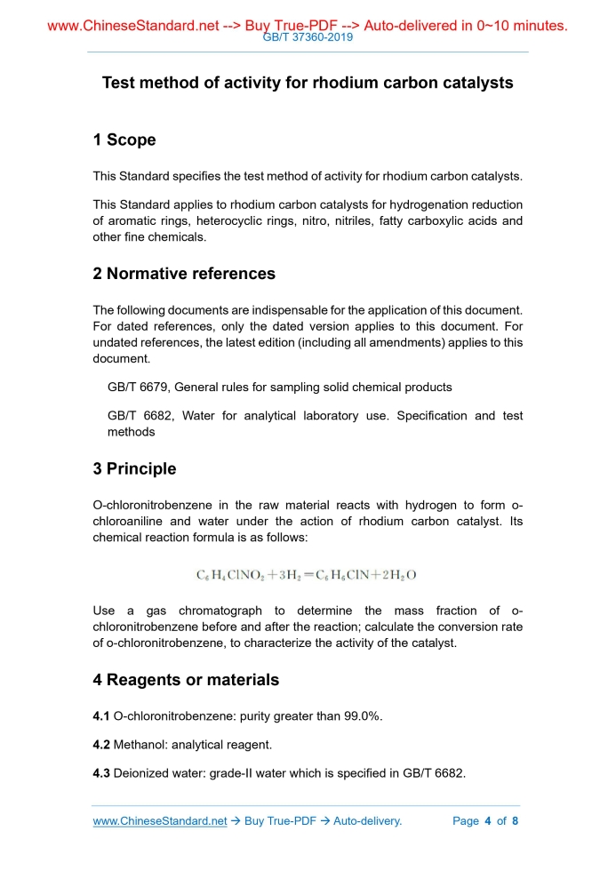 Similar standardsGB/T 37360-2019: Test method of activity for rhodium carbon catalysts---This is an excerpt. Full copy of true-PDF in English version (including equations, symbols, images, flow-chart, tables, and figures etc.), auto-downloaded/delivered in 9 seconds, can be purchased online: https://www.ChineseStandard.net/PDF.aspx/GBT37360-2019NATIONAL STANDARD OF THE PEOPLE’S REPUBLIC OF CHINA ICS 71.100.99 G 74 Test method of activity for rhodium carbon catalysts ISSUED ON: MARCH 25, 2019 IMPLEMENTED ON: FEBRUARY 01, 2020 Issued by: State Administration for Market Regulation; Standardization Administration of the People’s Republic of China. Table of ContentsForeword ... 3 1 Scope ... 4 2 Normative references ... 4 3 Principle ... 4 4 Reagents or materials ... 4 5 Test device ... 5 6 Sample ... 6 7 Determination procedures ... 6 8 Test data processing ... 8 Test method of activity for rhodium carbon catalysts1 ScopeThis Standard specifies the test method of activity for rhodium carbon catalysts. This Standard applies to rhodium carbon catalysts for hydrogenation reduction of aromatic rings, heterocyclic rings, nitro, nitriles, fatty carboxylic acids and other fine chemicals.2 Normative referencesThe following documents are indispensable for the application of this document. For dated references, only the dated version applies to this document. For undated references, the latest edition (including all amendments) applies to this document. GB/T 6679, General rules for sampling solid chemical products GB/T 6682, Water for analytical laboratory use. Specification and test methods3 PrincipleO-chloronitrobenzene in the raw material reacts with hydrogen to form o- chloroaniline and water under the action of rhodium carbon catalyst. Its chemical reaction formula is as follows: Use a gas chromatograph to determine the mass fraction of o- chloronitrobenzene before and after the reaction; calculate the conversion rate of o-chloronitrobenzene, to characterize the activity of the catalyst.4 Reagents or materials4.1 O-chloronitrobenzene: purity greater than 99.0%. 4.2 Methanol: analytical reagent. 4.3 Deionized water: grade-II water which is specified in GB/T 6682. forbidden on the site; preventive facilities such as necessary fire extinguishing equipment and exhaust equipment shall be equipped; it is strictly forbidden to carry out disassembly operation of reactor under pressure. This Standard does not reveal all possible safety issues; users shall use it strictly in accordance with relevant regulations, and have the responsibility to take appropriate safety and health measures. 7.1 Filling of the reactor Add 30.0 g of o-chloronitrobenzene, 150 mL of methanol, and catalyst samples (see 6.3) to the clean and dry reactor in order; cover the kettle lid; tighten the nuts evenly; then, connect it to the system. 7.2 Leakage test Open the nitrogen valve; introduce nitrogen into the system; boost the system to 1.00 MPa; close the inlet and outlet valves of the system. If the pressure drop is less than 0.05 MPa within 30 min, the system is considered to be sealed. Open the system outlet valve to reduce the pressure of the system to normal pressure; insert the temperature measuring thermocouple into the thermowell. 7.3 Gas replacement and activity determination Use nitrogen to replace the system for 3 times; then, exhaust and reduce the pressure to normal pressure. Switch to hydrogen and replace for 3 times; then, exhaust and reduce the pressure to normal pressure. Warm and heat the reactor. When the temperature of the reactor is raised to 75°C, increase the system pressure to 1.00 MPa. Control and maintain the reactor pressure at 1.00 MPa, the temperature at 75°C, and the stirring speed at 1 000 r/min. After 1 hour, end the test. 7.4 Power-off Turn off the hydrogen and turn on the cooling water; after the temperature of the reactor drops to below 40°C, release the pressure. Use nitrogen to replace the system for 3 times; perform sampling and analysis; use deionized water to clean the reactor body. 7.5 Determination of o-chloronitrobenzene mass fraction 7.5.1 Chromatograph operating conditions Chromatographic column: DB-1 (30 m × 0.25 mm × 0.25 μm). Nitrogen flow: 30.0 mL/min. Hydrogen flow: 40.0 mL/min. ......Source: Above contents are excerpted from the full-copy PDF -- translated/reviewed by: www.ChineseStandard.net / Wayne Zheng et al. Tips & Frequently Asked Questions:Question 1: How long will the true-PDF of English version of GB/T 37360-2019 be delivered?Answer: The full copy PDF of English version of GB/T 37360-2019 can be downloaded in 9 seconds, and it will also be emailed to you in 9 seconds (double mechanisms to ensure the delivery reliably), with PDF-invoice.Question 2: Can I share the purchased PDF of GB/T 37360-2019_English with my colleagues?Answer: Yes. The purchased PDF of GB/T 37360-2019_English will be deemed to be sold to your employer/organization who actually paid for it, including your colleagues and your employer's intranet.Question 3: Does the price include tax/VAT?Answer: Yes. Our tax invoice, downloaded/delivered in 9 seconds, includes all tax/VAT and complies with 100+ countries' tax regulations (tax exempted in 100+ countries) -- See Avoidance of Double Taxation Agreements (DTAs): List of DTAs signed between Singapore and 100+ countriesQuestion 4: Do you accept my currency other than USD?Answer: Yes. www.ChineseStandard.us -- GB/T 37360-2019 -- Click this link and select your country/currency to pay, the exact amount in your currency will be printed on the invoice. Full PDF will also be downloaded/emailed in 9 seconds.How to buy and download a true PDF of English version of GB/T 37360-2019?A step-by-step guide to download PDF of GB/T 37360-2019_EnglishStep 1: Visit website https://www.ChineseStandard.net (Pay in USD), or https://www.ChineseStandard.us (Pay in any currencies such as Euro, KRW, JPY, AUD).Step 2: Search keyword "GB/T 37360-2019". Step 3: Click "Add to Car