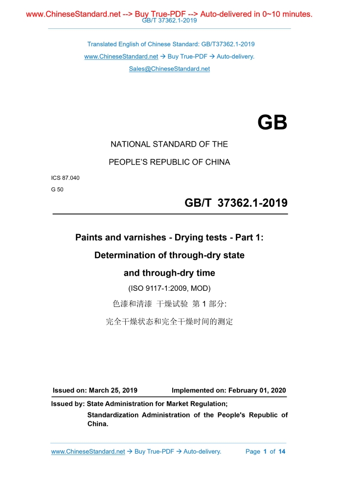 GB/T 37362.1-2019: Paints and varnishes -- Drying tests -- Part 1: Determination of through-dry state and through-dry time Delivery: 9 seconds. True-PDF full-copy in English & invoice will be downloaded + auto-delivered via email. See step-by-step procedure Status: Valid