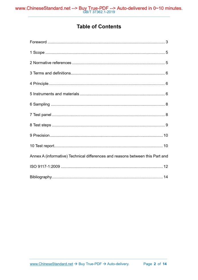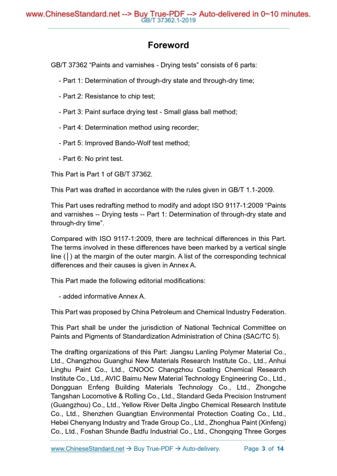Similar standardsGB/T 37362.1-2019: Paints and varnishes -- Drying tests -- Part 1: Determination of through-dry state and through-dry time---This is an excerpt. Full copy of true-PDF in English version (including equations, symbols, images, flow-chart, tables, and figures etc.), auto-downloaded/delivered in 9 seconds, can be purchased online: https://www.ChineseStandard.net/PDF.aspx/GBT37362.1-2019 NATIONAL STANDARD OF THE PEOPLE’S REPUBLIC OF CHINA ICS 87.040 G 50 Paints and varnishes - Drying tests - Part 1: Determination of through-dry state and through-dry time (ISO 9117-1:2009, MOD) ISSUED ON: MARCH 25, 2019 IMPLEMENTED ON: FEBRUARY 01, 2020 Issued by: State Administration for Market Regulation; Standardization Administration of the People's Republic of China. Table of ContentsForeword ... 3 1 Scope ... 5 2 Normative references ... 5 3 Terms and definitions ... 6 4 Principle ... 6 5 Instruments and materials ... 6 6 Sampling ... 8 7 Test panel ... 8 8 Test steps ... 9 9 Precision ... 10 10 Test report ... 10 Annex A (informative) Technical differences and reasons between this Part and ISO 9117-1:2009 ... 12 Bibliography ... 14ForewordGB/T 37362 “Paints and varnishes - Drying tests” consists of 6 parts: - Part 1: Determination of through-dry state and through-dry time; - Part 2: Resistance to chip test; - Part 3: Paint surface drying test - Small glass ball method; - Part 4: Determination method using recorder; - Part 5: Improved Bando-Wolf test method; - Part 6: No print test. This Part is Part 1 of GB/T 37362. This Part was drafted in accordance with the rules given in GB/T 1.1-2009. This Part uses redrafting method to modify and adopt ISO 9117-1:2009 “Paints and varnishes -- Drying tests -- Part 1: Determination of through-dry state and through-dry time”. Compared with ISO 9117-1:2009, there are technical differences in this Part. The terms involved in these differences have been marked by a vertical single line (│) at the margin of the outer margin. A list of the corresponding technical differences and their causes is given in Annex A. This Part made the following editorial modifications: - added informative Annex A. This Part was proposed by China Petroleum and Chemical Industry Federation. This Part shall be under the jurisdiction of National Technical Committee on Paints and Pigments of Standardization Administration of China (SAC/TC 5). The drafting organizations of this Part: Jiangsu Lanling Polymer Material Co., Ltd., Changzhou Guanghui New Materials Research Institute Co., Ltd., Anhui Linghu Paint Co., Ltd., CNOOC Changzhou Coating Chemical Research Institute Co., Ltd., AVIC Baimu New Material Technology Engineering Co., Ltd., Dongguan Enfeng Building Materials Technology Co., Ltd., Zhongche Tangshan Locomotive & Rolling Co., Ltd., Standard Geda Precision Instrument (Guangzhou) Co., Ltd., Yellow River Delta Jingbo Chemical Research Institute Co., Ltd., Shenzhen Guangtian Environmental Protection Coating Co., Ltd., Hebei Chenyang Industry and Trade Group Co., Ltd., Zhonghua Paint (Xinfeng) Co., Ltd., Foshan Shunde Badfu Industrial Co., Ltd., Chongqing Three Gorges Paints and varnishes - Drying tests - Part 1: Determination of through-dry state and through-dry time1 ScopeThis Part of GB/T 37362 specifies the test methods for determining whether single coating, composite coating system of paints, varnishes or related products reach the through-dry state and through-dry time required after the specified drying time under standard conditions. This Part is applicable to the determinations of through-dry state and through- dry time required for single coating, composite coating system of paints, varnishes or related products.2 Normative referencesThe following referenced documents are indispensable for the application of this document. For dated references, only the edition cited applies. For undated references, the latest edition of the referenced document (including any amendments) applies. GB/T 3186, Paints varnishes and raw materials for paints and varnishes - Sampling (GB/T 3186-2006, ISO 15528:2000, IDT) GB/T 6031, Rubber, vulcanized or thermoplastic - Determination of hardness (hardness between 10 IRHD and 100 IRHD) (GB/T 6031-2017, ISO 48:2010, IDT) GB/T 9271, Paints and varnishes standard panels for testing (GB/T 9271- 2008, ISO 1514:2004, MOD) GB/T 9278, Temperatures and humidities for conditioning and testing of paint specimens (GB/T 9278-2008, ISO 3270:1984, IDT) GB/T 13452.2, Paints and varnishes - Determination of film thickness (GB/T 13452.2-2008, ISO 2808:2007, IDT) GB/T 20777, Paints and varnishes - Examination and preparation of samples for testing (GB/T 20777-2006, ISO 1513:1992, IDT) 1 - press column; 2 - clamp; 3 - tie rod for rotating the column head; 4 - wire mesh; 5 - double-sided tape; 6 - rubber disc. Figure 2 -- Detailed diagram of the assembly of the column head 5.2 Rubber disc: diameter is (22 ± 1) mm, thickness is (5 ± 0.5) mm and hardness is (50 ± 5) IRHD scale (see GB/T 6031). NOTE: It is recommended to use the rubber disc specified in GB/T 9273. 5.3 Wire mesh: it is woven from monofilament polyamide; the smallest size is 100mm × 100mm. the diameter of the monofilament is (0.12±0.01) mm and the pore diameter is about 0.2 mm. 5.4 Load: the total mass is (1500±10) g. 5.5 Stopwatch: the accuracy is 0.1 s.6 SamplingAccording to the provisions of GB/T 3186, take a representative sample of the test product (or each product in a multi-coat system). According to the provisions of GB/T 20777, check and prepare the test sample.7 Test panel7.1 Substrate Select 3 test panels of the type specified in GB/T 9271 as the substrate (6 pieces are required if the through-dry state and the through-dry time are simultaneously measured). And make sure that the selected substrate is as consistent as possible with the actual application. 7.2 Processing and painting Process the substrate according to the provisions of GB/T 9271. Apply the sample or system