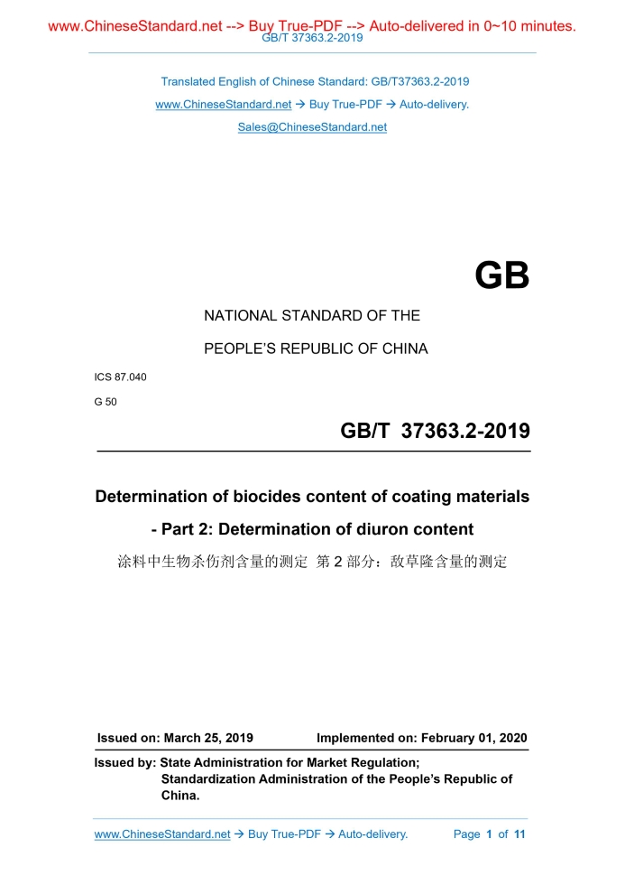 GB/T 37363.2-2019: Determination of biocides content of coating materials - Part 2: Determination of diuron content Delivery: 9 seconds. True-PDF full-copy in English & invoice will be downloaded + auto-delivered via email. See step-by-step procedure Status: Valid