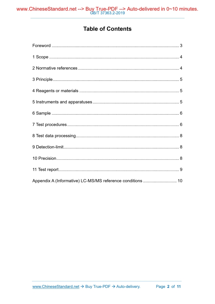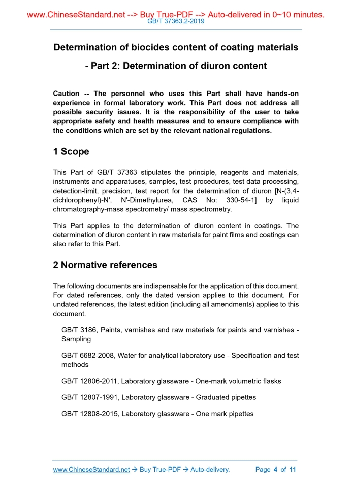 Similar standardsGB/T 37363.2-2019: Determination of biocides content of coating materials - Part 2: Determination of diuron content---This is an excerpt. Full copy of true-PDF in English version (including equations, symbols, images, flow-chart, tables, and figures etc.), auto-downloaded/delivered in 9 seconds, can be purchased online: https://www.ChineseStandard.net/PDF.aspx/GBT37363.2-2019 NATIONAL STANDARD OF THE PEOPLE’S REPUBLIC OF CHINA ICS 87.040 G 50 Determination of biocides content of coating materials - Part 2: Determination of diuron content ISSUED ON: MARCH 25, 2019 IMPLEMENTED ON: FEBRUARY 01, 2020 Issued by: State Administration for Market Regulation; Standardization Administration of the People’s Republic of China. Table of ContentsForeword ... 3 1 Scope ... 4 2 Normative references ... 4 3 Principle ... 5 4 Reagents or materials ... 5 5 Instruments and apparatuses ... 5 6 Sample ... 6 7 Test procedures ... 6 8 Test data processing ... 8 9 Detection-limit ... 8 10 Precision ... 8 11 Test report ... 9 Appendix A (Informative) LC-MS/MS reference conditions ... 10 Determination of biocides content of coating materials - Part 2: Determination of diuron content Caution -- The personnel who uses this Part shall have hands-on experience in formal laboratory work. This Part does not address all possible security issues. It is the responsibility of the user to take appropriate safety and health measures and to ensure compliance with the conditions which are set by the relevant national regulations.1 ScopeThis Part of GB/T 37363 stipulates the principle, reagents and materials, instruments and apparatuses, samples, test procedures, test data processing, detection-limit, precision, test report for the determination of diuron [N-(3,4- dichlorophenyl)-N', N'-Dimethylurea, CAS No: 330-54-1] by liquid chromatography-mass spectrometry/ mass spectrometry. This Part applies to the determination of diuron content in coatings. The determination of diuron content in raw materials for paint films and coatings can also refer to this Part.2 Normative referencesThe following documents are indispensable for the application of this document. For dated references, only the dated version applies to this document. For undated references, the latest edition (including all amendments) applies to this document. GB/T 3186, Paints, varnishes and raw materials for paints and varnishes - Sampling GB/T 6682-2008, Water for analytical laboratory use - Specification and test methods GB/T 12806-2011, Laboratory glassware - One-mark volumetric flasks GB/T 12807-1991, Laboratory glassware - Graduated pipettes GB/T 12808-2015, Laboratory glassware - One mark pipettes Note: Other pipetting equipment, such as piston-type pipette, that meets the precision requirements, can also be used. 5.7 One mark pipette: suitable specifications, grade-A of GB/T 12808-2015. Note: Other pipetting equipment, such as piston-type pipettes, that meets the precision requirements, can also be used. 6 Sample Sampling according to the provisions of GB/T 3186, or sampling according to the agreed method; the sampling amount is determined according to the inspection needs.7 Test procedures7.1 Parallel test Perform two tests in parallel. 7.2 Sample preparation Stir the sample evenly (if the sample is solid, use a smashing device to pulverize the sample at room temperature, and use a stainless steel metal sieve (4.6) whose pore size is 0.5 mm to sieve); weigh about 2.5 g of the sample, accurate to 0.1 mg; place in a 25 mL volumetric flask (5.5); record the sample mass m; use methanol (4.1) to dilute it to the mark; shake it sufficiently to obtain the maximum dispersion of the sample; make a sample solution; record the constant volume V. Use ultrasonic extraction instrument (5.2) for ultrasonic extraction for 20 min; then, transfer about 7 mL of the above solution into a centrifuge tube (the volume of the to-be-centrifuged solution can also be adjusted according to the actual situation); centrifuge under the condition that the temperature of the centrifuge cavity does not exceed 25°C, until the supernatant A appears in the upper layer. If the centrifugation effect is not good and the layering cannot be performed effectively, increase the rotating speed or increase the centrifugation time appropriately. Use a 0.22 μm microporous membrane (4.5) to filter he supernatant A; retain the filtrate B for the determination of the extraction solution (7.7). When other solvents are selected as the extraction solvent, use a one mark pipette (5.7) to transfer 1 mL of supernatant A into a 10 mL volumetric flask (5.5); use methanol (4.1) to fix-volume to the mark. Take an appropriate amount of the above solution; use a 0.22 μm microporous membrane (4.5) to filter; retain the filtrate C for determination of the extraction solution (7.7). 7.3 Blank test Perform the blank test in parallel with the test; use the same test procedures; take all reagents in the same amount, but without adding samples. 7.4 LC-MS/MS test conditions Select appropriate test conditions according to the performance of the used LC- MS/MS and the actual situation of the sample. Because the test results depend on the used instrument, so, general parameters for chromatographic and mass spectrometric analysis cannot be given. The parameters which are listed in A.1 in Appendix A have been proven to be suitable for testing. 7.5 Preparation of standard working solution Weigh about 0.02 g of diuron (4.4), accurate to 0.1 mg, in a 100 mL volumetric flask; use methanol (4.1) to fix-volume to the mark. Then, adopt the stepwise dilution method; use a graduated pipette (5.6) or a one mark pipette (5.7) to transfer the above solution into a suitable volumetric flask (5.5); use methanol (4.1) to dilute the above solution to diuron standard working solution of applicable concentration. Note 1: The concentration range of diuron standard working solution can be adjusted according to the used instrument