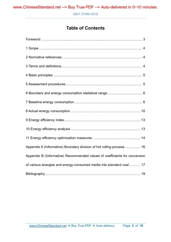 Similar standardsGB/T 37390-2019: Guides for energy efficiency assessment of hot rolling process---This is an excerpt. Full copy of true-PDF in English version (including equations, symbols, images, flow-chart, tables, and figures etc.), auto-downloaded/delivered in 9 seconds, can be purchased online: https://www.ChineseStandard.net/PDF.aspx/GBT37390-2019NATIONAL STANDARD OF THE PEOPLE’S REPUBLIC OF CHINA ICS 77.010 H 04 Guides for energy efficiency assessment of hot rolling process ISSUED ON: MARCH 25, 2019 IMPLEMENTED ON: FEBRUARY 01, 2020 Issued by: State Administration for Market Regulation; Standardization Administration of the PRC. Table of ContentsForeword ... 3 1 Scope ... 4 2 Normative references ... 4 3 Terms and definitions ... 4 4 Basic principles ... 5 5 Assessment procedures ... 5 6 Boundary and energy consumption statistical range ... 6 7 Baseline energy consumption ... 6 8 Actual energy consumption ... 10 9 Energy efficiency index ... 13 10 Energy efficiency analysis ... 13 11 Energy efficiency optimization measures ... 14 Appendix A (Informative) Boundary division of hot rolling process ... 16 Appendix B (Informative) Recommended values of coefficients for conversion of various energies and energy-consumed media into standard coal ... 17 Bibliography ... 19 Guides for energy efficiency assessment of hot rolling process1 ScopeThis Standard specifies the terms and definitions, basic principles, assessment procedures, boundary and energy consumption statistical range, baseline energy consumption, actual energy consumption, energy efficiency index, energy efficiency analysis, and energy efficiency optimization measures for the energy efficiency assessment of hot rolling process. This Standard applies to energy efficiency assessment and energy saving potential analysis of hot rolling process in iron and steel enterprises.2 Normative referencesThe following documents are indispensable for the application of this document. For the dated references, only the editions with the dates indicated are applicable to this document. For the undated references, the latest edition (including all the amendments) are applicable to this document. GB 17167 General principle for equipping and managing of the measuring instrument of energy in organization of energy using GB/T 21368 Specification for equipping and managing of measuring instrument of energy in the iron and steel industry GB/T 23331 Energy management systems - Requirements GB/T 28924 Guides for calculating energy efficiency index of an iron and steel enterprise YB/T 4662 Steel slag - Determination of potassium oxide and sodium oxide content3 Terms and definitionsThe terms and definitions defined in GB/T 23331, GB/T 28924, and YB/T 4662 apply to this document.6 Boundary and energy consumption statistical range6.1 Process boundary division The boundary of hot rolling process starts from the input of raw materials (casting blank), energy, and energy-consumed medium, and ends with the output of final product (rolled material) and steam for external supply. See Appendix A for the boundary division of hot rolling process. 6.2 Energy consumption statistical range The energy consumption statistical range of hot rolling process is as follows: a) Hot rolling production process, including raw material preparation, heating, rolling, cooling, and finishing, etc.; b) Contain auxiliary production systems such as machine repair, inspection, testing, measuring, transportation, production management and dispatching systems, heating or cooling, lighting, warehousing; c) Contain the amount of loss of various energies in hot rolling process interface. The above-mentioned energy consumption statistical range shall deduct the steam recovered and externally-supplied; and does not include the energy consumed by facilities for life purposes (such as canteen, lounge, etc.) which are not related to production.7 Baseline energy consumption7.1 Baseline conditions 7.1.1 Baseline conditions are a number of measurable factors which have a greater impact on the baseline energy consumption; and can be classified into objective factors and subjective factors. 7.1.2 The objective factors refer to factors which are affected by the inherent conditions outside the process boundary and are not controllable within the process. They mainly refer to raw material conditions, product conditions, geographical environment, climate temperature, etc. 7.1.3 The subjective factors are factors related to the enterprise’s own management level, technical equipment level, operation level, etc. Through the ways such as technical equipment optimization and management level Field data acquisition includes but is not limited to the following contents. The process parameters shall take the data under stable production conditions. The amount of change shall take the average of statistical reporting period: a) Yield information, including production scale, quantity of qualified products during the statistical reporting period, etc.; b) Raw material conditions, including raw material cross-section specifications, steel grade, composition, etc.; c) Product conditions, including product type, specifications, dimensions, etc.; d) Consumption situation of energy and energy-consumed medium, such as consumption of circulating water, electricity, compressed air, nitrogen, natural gas, coal gas, etc.; e) Energy recovery situation, such as steam recovery amount, pressure, temperature, etc.; f) Parameters of main energy-consumed units and important energy- consumed equipment, such as the main parameters of heating furnace, rolling mill, water treatment, and other systems; g) Ambient temperature. 8.2 Principles of value selection for the coefficient for conversion of energy and energy-consumed medium into standard coal 8.2.1 The fuel energy actually consumed by the energy use organization shall, based on its low calorific value, be converted into the standard coal quantity. For those non-actually meas