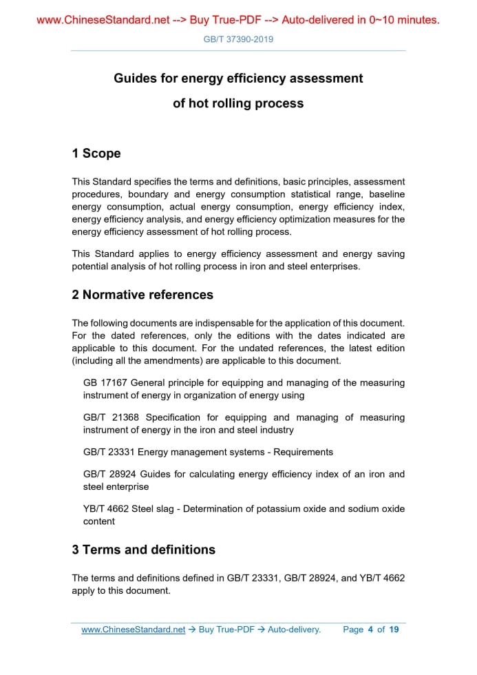 Similar standardsGB/T 37390-2019: Guides for energy efficiency assessment of hot rolling process---This is an excerpt. Full copy of true-PDF in English version (including equations, symbols, images, flow-chart, tables, and figures etc.), auto-downloaded/delivered in 9 seconds, can be purchased online: https://www.ChineseStandard.net/PDF.aspx/GBT37390-2019NATIONAL STANDARD OF THE PEOPLE’S REPUBLIC OF CHINA ICS 77.010 H 04 Guides for energy efficiency assessment of hot rolling process ISSUED ON: MARCH 25, 2019 IMPLEMENTED ON: FEBRUARY 01, 2020 Issued by: State Administration for Market Regulation; Standardization Administration of the PRC. Table of ContentsForeword ... 3 1 Scope ... 4 2 Normative references ... 4 3 Terms and definitions ... 4 4 Basic principles ... 5 5 Assessment procedures ... 5 6 Boundary and energy consumption statistical range ... 6 7 Baseline energy consumption ... 6 8 Actual energy consumption ... 10 9 Energy efficiency index ... 13 10 Energy efficiency analysis ... 13 11 Energy efficiency optimization measures ... 14 Appendix A (Informative) Boundary division of hot rolling process ... 16 Appendix B (Informative) Recommended values of coefficients for conversion of various energies and energy-consumed media into standard coal ... 17 Bibliography ... 19 Guides for energy efficiency assessment of hot rolling process1 ScopeThis Standard specifies the terms and definitions, basic principles, assessment procedures, boundary and energy consumption statistical range, baseline energy consumption, actual energy consumption, energy efficiency index, energy efficiency analysis, and energy efficiency optimization measures for the energy efficiency assessment of hot rolling process. This Standard applies to energy efficiency assessment and energy saving potential analysis of hot rolling process in iron and steel enterprises.2 Normative referencesThe following documents are indispensable for the application of this document. For the dated references, only the editions with the dates indicated are applicable to this document. For the undated references, the latest edition (including all the amendments) are applicable to this document. GB 17167 General principle for equipping and managing of the measuring instrument of energy in organization of energy using GB/T 21368 Specification for equipping and managing of measuring instrument of energy in the iron and steel industry GB/T 23331 Energy management systems - Requirements GB/T 28924 Guides for calculating energy efficiency index of an iron and steel enterprise YB/T 4662 Steel slag - Determination of potassium oxide and sodium oxide content3 Terms and definitionsThe terms and definitions defined in GB/T 23331, GB/T 28924, and YB/T 4662 apply to this document.6 Boundary and energy consumption statistical range6.1 Process boundary division The boundary of hot rolling process starts from the input of raw materials (casting blank), energy, and energy-consumed medium, and ends with the output of final product (rolled material) and steam for external supply. See Appendix A for the boundary division of hot rolling process. 6.2 Energy consumption statistical range The energy consumption statistical range of hot rolling process is as follows: a) Hot rolling production process, including raw material preparation, heating, rolling, cooling, and finishing, etc.; b) Contain auxiliary production systems such as machine repair, inspection, testing, measuring, transportation, production management and dispatching systems, heating or cooling, lighting, warehousing; c) Contain the amount of loss of various energies in hot rolling process interface. The above-mentioned energy consumption statistical range shall deduct the steam recovered and externally-supplied; and does not include the energy consumed by facilities for life purposes (such as canteen, lounge, etc.) which are not related to production.7 Baseline energy consumption7.1 Baseline conditions 7.1.1 Baseline conditions are a number of measurable factors which have a greater impact on the baseline energy consumption; and can be classified into objective factors and subjective factors. 7.1.2 The objective factors refer to factors which are affected by the inherent conditions outside the process boundary and are not controllable within the process. They mainly refer to raw material conditions, product conditions, geographical environment, climate temperature, etc. 7.1.3 The subjective factors are factors related to the enterprise’s own management level, technical equipment level, operation level, etc. Through the ways such as technical equipment optimization and management level Field data acquisition includes but is not limited to the following contents. The process parameters shall take the data under stable production conditions. The amount of change shall take the average of statistical reporting period: a) Yield information, including production scale, quantity of qualified products during the statistical reporting period, etc.; b) Raw material conditions, including raw material cross-section specifications, steel grade, composition, etc.; c) Product conditions, including product type, specifications, dimensions, etc.; d) Consumption situation of energy and energy-consumed medium, such as consumption of circulating water, electricity, compressed air, nitrogen, natural gas, coal gas, etc.; e) Energy recovery situation, such as steam recovery amount, pressure, temperature, etc.; f) Parameters of main energy-consumed units and important energy- consumed equipment, such as the main parameters of heating furnace, rolling mill, water treatment, and other systems; g) Ambient temperature. 8.2 Principles of value selection for the coefficient for conversion of energy and energy-consumed medium into standard coal 8.2.1 The fuel energy actually consumed by the energy use organization shall, based on its low calorific value, be converted into the standard coal quantity. For those non-actually meas