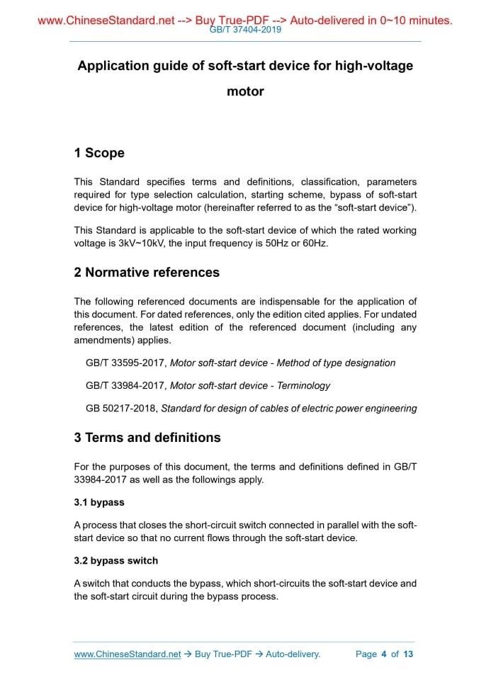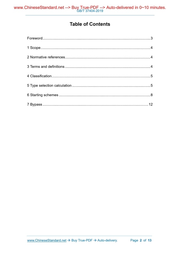Similar standardsGB/T 37404-2019: Application guide of soft-start device for high-voltage motor---This is an excerpt. Full copy of true-PDF in English version (including equations, symbols, images, flow-chart, tables, and figures etc.), auto-downloaded/delivered in 9 seconds, can be purchased online: https://www.ChineseStandard.net/PDF.aspx/GBT37404-2019GB NATIONAL STANDARD OF THE PEOPLE’S REPUBLIC OF CHINA ICS 29.200 K 46 Application guide of soft-start device for high-voltage motor ISSUED ON: MAY 10, 2019 IMPLEMENTED ON: DECEMBER 01, 2019 Issued by: State Administration for Market Regulation; Standardization Administration of the People's Republic of China. Table of ContentsForeword ... 3 1 Scope ... 4 2 Normative references ... 4 3 Terms and definitions ... 4 4 Classification ... 5 5 Type selection calculation ... 5 6 Starting schemes ... 8 7 Bypass ... 12 Application guide of soft-start device for high-voltage motor1 ScopeThis Standard specifies terms and definitions, classification, parameters required for type selection calculation, starting scheme, bypass of soft-start device for high-voltage motor (hereinafter referred to as the “soft-start device”). This Standard is applicable to the soft-start device of which the rated working voltage is 3kV~10kV, the input frequency is 50Hz or 60Hz.2 Normative referencesThe following referenced documents are indispensable for the application of this document. For dated references, only the edition cited applies. For undated references, the latest edition of the referenced document (including any amendments) applies. GB/T 33595-2017, Motor soft-start device - Method of type designation GB/T 33984-2017, Motor soft-start device - Terminology GB 50217-2018, Standard for design of cables of electric power engineering3 Terms and definitionsFor the purposes of this document, the terms and definitions defined in GB/T 33984-2017 as well as the followings apply. 3.1 bypass A process that closes the short-circuit switch connected in parallel with the soft- start device so that no current flows through the soft-start device. 3.2 bypass switch A switch that conducts the bypass, which short-circuits the soft-start device and the soft-start circuit during the bypass process. ● rated current; ● rated voltage; ● rated power; ● rated speed; ● moment of inertia; ● torque-speed curve or stall torque multiple at rated voltage; ● current-speed curve or stall current multiple at rated voltage. - Load parameters: ● moment of inertia / flywheel moment; ● static resistance torque; ● resistance torque-speed curve that is converted to the motor end. - Power grid parameters: ● grid short-circuit capacity or short-circuit impedance; ● length and specification of incoming cable or overhead line. - Environmental conditions: ● altitude; ● relative humidity; ● ambient temperature; ● pollution level. - Process requirements: ● start frequency. When the relevant parameters change, it shall recalculate the calculation results of the type selection. 5.2 Performance indicators The parameter indicators that are specified by users and in accordance with national grid regulations, include: - pilot differential protection (optional); - open triangle voltage protection (optional). NOTE: The setting values of current quick-break protection and over-current protection shall consider the characteristics of the soft-start device. 5.5 Matching type selection 5.5.1 Cable The type selection of cable shall meet the requirements of GB 50217-2018. Under the premise that the cable temperature rise is met in the starting circuit, the capacity can be reduced. When it uses a high-voltage variable-frequency soft-start device and when the output side is connected to the motor at a long distance, it is advisable to calculate the damage to the motor caused by the voltage spikes generated by the output harmonics. 5.5.2 Switch It shall select the breaking capacity of corresponding switch according to the short-circuit capacity of the power grid. The starting circuit shall choose a switch of the appropriate current level according to the starting current ratio. The bypass circuit shall select a switch of the appropriate current level according to the motor rated current. 5.6 Loss Due to the short-term operation of the soft-start device, it is unnecessary for the soft-start device manufacturer to calculate the loss.6 Starting schemes6.1 Typical scheme of motor stator to side-connect soft-start device 6.1.1 One-for-one system scheme The one-for-one system scheme is shown as Figure 1. 3 - Bypass switch (contactor or circuit breaker); 4 - Starting circuit switch (contactor or circuit breaker); 5 - Soft-start device. Figure 3 -- Typical scheme of motor rotor to side-connect soft-start device Connect the soft-start device to the rotor side of the motor. After the soft-start device and the process are ready, the signal shall be sent to the central control system. The central control system shall send the well-preparation signal. The power incoming switch shall be closed. After the site or the central system sends a command, the starting and operation switches 2 and 4 shall be closed and the soft-start device shall be put into operation. After the soft-start device detects that the motor meets the bypass conditions, the bypass switch shall close, starting and operation switch 4 shall be disconnected, the soft-start device shall stop operating and the starting shall be completed. When the back-end circuit of the starting and operating switch is short-circuited, it shall have the ability to interrupt the short-circuit current.7 Bypass7.1 Overview After the motor is driven by the soft-start device to near the rated speed, it shall be connected to the grid for direct power operation. 7.2 Bypass requirements for buck soft-start Before bypassing, the soft-start device shall, through a direct or indirect manner, detect the amplitudes of motor speed and motor terminal voltage. When it