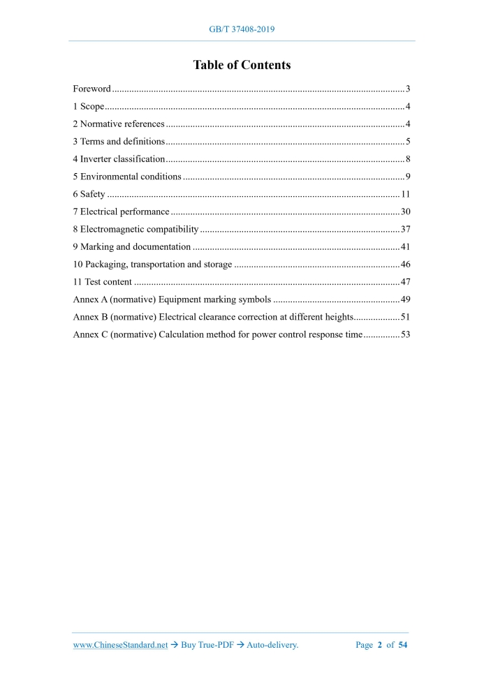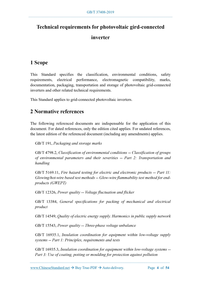 Similar standardsGB/T 37408-2019: Technical requirements for photovoltaic gird-connected inverter---This is an excerpt. Full copy of true-PDF in English version (including equations, symbols, images, flow-chart, tables, and figures etc.), auto-downloaded/delivered in 9 seconds, can be purchased online: https://www.ChineseStandard.net/PDF.aspx/GBT37408-2019GB NATIONAL STANDARD OF THE PEOPLE’S REPUBLIC OF CHINA ICS 27.160 F 12 Technical requirements for photovoltaic gird-connected inverter Issued on: MAY 10, 2019 Implemented on: DECEMBER 01, 2019 Issued by. State Administration for Market Regulation; Standardization Administration of the People's Republic of China. Table of ContentsForeword... 3 1 Scope... 4 2 Normative references... 4 3 Terms and definitions... 5 4 Inverter classification... 8 5 Environmental conditions... 9 6 Safety... 11 7 Electrical performance... 30 8 Electromagnetic compatibility... 37 9 Marking and documentation... 41 10 Packaging, transportation and storage... 46 11 Test content... 47 Annex A (normative) Equipment marking symbols... 49 Annex B (normative) Electrical clearance correction at different heights... 51 Annex C (normative) Calculation method for power control response time... 53 Technical requirements for photovoltaic gird-connected inverter1 ScopeThis Standard specifies the classification, environmental conditions, safety requirements, electrical performance, electromagnetic compatibility, marks, documentation, packaging, transportation and storage of photovoltaic grid-connected inverters and other related technical requirements. This Standard applies to grid-connected photovoltaic inverters.2 Normative referencesThe following referenced documents are indispensable for the application of this document. For dated references, only the edition cited applies. For undated references, the latest edition of the referenced document (including any amendments) applies. GB/T 191, Packaging and storage marks GB/T 4798.2, Classification of environmental conditions -- Classification of groups of environmental parameters and their severities -- Part 2.Transportation and handling GB/T 5169.11, Fire hazard testing for electric and electronic products -- Part 11. Glowing/hot-wire based test methods -- Glow-wire flammability test method for end- products (GWEPT) GB/T 12326, Power quality -- Voltage fluctuation and flicker GB/T 13384, General specifications for packing of mechanical and electrical product GB/T 14549, Quality of electric energy supply. Harmonics in public supply network GB/T 15543, Power quality -- Three-phase voltage unbalance GB/T 16935.1, Insulation coordination for equipment within low-voltage supply systems -- Part 1.Principles, requirements and tests GB/T 16935.3, Insulation coordination for equipment within low-voltage systems -- Part 3.Use of coating, potting or moulding for protection against pollution GB/T 16935.4, Insulation coordination for equipment within low-voltage systems -- Part 4.Consideration of high-frequency voltage stress GB/T 17626.2, Electromagnetic compatibility -- Testing and measurement techniques -- Electrostatic discharge immunity test GB/T 17626.3, Electromagnetic compatibility -- Testing and measurement techniques -- Part 3.Radiated, radio-frequency, electromagnetic field immunity test GB/T 17626.4, Electromagnetic compatibility -- Testing and measurement techniques -- Electrical fast transient/burst immunity test GB/T 17626.5, Electromagnetic compatibility -- Testing and measurement techniques -- Surge immunity test GB/T 17626.6, Electromagnetic compatibility -- Testing and measurement techniques -- Immunity to conducted disturbances, induced by radio-frequency fields GB/T 17626.8, Electromagnetic compatibility (EMC) -- Part 4-8.Testing and measurement techniques -- Power frequency magnetic field immunity test GB/T 17799.2, Electromagnetic compatibility -- Generic standards -- Part 2. Immunity standard for industrial environments GB/T 19964, Technical requirements for connecting photovoltaic power station to power system GB/T 24337, Power quality -- Inter-harmonics in public supply network GB/T 29319, Technical requirements for connecting photovoltaic power system to distribution network GB/T 37409, Testing specification for photovoltaic grid-connected inverter3 Terms and definitionsFor the purposes of this document, the following terms and definitions apply. 3.1 decisive voltage classification The highest continuous voltage level that can occur between any live parts under the most severe operating conditions. 3.2 protective extra-low voltage (PELV) system An electrical system for which the rms voltage of 50 V AC or 120 V DC is not greater in normal operation or single fault conditions (excluding earth faults in other circuits). Also called a PELV system. 3.3 safety extra-low voltage (SELV) system An electrical system in which the rms voltage of ac does not exceed 50 V or the dc voltage does not exceed 120 V under normal operation or single fault conditions (including earth faults in other circuits). Also called a SELV system. 3.4 protective bonding An electrical connection that provides electrical continuity between accessible conductive parts or protective shielding and the protective conductor terminal. 3.5 protective separation Structures and measures that separate circuits of different protection levels from each other through basic insulation and supplementary insulation or other equivalent protection measures (such as reinforced insulation or protective impedance). 3.6 functional insulation; FI Insulation measures to ensure the normal operation of equipment. They cannot protect against electric shock hazards, but can reduce the possibility of ignition or fire. 3.7 basic insulation Under normal operating conditions, the insulation that can only provide basic protection against electric shock. 3.8 supplementary insulation Independent insulation in addition to basic insulation. It can provide protection against electri