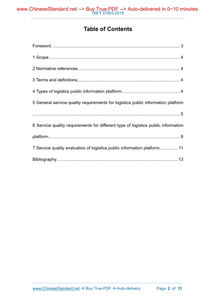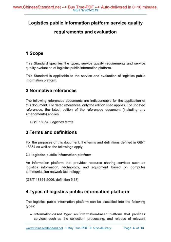 Similar standardsGB/T 37503-2019: Logistics public information platform service quality requirements and evaluation---This is an excerpt. Full copy of true-PDF in English version (including equations, symbols, images, flow-chart, tables, and figures etc.), auto-downloaded/delivered in 9 seconds, can be purchased online: https://www.ChineseStandard.net/PDF.aspx/GBT37503-2019 NATIONAL STANDARD OF THE PEOPLE’S REPUBLIC OF CHINA ICS 55.180.01 A 80 Logistics public information platform service quality requirements and evaluation ISSUED ON: MAY 10, 2019 IMPLEMENTED ON: DECEMBER 01, 2019 Issued by: State Administration for Market Regulation; Standardization Administration of the People's Republic of China. Table of ContentsForeword ... 3 1 Scope ... 4 2 Normative references ... 4 3 Terms and definitions ... 4 4 Types of logistics public information platform ... 4 5 General service quality requirements for logistics public information platform ... 5 6 Service quality requirements for different type of logistics public information platform... 8 7 Service quality evaluation of logistics public information platform ... 11 Bibliography ... 13 Logistics public information platform service quality requirements and evaluation1 ScopeThis Standard specifies the types, service quality requirements and service quality evaluation of logistics public information platform. This Standard is applicable to the service and evaluation of logistics public information platform.2 Normative referencesThe following referenced documents are indispensable for the application of this document. For dated references, only the edition cited applies. For undated references, the latest edition of the referenced document (including any amendments) applies. GB/T 18354, Logistics terms3 Terms and definitionsFor the purposes of this document, the terms and definitions defined in GB/T 18354 as well as the followings apply. 3.1 logistics public information platform An information platform that provides resource sharing services such as logistics information, technology, and equipment based on computer communication network technology. [GB/T 18354-2006, definition 5.37]4 Types of logistics public information platformThe logistics public information platform can be classified into the following types: -- Information-based type: an information-based platform that provides services such as the collection, processing, and release of relevant recovery to ensure the integrity and security of data and information. 5.2 Platform management The logistics public information platform shall set up corresponding management agencies to be responsible for the planning, construction, operation and maintenance of the platform and shall meet the following requirements: -- corresponding management system shall be established according to service content, including not are not limited to rules of use, operation management system, information security and management system, complaint management system; -- it shall guarantee the normal operation of various software and hardware facilities in the platform. Facilities such as fire protection, sanitation and security are in a normal state, and the platform shall be routinely maintained on a regular basis; -- it shall, according to the relevant regulations and requirements of the national information security level protection system, implement technical measures for Internet security protection, conduct real-time monitoring of system operating conditions according to law, maintain the normal operation of the platform and handle network security incidents in time. 5.3 Customer agreement The logistics public information platform shall sign an agreement with customers to clarify the rights and obligations of both parties, liability for breach of contract, dispute resolution, protection of personal information, security, etc. The agreement: -- shall comply with the laws, regulations and rules; in accordance with the principle of fairness, determine the rights and obligations of both parties to the transaction; significantly draw customer’s attention to terms that have a significant stake in customer; -- shall not make unfair or unreasonable provisions on customers in the form of contract format clauses that shall exclude or limit customer rights, reduce or relieve platform liability, increase customer liability. 5.4 Business operation services The business operation of logistics public information platform shall: -- include but not limited to customer training, customer process management, business dispute resolution; information such as member's identity information, corporate qualifications, resources such as vehicles and storage, and service capabilities; member information is kept for at least two years from the date of its last login; -- truthfully record the authenticity of the platform's customer information, transaction performance and comprehensively evaluate the user's credit level; -- there are measures to restrict access to severely dishonest customers; -- publicize the customer credit on the platform. 5.8 Business risk and emergency management The logistics public information platform shall run business risk and emergency management throughout the entire process of service: -- analyze and identify potential risks; formulate corresponding emergency plans for different risk types; -- in the event of an accident, emergency measures shall be taken in time; proactively communicate with customers or handle as agreed in the contract. 6 Service quality requirements for different type of logistics public information platform 6.1 Information-based type 6.1.1 General requirements The information-based platform shall provide services such as display and query of logistics-related information and shall be able to provide an information publishing interface for a third party. The information-based platform shall truthfully describe when it publishes information. There shall be no false publicity and false repre