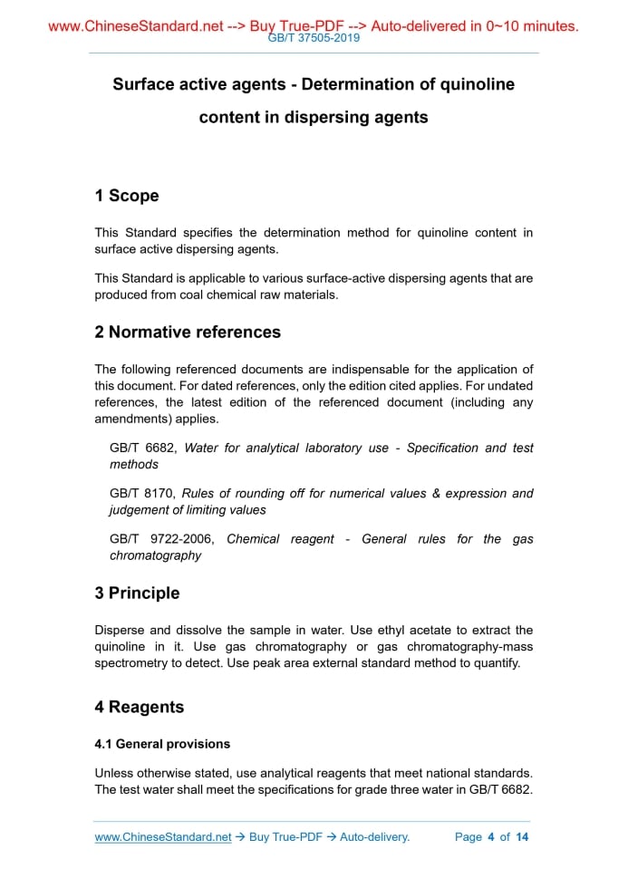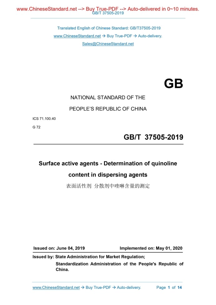 GB/T 37505-2019: Surface active agents - Determination of quinoline content in dispersing agents Delivery: 9 seconds. True-PDF full-copy in English & invoice will be downloaded + auto-delivered via email. See step-by-step procedure Status: Valid