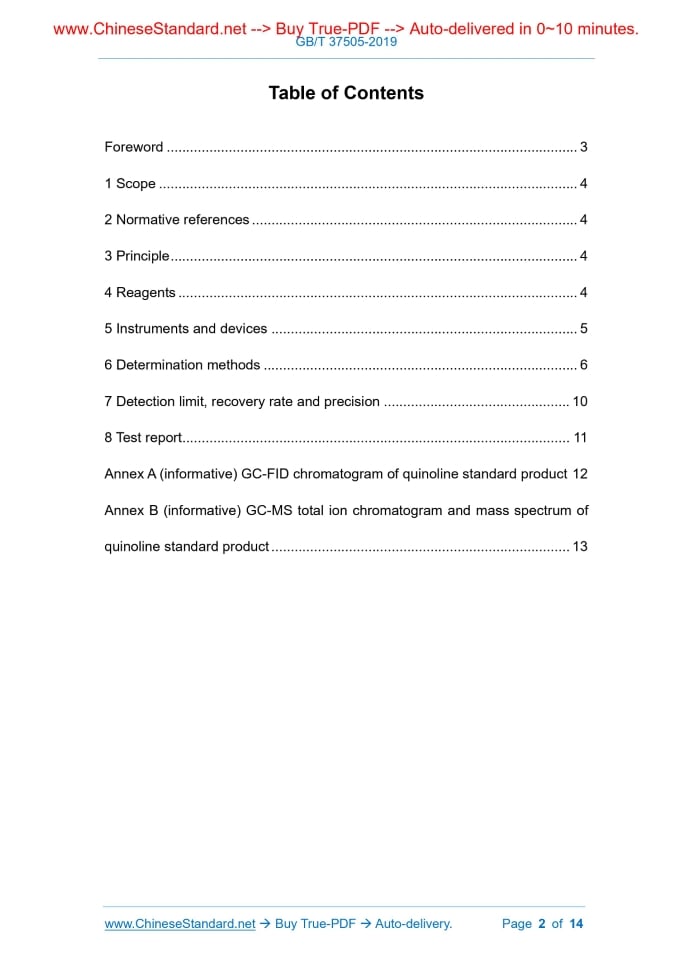 Similar standardsGB/T 37505-2019: Surface active agents - Determination of quinoline content in dispersing agents---This is an excerpt. Full copy of true-PDF in English version (including equations, symbols, images, flow-chart, tables, and figures etc.), auto-downloaded/delivered in 9 seconds, can be purchased online: https://www.ChineseStandard.net/PDF.aspx/GBT37505-2019NATIONAL STANDARD OF THE PEOPLE’S REPUBLIC OF CHINA ICS 71.100.40 G 72 Surface active agents - Determination of quinoline content in dispersing agents ISSUED ON: JUNE 04, 2019 IMPLEMENTED ON: MAY 01, 2020 Issued by: State Administration for Market Regulation; Standardization Administration of the People's Republic of China. Table of ContentsForeword ... 3 1 Scope ... 4 2 Normative references ... 4 3 Principle ... 4 4 Reagents ... 4 5 Instruments and devices ... 5 6 Determination methods ... 6 7 Detection limit, recovery rate and precision ... 10 8 Test report ... 11 Annex A (informative) GC-FID chromatogram of quinoline standard product 12 Annex B (informative) GC-MS total ion chromatogram and mass spectrum of quinoline standard product ... 13 Surface active agents - Determination of quinoline content in dispersing agents1 ScopeThis Standard specifies the determination method for quinoline content in surface active dispersing agents. This Standard is applicable to various surface-active dispersing agents that are produced from coal chemical raw materials.2 Normative referencesThe following referenced documents are indispensable for the application of this document. For dated references, only the edition cited applies. For undated references, the latest edition of the referenced document (including any amendments) applies. GB/T 6682, Water for analytical laboratory use - Specification and test methods GB/T 8170, Rules of rounding off for numerical values & expression and judgement of limiting values GB/T 9722-2006, Chemical reagent - General rules for the gas chromatography3 PrincipleDisperse and dissolve the sample in water. Use ethyl acetate to extract the quinoline in it. Use gas chromatography or gas chromatography-mass spectrometry to detect. Use peak area external standard method to quantify.4 Reagents4.1 General provisions Unless otherwise stated, use analytical reagents that meet national standards. The test water shall meet the specifications for grade three water in GB/T 6682. 5.7 Organic phase needle filter The specification is 13mm × 0.45μm. 5.8 Pipette The capacity is 20mL.6 Determination methods6.1 Sample pre-treatment Weigh 0.5g of sample (to the nearest of 0.0001g). Place in the extractor (see 5.6). Add 20mLof water. Shake vigorously till dissolved or fully wetted and dispersed. Use the pipette (see 5.8) to accurately add 20mL of ethyl acetate (see 4.2). Shake the extractor for 0.5min to make the aqueous phase and the organic phase fully contact. It may also use ultrasonic-assisted extraction. Conduct static layering (if the emulsification is serious and the layering is slower, it can be centrifuged at 3000r/min for 10min). Take the supernatant. For the sample solution that is filtered through the organic phase needle filter (see 5.7), use gas chromatograph or GC/MS to analyze. If the sample concentration exceeds the linear range of the instrument, it needs to dilute the sample to the linear range. 6.2 Gas chromatography 6.2.1 Gas chromatography analysis conditions Since the test results depend on the instrument used, it is not possible to give general parameters for chromatographic analysis. It may choose the best analysis conditions according to different equipment. Use the following parameters that have been proved suitable for the test. The parameters are as follows: - Chromatographic column: HP-5, 30m × 0.32mm × 0.25μm, or equivalent; - Carrier gas: nitrogen, constant flow, flow rate of 1mL/min; - Inlet temperature: 270°C; - Detector (FID) temperature: 300°C; - Hydrogen flow: 40mL/min; - Air flow: 400mL/min; - Compensation gas: nitrogen, 30mL/min; milligrams per kilogram (mg/kg): Where, A - Peak area of quinoline in sample solution; V - Volume of sample solution, in milliliters (mL); a, b - Standard curve constants; m - Sample mass, in grams (g); F - Dilution factor. The calculation result is rounded off to the integer according to GB/T 8170. 6.3 Gas chromatography-mass spectrometry (arbitration method) 6.3.1 GC-MS analysis conditions Since the test results depend on the instrument used, it is not possible to give general parameters for chromatographic analysis. It may choose the best analysis conditions according to different equipment. Use the following parameters that have been proved suitable for the test. The parameters are as follows: - Chromatographic column: HP-5MS, 30m × 0.25mm × 0.25μm, or equivalent; - Carrier gas: nitrogen, constant flow, flow rate of 1mL/min; - Inlet temperature: 260°C; - Auxiliary interface temperature: 280°C; - Injection volume: 1μL; - Injection method: injection without flow division; - Heating program: maintain at 80°C for 2min, rise at 10°C/min to 180°C for 2min; - Solvent delay: 4min; - Ion source temperature: 230°C; Where, A - Quinoline quantitative ion peak area; c - Quinoline concentration, in milligrams per liter (mg/L); a, b - Standard curve constants. After each instrument maintenance or replacement of parts, it shall redraw the standard curve. It is recommended that before each test of sample solution, use the quinoline standard solution with a known concentration to verify the curve. When the error exceeds 5%, it shall redraw the standard curve. 6.3.4 Sample determination steps Analyze the sample solution that has been well processed according to the chromatographic conditions (see 6.3.1). Record the quinoline quantitative ion peak area A in the sample solution. 6.3.5 Result calculation The quinoline content in surface active agent is calculated according to formula (4). The quinoline content X in surface active agent is calculated accordi