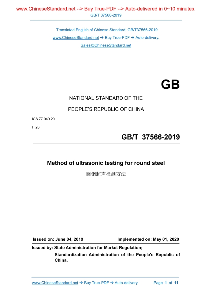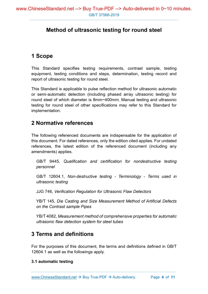 Similar standardsGB/T 37566-2019: Method of ultrasonic testing for round steel---This is an excerpt. Full copy of true-PDF in English version (including equations, symbols, images, flow-chart, tables, and figures etc.), auto-downloaded/delivered in 9 seconds, can be purchased online: https://www.ChineseStandard.net/PDF.aspx/GBT37566-2019NATIONAL STANDARD OF THE PEOPLE’S REPUBLIC OF CHINA ICS 77.040.20 H 26 Method of ultrasonic testing for round steel ISSUED ON: JUNE 04, 2019 IMPLEMENTED ON: MAY 01, 2020 Issued by: State Administration for Market Regulation; Standardization Administration of the People's Republic of China. Table of ContentsForeword ... 3 1 Scope ... 4 2 Normative references ... 4 3 Terms and definitions ... 4 4 Testing requirements ... 5 5 Contrast sample ... 6 6 Testing equipment ... 8 7 Testing conditions and steps ... 9 8 Determination ... 11 9 Testing record and report ... 11 Method of ultrasonic testing for round steel1 ScopeThis Standard specifies testing requirements, contrast sample, testing equipment, testing conditions and steps, determination, testing record and report of ultrasonic testing for round steel. This Standard is applicable to pulse reflection method for ultrasonic automatic or semi-automatic detection (including phased array ultrasonic testing) for round steel of which diameter is 8mm~400mm. Manual testing and ultrasonic testing for round steel of other specifications may refer to this Standard for implementation.2 Normative referencesThe following referenced documents are indispensable for the application of this document. For dated references, only the edition cited applies. For undated references, the latest edition of the referenced document (including any amendments) applies. GB/T 9445, Qualification and certification for nondestructive testing personnel GB/T 12604.1, Non-destructive testing - Terminology - Terms used in ultrasonic testing JJG 746, Verification Regulation for Ultrasonic Flaw Detectors YB/T 145, Die Casting and Size Measurement Method of Artificial Defects on the Contrast sample Pipes YB/T 4082, Measurement method of comprehensive properties for automatic ultrasonic flaw detection system for steel tubes3 Terms and definitionsFor the purposes of this document, the terms and definitions defined in GB/T 12604.1 as well as the followings apply. 3.1 automatic testing 4.2 Testing method Ultrasonic testing for round steel may use automatic testing, semi-automatic testing or manual testing. During manual testing, scanning speed of probe shall not exceed 150mm/s. 4.3 Coupling method Ultrasonic testing for round steel may use contact technology, gap technology or liquid immersion technology. Contact technology may use water, oil, grease or paste as couplant. Gap technology or liquid immersion technology usually use water or oil as couplant. In order to prevent round steel rusted and surface of round steel and probe to have bubbles, it may add preservatives, wetting agents and defoamers. 4.4 Scanning mode During ultrasonic testing, probe performs circumferential-direction scanning. In semi-automatic or automatic testing, relative motion scanning mode for probe and round steel can be: probe rotates round steel to go forward straight; probe fixes round steel to go forward spiral (or straight); probe moves along with round steel axis and round steel rotates in situ or probe fixes round steel to go forward straight. No matter which scanning mode used, scanning track of probe shall continuously and uniformly cover round steel surface. Scanning of adjacent tracks shall have an overlap of 10% of effective detection areas of probe. 4.5 Testing personnel Testing personnel shall have qualification certificate of GB/T 9445 or equivalent standard. Testing personnel that performs ultrasonic testing shall have qualification certificate for ultrasonic flaw detection professional level 1 and above. Testing report issuer shall have qualification certificate for ultrasonic flaw detection professional level 2 and above.5 Contrast sample5.1 Material Contrast sample material and acoustic performance shall be same or similar with testing round steel (acoustic attenuation difference shall be within ±4dB). There shall be no defects that affect equipment verification inside material. 5.2 Diameter, length and straightness Diameter of contrast sample for automatic testing and semi-automatic testing shall meet requirements for nominal size. Length and straightness shall meet standards (phased array ultrasonic detector meets relevant standards), perform regular calibration test. Calibration test cycle generally does not exceed 1 year. 6.2 Probe Frequency of ultrasonic testing probe of round steel is usually within 1MHz~10MHz. Probe’s wafer size is between 6mm~25mm (excitation aperture of phased array probe meets above requirements). Round steel ultrasonic testing can use combined probe of multiple wafers so as to improve testing speed. 6.3 Testing host When performing semi-automatic or automatic testing, relative scanning movement between probe and round steel is realized by testing host. For testing system of which probe rotates round steel and goes straight ahead, testing host includes rotating water chamber that drives probe to rotate and clamping drive device that drives round steel to go straight ahead. For testing system of which probe fixes round steel to perform spiral (or straight line) going- forward, testing host includes water tank that places probe and clamping drive device that drives round steel to perform spiral (or straight line) going-forward. For testing system of which probe moves along with round steel axis and round steel perform in situ rotation, testing host includes scanning mechanism that drives probe to move and roller system that drags round steel to perform in situ rotation. Testing host is a core component to ensure reliable testing. 6.4 Mechanical transmission device and other auxiliary devices During semi-automatic or automatic tes