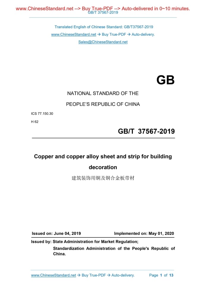GB/T 37567-2019: Copper and copper alloy sheet and strip for building decoration Delivery: 9 seconds. True-PDF full-copy in English & invoice will be downloaded + auto-delivered via email. See step-by-step procedure Status: Valid
