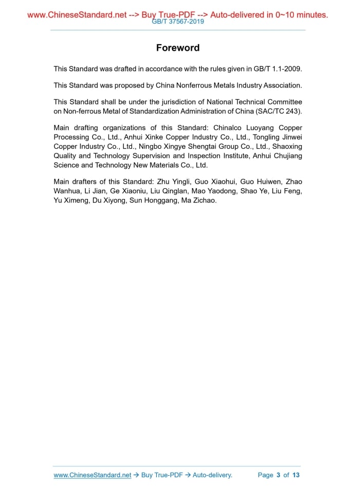 Similar standardsGB/T 37567-2019: Copper and copper alloy sheet and strip for building decoration---This is an excerpt. Full copy of true-PDF in English version (including equations, symbols, images, flow-chart, tables, and figures etc.), auto-downloaded/delivered in 9 seconds, can be purchased online: https://www.ChineseStandard.net/PDF.aspx/GBT37567-2019NATIONAL STANDARD OF THE PEOPLE’S REPUBLIC OF CHINA ICS 77.150.30 H 62 Copper and copper alloy sheet and strip for building decoration ISSUED ON: JUNE 04, 2019 IMPLEMENTED ON: MAY 01, 2020 Issued by: State Administration for Market Regulation; Standardization Administration of the People's Republic of China. Table of ContentsForeword ... 3 1 Scope ... 4 2 Normative references ... 4 3 Technical requirements ... 5 4 Test methods ... 10 5 Inspection rules ... 10 6 Marks, packaging, transport, storage and quality certificate ... 12 7 Order sheet (or contract) content ... 12ForewordThis Standard was drafted in accordance with the rules given in GB/T 1.1-2009. This Standard was proposed by China Nonferrous Metals Industry Association. This Standard shall be under the jurisdiction of National Technical Committee on Non-ferrous Metal of Standardization Administration of China (SAC/TC 243). Main drafting organizations of this Standard: Chinalco Luoyang Copper Processing Co., Ltd., Anhui Xinke Copper Industry Co., Ltd., Tongling Jinwei Copper Industry Co., Ltd., Ningbo Xingye Shengtai Group Co., Ltd., Shaoxing Quality and Technology Supervision and Inspection Institute, Anhui Chujiang Science and Technology New Materials Co., Ltd. Main drafters of this Standard: Zhu Yingli, Guo Xiaohui, Guo Huiwen, Zhao Wanhua, Li Jian, Ge Xiaoniu, Liu Qinglan, Mao Yaodong, Shao Ye, Liu Feng, Yu Ximeng, Du Xiyong, Sun Honggang, Ma Zichao. Copper and copper alloy sheet and strip for building decoration1 ScopeThis Standard specifies technical requirements, test methods, inspection rules, marks, packaging, transport, storage, quality certificate and content of order sheet (or contract) of copper and copper alloy sheet and strip for building decoration. This Standard is applicable to copper and copper alloy sheet and strip that are used to produce copper doors, copper tiles, bronze sculptures, roofing, roofs, exterior walls for building decoration (hereinafter referred to as the sheet and strip).2 Normative referencesThe following referenced documents are indispensable for the application of this document. For dated references, only the edition cited applies. For undated references, the latest edition of the referenced document (including any amendments) applies. GB/T 232, Metallic materials - Bend test GB/T 4340.1, Metallic materials - Vickers hardness test - Part 1: Test method GB/T 5121 (all parts), Methods for chemical analysis of copper and copper alloys GB/T 5231, Wrought Copper and Copper Alloys Chemical Composition Limits and Forms of Wrought Products GB/T 8170, Rules of rounding off for numerical values & expression and judgement of limiting values GB/T 8888, Wrought heavy non-ferrous metal products - Packing, marking, transporting and storing GB/T 26303.3, Measuring methods for dimensions and shapes of wrought copper and copper alloys - Part 3: Sheets and strips GB/T 34505-2017, Copper and copper alloy materials - Tensile testing at4 Test methods4.1 Chemical composition Analysis on chemical composition of the sheet and strip shall be performed according to GB/T 5121 (all parts) or YS/T 482 or YS/T 483. In arbitration, it shall be carried out according to provisions of GB/T 5121 (all parts). 4.2 Dimensions and allowable deviation Dimensions and allowable deviation testing of the sheet and strip shall be in accordance with GB/T 26303.3. 4.3 Mechanical properties Tensile test at room temperature of the sheet and strip shall be performed according to provisions of GB/T 34505-2017. Sample numbers are P01, P02, P03 in Table 3 of GB/T 34505-2017. Vickers hardness test is carried out according to provisions of GB/T 4340.1. 4.4 Bending performance Bending test of the sheet and strip is performed according to GB/T 232. 4.5 Surface quality Surface quality of the sheet and strip is inspected visually.5 Inspection rules5.1 Check and acceptance 5.1.1 Product shall be inspected by supplier to ensure product quality complies with provisions of this Standard. Supplier fills in quality certificate. 5.1.2 Purchaser shall inspect products received according to provisions of this Standard. If inspection results fail to meet requirements of this Standard and order sheet (or contract), it shall be proposed in written form to supplier and shall be solved by supplier and purchaser via negotiation. Objections to surface quality and size deviation shall be submitted within one month after products are received. Objections to other quality problems shall be submitted within three months after products are received. If arbitration is required, sampling for arbitration shall be performed by supplier and purchaser together. 5.2 Batching Bending performance Take any 2 pieces (rolls) from each batch. Take 1 sample along with rolling direction for each piece (roll). 3.5 4.4 Surface quality Piece by piece (roll by roll) 3.6 4.5 5.5 Determination of inspection results 5.5.1 Values of inspection results shall be rounded off according to provisions of GB/T 8170. Use rounded-off value comparison method to determine. 5.5.2 When chemical composition fails, this batch of products shall be rejected. 5.5.3 When dimensions, allowable deviation and surface quality fail, this piece (roll) shall be rejected. 5.5.4 When there is a sample in test results of mechanical properties, bending properties fail, it shall take samples double quantity from this batch of products (including products failed in previous inspection) to repeat rest. If re-test results meet requirements, this batch of products shall be accepted. If re-test results still fail, this batch of products shall be rejected or it is inspected p