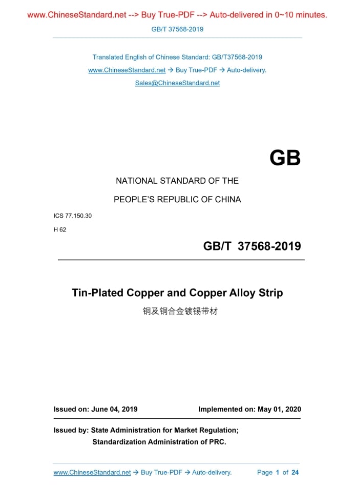 GB/T 37568-2019: Tin-Plated Copper and Copper Alloy Strip Delivery: 9 seconds. True-PDF full-copy in English & invoice will be downloaded + auto-delivered via email. See step-by-step procedure Status: Valid