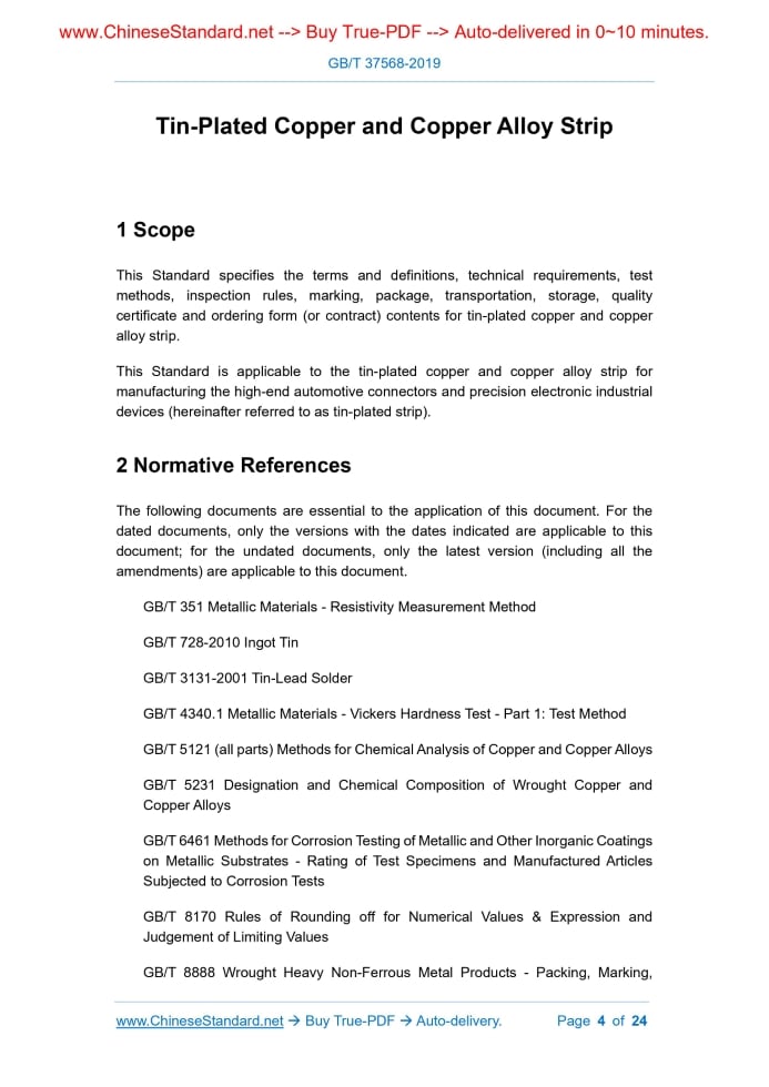 Similar standardsGB/T 37568-2019: Tin-Plated Copper and Copper Alloy Strip---This is an excerpt. Full copy of true-PDF in English version (including equations, symbols, images, flow-chart, tables, and figures etc.), auto-downloaded/delivered in 9 seconds, can be purchased online: https://www.ChineseStandard.net/PDF.aspx/GBT37568-2019NATIONAL STANDARD OF THE PEOPLE’S REPUBLIC OF CHINA ICS 77.150.30 H 62 Tin-Plated Copper and Copper Alloy Strip ISSUED ON: JUNE 04, 2019 IMPLEMENTED ON: MAY 01, 2020 Issued by: State Administration for Market Regulation; Standardization Administration of PRC. Table of ContentsForeword ... 3 1 Scope ... 4 2 Normative References ... 4 3 Terms and Definitions ... 5 4 Technical Requirements ... 6 5 Test Methods ... 14 6 Inspection Rules ... 16 7 Marking, Package, Transportation, Storage and Quality Certificate ... 18 8 Ordering Form (or Contract) Contents ... 19 Appendix A (Normative) Test Method for Weldability of Tin-Plated Copper and Copper Alloy Strip – Vertical-Dip Method ... 20 Appendix B (Normative) Coating Thickness Measurement of Tin-Plated Copper and Copper Alloy Strip – X-Ray Method ... 23 Tin-Plated Copper and Copper Alloy Strip1 ScopeThis Standard specifies the terms and definitions, technical requirements, test methods, inspection rules, marking, package, transportation, storage, quality certificate and ordering form (or contract) contents for tin-plated copper and copper alloy strip. This Standard is applicable to the tin-plated copper and copper alloy strip for manufacturing the high-end automotive connectors and precision electronic industrial devices (hereinafter referred to as tin-plated strip).2 Normative ReferencesThe following documents are essential to the application of this document. For the dated documents, only the versions with the dates indicated are applicable to this document; for the undated documents, only the latest version (including all the amendments) are applicable to this document. GB/T 351 Metallic Materials - Resistivity Measurement Method GB/T 728-2010 Ingot Tin GB/T 3131-2001 Tin-Lead Solder GB/T 4340.1 Metallic Materials - Vickers Hardness Test - Part 1: Test Method GB/T 5121 (all parts) Methods for Chemical Analysis of Copper and Copper Alloys GB/T 5231 Designation and Chemical Composition of Wrought Copper and Copper Alloys GB/T 6461 Methods for Corrosion Testing of Metallic and Other Inorganic Coatings on Metallic Substrates - Rating of Test Specimens and Manufactured Articles Subjected to Corrosion Tests GB/T 8170 Rules of Rounding off for Numerical Values & Expression and Judgement of Limiting Values GB/T 8888 Wrought Heavy Non-Ferrous Metal Products - Packing, Marking, Transporting and Storing GB/T 9286 Paints and Varnishes – Cross Cut Test for Films GB/T 26303.3 Measuring Methods for Dimensions and Shapes of Wrought Copper and Copper Alloys - Part 3: Sheets and Strips GB/T 32791 Electromagnetic (Eddy-Current) Examination Method for Electrical Conductivity of Copper and Copper Alloys GB/T 34505-2017 Copper and Copper Alloy Materials - Tensile Testing at Room Temperature YS/T 482 Method for Analysis of Copper and Copper Alloys - The Atomic Emission Spectrometry YS/T 483 Methods for Analysis of Copper and Copper Alloys - X-Ray Fluorescence Spectrometric (Wavelength Dispersive) YS/T 668 Sampling Method of Physical and Chemical Testing for Copper and Copper Alloys YS/T 815 Preparation Method of Test Pieces for Mechanical and Technological Properties of Copper and Copper Alloys3 Terms and DefinitionsFor the purposes of this document, the following terms and definitions apply. 3.1 Tin plating strip The strip that uses electrochemical principal or physical means to attach a tin metal layer with uniform thickness on the surface of copper and copper alloy strip. 3.2 Reflow electro-tinning strips; RFSn After the matt tin plating treatment, the copper and copper alloy strips are subjected to the reflow surface treatment to form a tin plating strip with tin-layer of a glassy and smooth surface. 3.3 Hot-dip tinning strips; HDSn The tin plating strip that make the copper and copper alloy strip to smelt tin through dipping method; and plate the tin layer with the same thickness on both sides of the copper and copper alloy strip. The chemical composition analysis of the base metal of tin plating strip shall be carried out as per the provisions of GB/T 5121 (all parts) or YS/T 482 or YS/T 483; while the arbitration shall be carried out as per the provisions of GB/T 5121 (all parts).The chemical composition analysis of the tin raw material of hot-dip tinning strip shall be carried out as per the provisions of GB/T 728-2010. The chemical composition analysis of the tin raw material of reflow electro-tinning strip shall be determined through the negotiation between the supplier and the purchaser. 5.2 Appearance dimension and its allowable deviation 5.2.1 The tests on the base metal and appearance dimension of tin plating strip shall be carried out as per the provisions of GB/T 26303.3. 5.2.2 The thickness measurement of tin plating layer shall be carried out as per the Appendix B. 5.3 Mechanical properties The tensile test of base metal of tin plating strip shall be carried out as per the provisions of GB/T 34505-2017; the specimen number shall be P4 in Table 3 of GB/T 34505-2017. The Vickers hardness test shall be carried out as per the provisions of GB/T 4340.1. 5.4 Electrical properties The electrical property test of base metal of tin plating strip shall be carried out as per the provisions of GB/T 351 or GB/T 32791; while the arbitration test shall be carried out as per the provisions of GB/T 351. 5.5 Weldability The weldability test of the tin plating strip shall be carried out as per the provisions of Appendix A. 5.6 Adhesion The coating adhesion test of the tin plating strip shall be carried out as per the provisions of GB/T 9286 or as per the method agreed between the supplier and the purchaser. 5.7 Oxidation resista