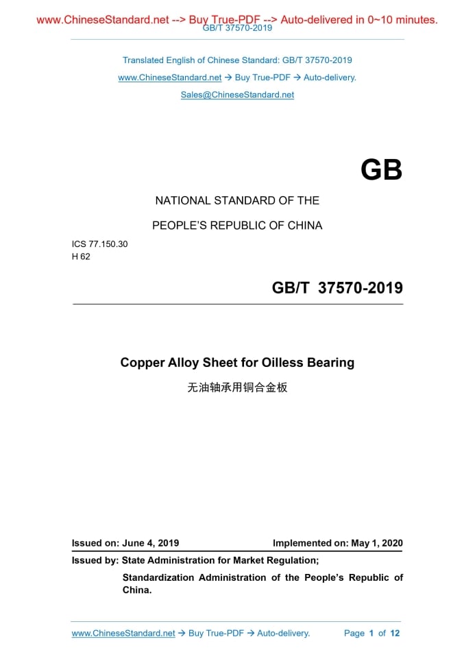 GB/T 37570-2019: Copper Alloy Sheet for Oilless Bearing Delivery: 9 seconds. True-PDF full-copy in English & invoice will be downloaded + auto-delivered via email. See step-by-step procedure Status: Valid