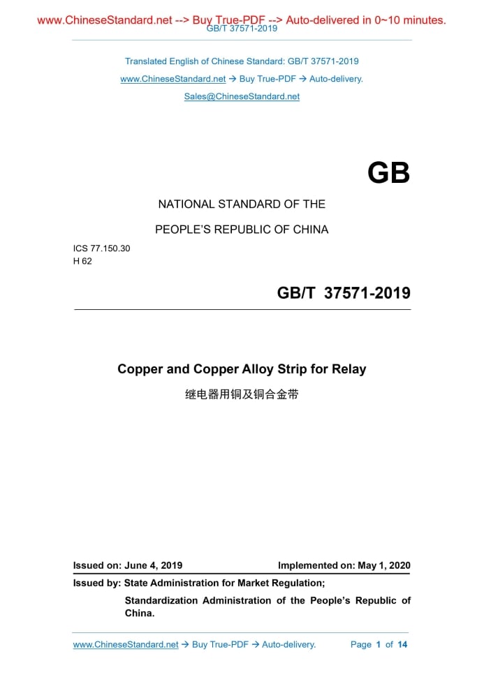 GB/T 37571-2019: Copper and Copper Alloy Strip for Relay Delivery: 9 seconds. True-PDF full-copy in English & invoice will be downloaded + auto-delivered via email. See step-by-step procedure Status: Valid