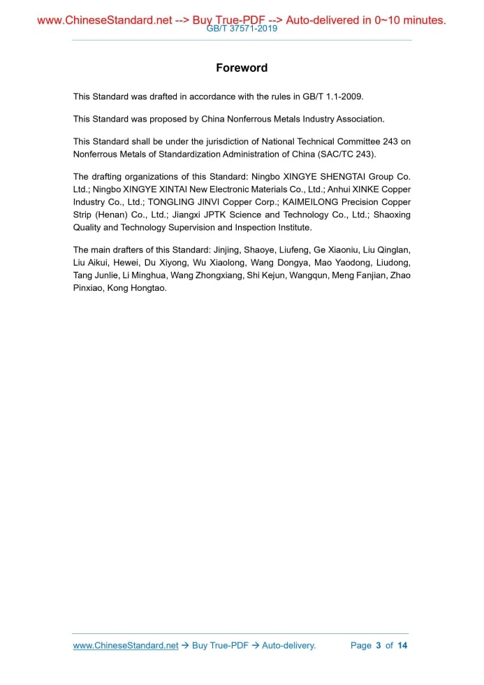 Similar standardsGB/T 37571-2019: Copper and Copper Alloy Strip for Relay---This is an excerpt. Full copy of true-PDF in English version (including equations, symbols, images, flow-chart, tables, and figures etc.), auto-downloaded/delivered in 9 seconds, can be purchased online: https://www.ChineseStandard.net/PDF.aspx/GBT37571-2019GB NATIONAL STANDARD OF THE PEOPLE’S REPUBLIC OF CHINA ICS 77.150.30 H 62 Copper and Copper Alloy Strip for Relay ISSUED ON: JUNE 4, 2019 IMPLEMENTED ON: MAY 1, 2020 Issued by: State Administration for Market Regulation; Standardization Administration of the People’s Republic of China. Table of ContentsForeword ... 3 1 Scope ... 4 2 Normative References ... 4 3 Technical Requirements ... 5 4 Test Methods ... 11 5 Inspection Rules ... 12 6 Marking, Packaging, Transportation, Storage and Quality Certificate ... 14 7 Order Form (or contract) Content ... 14ForewordThis Standard was drafted in accordance with the rules in GB/T 1.1-2009. This Standard was proposed by China Nonferrous Metals Industry Association. This Standard shall be under the jurisdiction of National Technical Committee 243 on Nonferrous Metals of Standardization Administration of China (SAC/TC 243). The drafting organizations of this Standard: Ningbo XINGYE SHENGTAI Group Co. Ltd.; Ningbo XINGYE XINTAI New Electronic Materials Co., Ltd.; Anhui XINKE Copper Industry Co., Ltd.; TONGLING JINVI Copper Corp.; KAIMEILONG Precision Copper Strip (Henan) Co., Ltd.; Jiangxi JPTK Science and Technology Co., Ltd.; Shaoxing Quality and Technology Supervision and Inspection Institute. The main drafters of this Standard: Jinjing, Shaoye, Liufeng, Ge Xiaoniu, Liu Qinglan, Liu Aikui, Hewei, Du Xiyong, Wu Xiaolong, Wang Dongya, Mao Yaodong, Liudong, Tang Junlie, Li Minghua, Wang Zhongxiang, Shi Kejun, Wangqun, Meng Fanjian, Zhao Pinxiao, Kong Hongtao. Copper and Copper Alloy Strip for Relay1 ScopeThis Standard stipulates the technical requirements, test methods, inspection rules, marking, packaging, transportation, storage, quality certificate and order form (or contract) content of copper and copper alloy strip for relay. This Standard is applicable to copper and copper alloy strip for relay (hereinafter referred to as strip).2 Normative ReferencesThe following documents are indispensable to the application of this document. In terms of references with a specified date, only versions with a specified date are applicable to this document. In terms of references without a specified date, the latest version (including all the modifications) is applicable to this document. GB/T 232 Metallic Materials - Bend Test; GB/T 351 Metallic Materials - Resistivity Measurement Method; GB/T 4340.1 Metallic Materials - Vickers Hardness Test - Part 1: Test Method; GB/T 5121 (all parts) Methods for Chemical Analysis of Copper and Copper Alloys; GB/T 5231 Designation and Chemical Composition of Wrought Copper and Copper Alloys; GB/T 8170 Rules of Rounding-off for Numerical Values & Expression and Judgement of Limiting Values; GB/T 8888 Wrought Heavy Non-ferrous Metal Products - Packing, Marking, Transportation, Storing and Certificate of Quality; GB/T 26303.3 Measuring Methods for Dimensions and Shapes of Wrought Copper and Copper Alloys - Part 3: Sheets and Strips; GB/T 32791 Electromagnetic (eddy-current) Examination Method for Electrical Conductivity of Copper and Copper Alloys; GB/T 34505-2017 Copper and Copper Alloy Materials - Tensile Testing at Room Temperature; YS/T 482 Methods for Analysis of Copper and Copper Alloys - The Atomic Emission Tensile sample shall comply with the stipulations in GB/T 34505-2017. The type of sample shall select P01 from Table 3 in GB/T 34505-2017. Test method of Vickers hardness of strip shall comply with the stipulations in GB/T 4340.1. 4.4 Bending Performance Bending performance of strip shall comply with the stipulations in GB/T 232. 4.5 Electrical Performance Electrical performance test of strip shall comply with the stipulations in GB/T 32791 or GB/T 351. Arbitration shall comply with the stipulations in GB/T 351. 4.6 Surface Quality Surface quality of strip shall receive visual inspection.5 Inspection Rules5.1 Inspection and Acceptance Inspection 5.1.1 Strip shall be inspected by the supply side, which shall guarantee that product quality complies with the requirements of this Standard and the order form (or contract). Moreover, quality certificate shall be filled out. 5.1.2 The demand-side shall inspect the received products in accordance with the stipulations in this Standard and the order form (or contract). If the inspection result does not comply with the requirements of this Standard and the order form (or contract), this shall be proposed to the supply-side in the written form; and solved by the demand- side and the supply-side through negotiation. Objections regarding surface quality and dimensional deviations shall be proposed within 1 month upon receiving the products. Other quality objections shall be proposed within 3 months upon receiving the products. If arbitration is needed, arbitration sampling shall be jointly conducted by the demand- side and the supply-side. 5.2 Group Batch Strip shall be submitted for acceptance inspection in batches. Each batch shall be constituted of strips of the same designation, status and specification. Generally speaking, the weight of each batch shall be not more than 4,500 kg (if that batch is under the same furnace No., then, batch weight may not be restricted). 5.3 Inspection Items 5.3.1 Each batch of strips shall receive inspection of chemical composition, dimensions and allowable deviations, bending performance and surface quality. 5.5.2 When the inspection result of chemical composition is disqualified, then, the batch of strips shall be determined as disqualified. 5.5.3 When dimensions, allowable deviations and surface quality are disqualified, the coil of strip shall be determined as disqualified. 5.5.4 When there are samples that ar