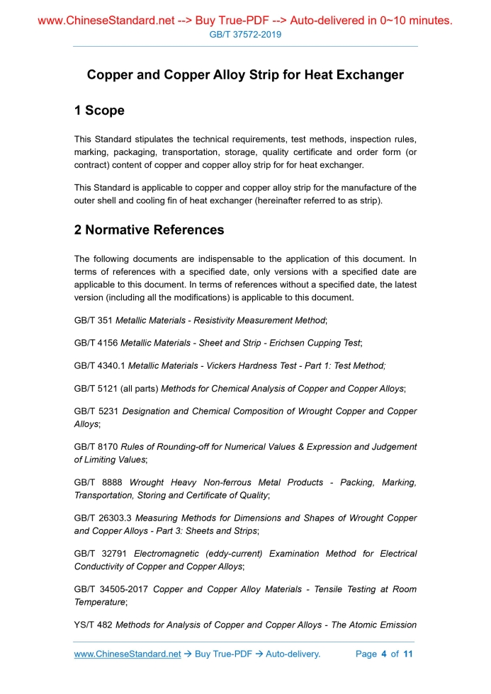 Similar standardsGB/T 37572-2019: Copper and Copper Alloy Strip for Heat Exchanger---This is an excerpt. Full copy of true-PDF in English version (including equations, symbols, images, flow-chart, tables, and figures etc.), auto-downloaded/delivered in 9 seconds, can be purchased online: https://www.ChineseStandard.net/PDF.aspx/GBT37572-2019NATIONAL STANDARD OF THE PEOPLE’S REPUBLIC OF CHINA ICS 77.150.30 H 62 Copper and Copper Alloy Strip for Heat Exchanger ISSUED ON: JUNE 4, 2019 IMPLEMENTED ON: MAY 1, 2020 Issued by: State Administration for Market Regulation; Standardization Administration of the People’s Republic of China. Table of ContentsForeword ... 3 1 Scope ... 4 2 Normative References ... 4 3 Technical Requirements ... 5 4 Test Methods ... 8 5 Inspection Rules ... 9 6 Marking, Packaging, Transportation, Storage and Quality Certificate ... 11 7 Order Form (or contract) Content ... 11 Copper and Copper Alloy Strip for Heat Exchanger1 ScopeThis Standard stipulates the technical requirements, test methods, inspection rules, marking, packaging, transportation, storage, quality certificate and order form (or contract) content of copper and copper alloy strip for for heat exchanger. This Standard is applicable to copper and copper alloy strip for the manufacture of the outer shell and cooling fin of heat exchanger (hereinafter referred to as strip).2 Normative ReferencesThe following documents are indispensable to the application of this document. In terms of references with a specified date, only versions with a specified date are applicable to this document. In terms of references without a specified date, the latest version (including all the modifications) is applicable to this document. GB/T 351 Metallic Materials - Resistivity Measurement Method; GB/T 4156 Metallic Materials - Sheet and Strip - Erichsen Cupping Test; GB/T 4340.1 Metallic Materials - Vickers Hardness Test - Part 1: Test Method; GB/T 5121 (all parts) Methods for Chemical Analysis of Copper and Copper Alloys; GB/T 5231 Designation and Chemical Composition of Wrought Copper and Copper Alloys; GB/T 8170 Rules of Rounding-off for Numerical Values & Expression and Judgement of Limiting Values; GB/T 8888 Wrought Heavy Non-ferrous Metal Products - Packing, Marking, Transportation, Storing and Certificate of Quality; GB/T 26303.3 Measuring Methods for Dimensions and Shapes of Wrought Copper and Copper Alloys - Part 3: Sheets and Strips; GB/T 32791 Electromagnetic (eddy-current) Examination Method for Electrical Conductivity of Copper and Copper Alloys; GB/T 34505-2017 Copper and Copper Alloy Materials - Tensile Testing at Room Temperature; YS/T 482 Methods for Analysis of Copper and Copper Alloys - The Atomic Emission 4.3 Mechanical Properties 4.3.1 The tensile test of strip shall comply with the stipulations in GB/T 34505-2017. Tensile sample shall select P01 in Table 3 in GB/T 34505-2017. 4.3.2 The Vickers hardness test of strip shall comply with the stipulations in GB/T 4340.1. 4.4 Process Performance Cupping test of strip shall comply with the stipulations in GB/T 4156. 4.5 Electrical Performance Electrical performance test of strip shall comply with the stipulations in GB/T 351 or GB/T 32791. Arbitration test shall comply with the stipulations in GB/T 351. 4.6 Surface Quality Surface quality of strip shall receive visual inspection.5 Inspection Rules5.1 Inspection and Acceptance Inspection 5.1.1 Strip shall be inspected by the supply side, which shall guarantee that product quality complies with the stipulations of this Standard and the order form (or contract). Moreover, quality certificate shall be filled out. 5.1.2 The demand-side shall inspect the received products in accordance with the stipulations in this Standard. If the inspection result does not comply with the requirements of this Standard and the order form (or contract), this shall be proposed to the supply-side in the written form; and solved by the demand-side and the supply- side through negotiation. Objections regarding surface quality and dimensional deviations shall be proposed within 1 month upon receiving the products. Other quality objections shall be proposed within 3 months upon receiving the products. If arbitration is needed, arbitration sampling shall be jointly conducted by the demand-side and the supply-side. 5.2 Group Batch Strip shall be submitted for acceptance inspection in batches. Each batch shall be constituted of strips of the same designation, status and specification. The weight of each batch (coil, disk, box) shall be not more than 3,500 kg (if that batch is under the same furnace No., then, batch weight may not be restricted). 5.3 Inspection Items is disqualified in the previous inspection). If the re-inspection result is completely qualified, then, that batch of strips shall be determined as qualified. If the re-inspection result is still disqualified, then, that batch of strips shall be determined as disqualified. The supply-side is allowed to inspect coil by coil and deliver those that are qualified.6 Marking, Packaging, Transportation, Storage andQuality Certificate Strips’ marking, packaging, transportation, storage and quality certificate shall comply with the stipulations in GB/T 8888.7 Order Form (or contract) ContentOrder form (or contract) content of materials listed in this Standard shall include the following content: a) Product name; b) Designation; c) Status; d) Dimensions; e) Weight (reel weight and tray weight); f) Dimensions and allowable deviations (when there are special requirements); g) Electrical performance (when the demand-side requests); h) Packaging requirements (where there are special requirements); i) Serial No. of this Standard; j) Others. __________ END __________ ......Source: Above contents are excerpted from the full-copy PDF -- translated/reviewed by: www.ChineseStandard.net / Wayne Zheng et al. Tips & Frequently Asked Questions:Question 1: How long will the true-PDF of English version