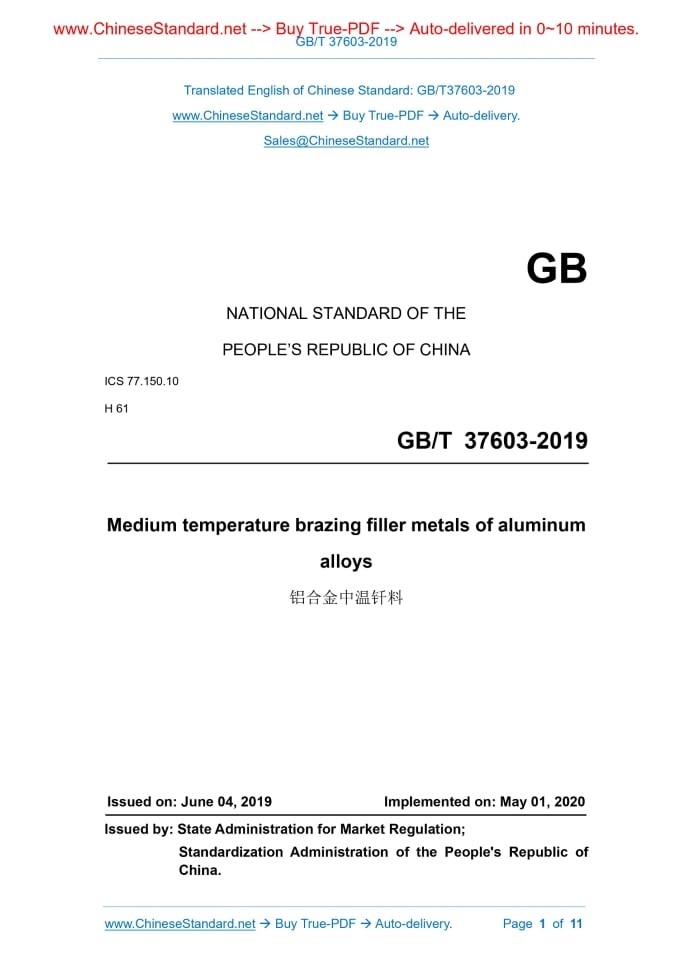 GB/T 37603-2019: Medium temperature brazing filler metals of aluminum alloys Delivery: 9 seconds. True-PDF full-copy in English & invoice will be downloaded + auto-delivered via email. See step-by-step procedure Status: Valid