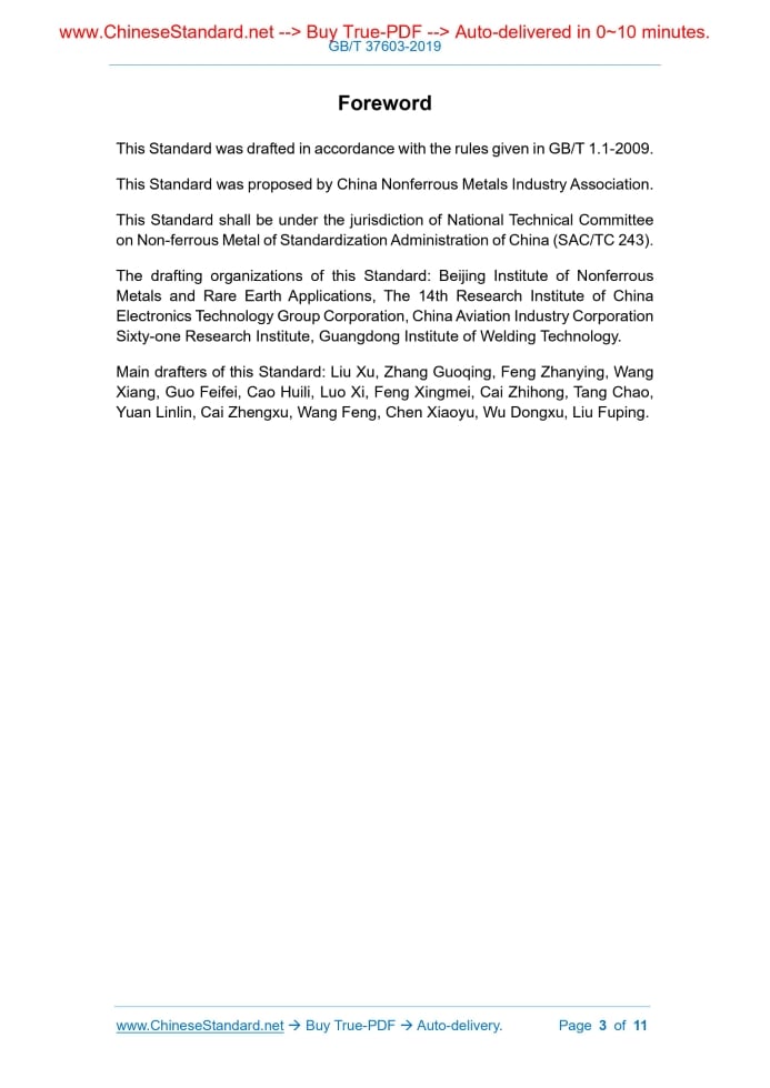 Similar standardsGB/T 37603-2019: Medium temperature brazing filler metals of aluminum alloys---This is an excerpt. Full copy of true-PDF in English version (including equations, symbols, images, flow-chart, tables, and figures etc.), auto-downloaded/delivered in 9 seconds, can be purchased online: https://www.ChineseStandard.net/PDF.aspx/GBT37603-2019NATIONAL STANDARD OF THE PEOPLE’S REPUBLIC OF CHINA ICS 77.150.10 H 61 Medium temperature brazing filler metals of aluminum alloys ISSUED ON: JUNE 04, 2019 IMPLEMENTED ON: MAY 01, 2020 Issued by: State Administration for Market Regulation; Standardization Administration of the People's Republic of China. Table of ContentsForeword ... 3 1 Scope ... 4 2 Normative references ... 4 3 Requirements ... 5 4 Test methods ... 7 5 Inspection rules ... 8 6 Marks, packaging, transport, storage and quality certificate ... 9 7 Contract (or order sheet) ... 11ForewordThis Standard was drafted in accordance with the rules given in GB/T 1.1-2009. This Standard was proposed by China Nonferrous Metals Industry Association. This Standard shall be under the jurisdiction of National Technical Committee on Non-ferrous Metal of Standardization Administration of China (SAC/TC 243). The drafting organizations of this Standard: Beijing Institute of Nonferrous Metals and Rare Earth Applications, The 14th Research Institute of China Electronics Technology Group Corporation, China Aviation Industry Corporation Sixty-one Research Institute, Guangdong Institute of Welding Technology. Main drafters of this Standard: Liu Xu, Zhang Guoqing, Feng Zhanying, Wang Xiang, Guo Feifei, Cao Huili, Luo Xi, Feng Xingmei, Cai Zhihong, Tang Chao, Yuan Linlin, Cai Zhengxu, Wang Feng, Chen Xiaoyu, Wu Dongxu, Liu Fuping. Medium temperature brazing filler metals of aluminum alloys1 ScopeThis Standard specifies requirements, test methods, inspection rules and marks, packaging, transport, storage, quality certificate and contract (or order sheet) for medium temperature brazing filler metals of aluminum alloys for electronics industry use. This Standard is applicable to medium temperature brazing filler metals of aluminum alloys for electronics industry use (hereinafter referred to as brazing filler metal).2 Normative referencesThe following referenced documents are indispensable for the application of this document. For dated references, only the edition cited applies. For undated references, the latest edition of the referenced document (including any amendments) applies. GB/T 1425, Determination of Melting Temperature Range for Precious Metals and Their Alloys - Testing Method of Thermal Analysis GB/T 3190, Wrought aluminium and aluminium alloys - Chemical composition limits GB/T 3199, Wrought aluminium and aluminium alloy products - Packing, marking, transporting and storing GB/T 8170, Rules of rounding off for numerical values & expression and judgement of limiting values GB/T 17432, Methods for sampling for analyzing the chemical composition of wrought aluminum and aluminum alloys GB/T 20975 (all parts), Chemical analysis methods of aluminium and aluminium alloys calculating “Al” content, take the sum of analysis values of regular analysis elements and analysis values of irregular analysis elements that are suspected as excessive as “sum of element contents”. 4.1.2 Use rounding-off comparison method for determination of analysis values. Rounding-off rules for values are in accordance with relevant provisions of GB/T 8170. Number of revisions shall be consistent with limit digits specified in GB/T 3190. 4.2 Size deviation It shall use measuring tool of corresponding precision to measure size deviation of brazing filler metal. 4.3 Appearance quality Under natural scattered light, visually inspect appearance quality. When necessary, it may use size measuring tool to define defect size. Determine defect depth through grinding. 4.4 Melting temperature Determination method for melting temperature of brazing filler metal is in accordance with provisions of GB/T 1425.5 Inspection rules5.1 Inspection and acceptance 5.1.1 Product shall be inspected by supplier to ensure product quality complies with provisions of contract (or order sheet) of this Standard. Supplier fills in quality certificate. 5.1.2 Purchaser shall inspect products received according to provisions of this Standard. When inspection results fail to comply with provisions of contract (or order sheet) of this Standard, it shall be proposed in written form to supplier, and it shall be solved by supplier and purchaser through negotiation. Objections to appearance quality and size shall be proposed within one month since products are received. Objections to other performances shall be proposed within three months since products are received. If arbitration is required, it may entrust an authority recognized by supplier and purchaser to perform the arbitration. Perform sampling together at purchaser’s site. 5.2 Batching Brazing filler metals shall be submitted for acceptance in batches. Each batch certificate 6.1 Marks 6.1.1 Product marks Each batch of brazing filler metals shall have paper label, printed with following information: a) designation; b) state; c) furnace number or batch number; d) shape; e) inspection seal of supplier’s technical supervision department (or signature or seal of quality inspector). 6.1.2 Mark of packaging box Mark of product’s packaging box shall comply with provisions of GB/T 3199. 6.2 Packaging, transport, storage Packaging, transport, storage of brazing filler metal shall comply with provisions of GB/T 3199. 6.3 Product quality certificate Each batch of products shall be attached with quality certificate, indicating: a) supplier’s name; b) product name; c) product designation; d) furnace number or batch number; e) shape; f) delivery state; g) contract number; h) net weight and number of pieces; ......Source: Above contents are excerpted from the full-copy PDF -- translated/reviewed by: w