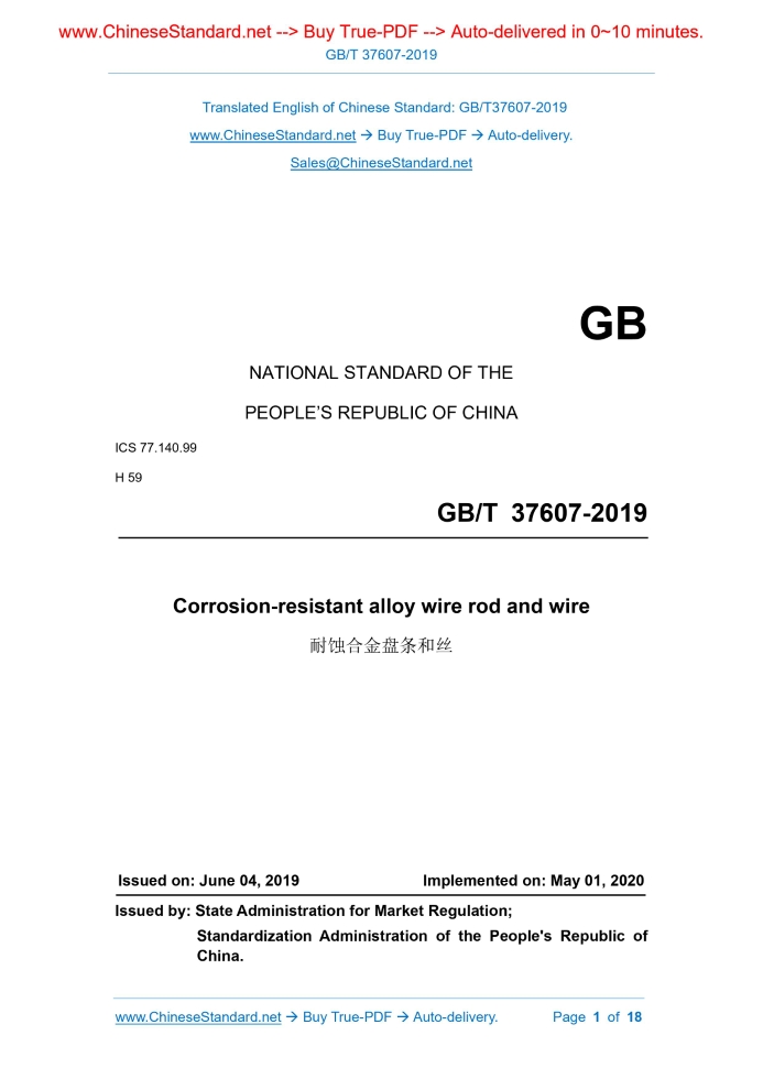 GB/T 37607-2019: Corrosion-resistant alloy wire rod and wire Delivery: 9 seconds. True-PDF full-copy in English & invoice will be downloaded + auto-delivered via email. See step-by-step procedure Status: Valid GB/T 37607: Historical versions