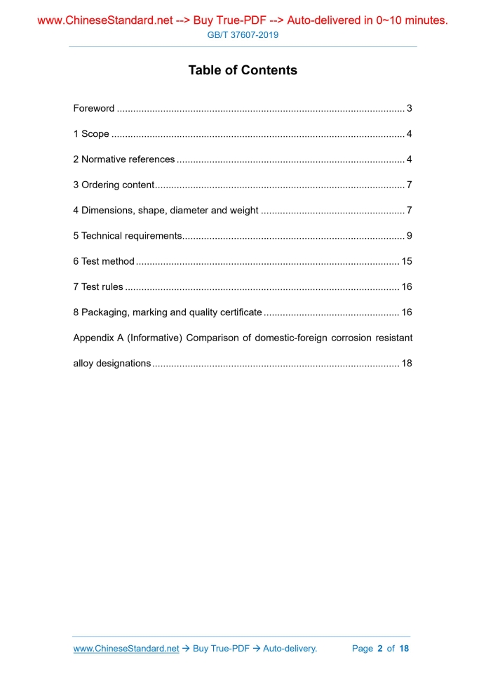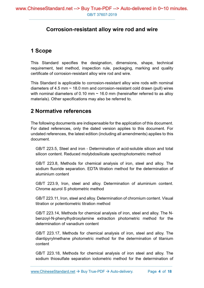Similar standardsGB/T 37607-2019: Corrosion-resistant alloy wire rod and wire---This is an excerpt. Full copy of true-PDF in English version (including equations, symbols, images, flow-chart, tables, and figures etc.), auto-downloaded/delivered in 9 seconds, can be purchased online: https://www.ChineseStandard.net/PDF.aspx/GBT37607-2019NATIONAL STANDARD OF THE PEOPLE’S REPUBLIC OF CHINA ICS 77.140.99 H 59 Corrosion-resistant alloy wire rod and wire ISSUED ON: JUNE 04, 2019 IMPLEMENTED ON: MAY 01, 2020 Issued by: State Administration for Market Regulation; Standardization Administration of the People's Republic of China. Table of ContentsForeword ... 3 1 Scope ... 4 2 Normative references ... 4 3 Ordering content ... 7 4 Dimensions, shape, diameter and weight ... 7 5 Technical requirements ... 9 6 Test method ... 15 7 Test rules ... 16 8 Packaging, marking and quality certificate ... 16 Appendix A (Informative) Comparison of domestic-foreign corrosion resistant alloy designations ... 18 Corrosion-resistant alloy wire rod and wire1 ScopeThis Standard specifies the designation, dimensions, shape, technical requirement, test method, inspection rule, packaging, marking and quality certificate of corrosion-resistant alloy wire rod and wire. This Standard is applicable to corrosion-resistant alloy wire rods with nominal diameters of 4.5 mm ~ 18.0 mm and corrosion-resistant cold drawn (pull) wires with nominal diameters of 0.10 mm ~ 16.0 mm (hereinafter referred to as alloy materials). Other specifications may also be referred to.2 Normative referencesThe following documents are indispensable for the application of this document. For dated references, only the dated version applies to this document. For undated references, the latest edition (including all amendments) applies to this document. GB/T 223.5, Steel and iron - Determination of acid-soluble silicon and total silicon content. Reduced molybdosilicate spectrophotometric method GB/T 223.8, Methods for chemical analysis of iron, steel and alloy. The sodium fluoride separation. EDTA titration method for the determination of aluminium content GB/T 223.9, Iron, steel and alloy. Determination of aluminium content. Chrome azurol S photometric method GB/T 223.11, Iron, steel and alloy. Determination of chromium content. Visual titration or potentiometric titration method GB/T 223.14, Methods for chemical analysis of iron, steel and alloy. The N- benzoyl-N-phenylhydroxylamine extraction photometric method for the determination of vanadium content GB/T 223.17, Methods for chemical analysis of iron, steel and alloy. The diantipyrylmethane photometric method for the determination of titanium content GB/T 223.18, Methods for chemical analysis of iron steel and alloy. The sodium thiosulfate separation iodometric method for the determination of GB/T 223.73, Iron, steel and alloy. Determination of iron contents. Titanium trichloride-potassium dichromate titration method GB/T 223.75, Iron, steel and alloy. Determination of boron content. Methanol distillation-curcumin photometric method GB/T 223.79, Iron and steel. Determination of multi-element contents. X-ray fluorescence spectrometry (Routine method) GB/T 223.85, Steel and iron. Determination of sulfur content. Infrared absorption method after combustion in an induction furnace GB/T 223.86, Steel and iron. Determination of total carbon content. Infrared absorption method after combustion in an induction furnace GB/T 226, Test method for macrostructure and defect of steel by etching GB/T 228.1, Metallic materials. Tensile testing. Part 1: Method of test at room temperature GB/T 228.2, Metallic materials. Tensile testing. Part 2: Method of test at elevated temperature GB/T 239.2, Metallic materials. Wire. Part 2: Reverse torsion test GB/T 2039, Metallic materials. Uniaxial creep testing method in tension GB/T 2103-2008, General requirements for acceptance, packing, marking and quality certification of steel wire GB/T 2975, Steel and steel products. Location and preparation of samples and test pieces for mechanical testing GB/T 4162, Forged and rolled steel bars. Method for ultrasonic testing GB/T 6394, Determination of estimating the average grain size of metal GB/T 11170, Stainless steel. Determination of multi-element contents. Spark discharge atomic emission spectrometric method (Routine method) GB/T 15007, Grades of corrosion-resistant alloy GB/T 15260, Corrosion of metals and alloys. Test methods for intergranular corrosion of nickel alloys GB/T 20066, Steel and iron. Sampling and preparation of samples for the determination of chemical composition GB/T 20123, Steel and iron. Determination of total carbon and sulfur content 5.4.1 The wire rod shall be tested for hardness or tensile strength. The specific requirements shall be determined by both parties. 5.4.2 The mechanical properties of the cold drawn (pull) wire that is treated by the heat treatment system which is recommended in Table 6 shall comply with the requirements of Table 6. 5.5 Surface quality 5.5.1 The surface of the wire rod shall be smooth, free from cracks, scars, flashing edges, heavy skin, tensile marks, burrs, scratches; pits and scratches that do not exceed half of the dimensional tolerances are allowed to exist. 5.5.2 The cold drawn surface is not allowed to have defects that are harmful to use such as scabs, folds, cracks, burrs, pits, scratches and scales; however, it is allowed to have pits and scratches whose depth do not exceed half the dimensional tolerance. 5.6 Special requirements. According to the requirements of the buyer, if it is negotiated between the supplier and the buyer, and specified in the contract, the alloy materials of the following special requirements can be supplied: a) test low-magnification organization; b) ultrasonic testing; c) test the grain size; d) test intergranular corrosion; e) test high-temperature stretching; f) test process performance such as torsion; g) others. air cooling 11 H06002 NS3