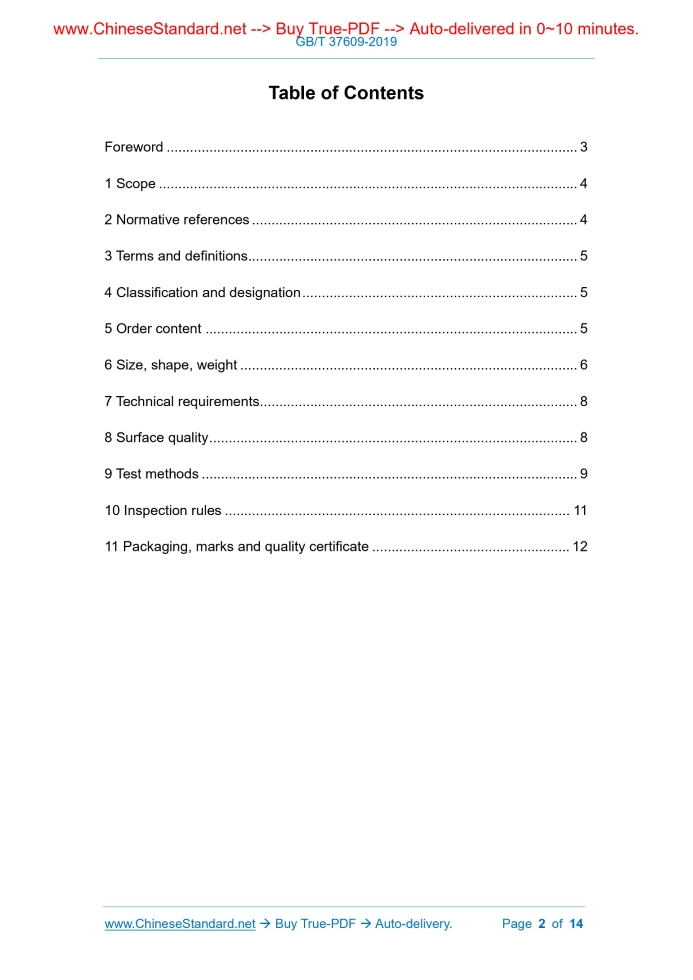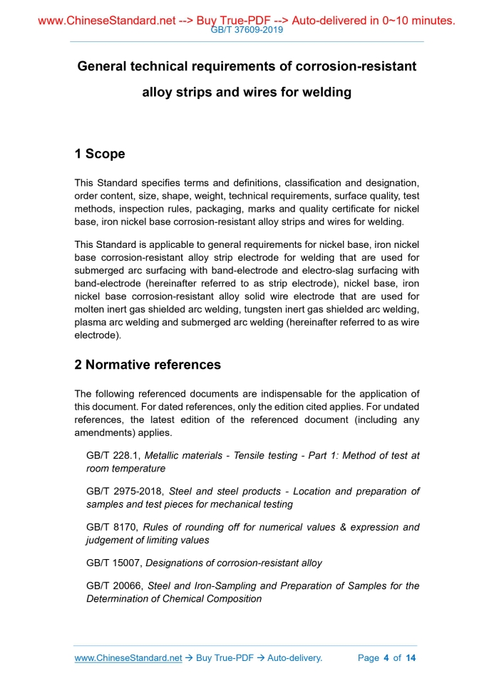 Similar standardsGB/T 37609-2019: General technical requirements of corrosion-resistant alloy strips and wires for welding---This is an excerpt. Full copy of true-PDF in English version (including equations, symbols, images, flow-chart, tables, and figures etc.), auto-downloaded/delivered in 9 seconds, can be purchased online: https://www.ChineseStandard.net/PDF.aspx/GBT37609-2019 NATIONAL STANDARD OF THE PEOPLE’S REPUBLIC OF CHINA ICS 77.140.99;77.140.65 H 59 General technical requirements of corrosion-resistant alloy strips and wires for welding ISSUED ON: JUNE 04, 2019 IMPLEMENTED ON: MAY 01, 2020 Issued by: State Administration for Market Regulation; Standardization Administration of the People's Republic of China. Table of ContentsForeword ... 3 1 Scope ... 4 2 Normative references ... 4 3 Terms and definitions ... 5 4 Classification and designation ... 5 5 Order content ... 5 6 Size, shape, weight ... 6 7 Technical requirements ... 8 8 Surface quality ... 8 9 Test methods ... 9 10 Inspection rules ... 11 11 Packaging, marks and quality certificate ... 12 General technical requirements of corrosion-resistant alloy strips and wires for welding1 ScopeThis Standard specifies terms and definitions, classification and designation, order content, size, shape, weight, technical requirements, surface quality, test methods, inspection rules, packaging, marks and quality certificate for nickel base, iron nickel base corrosion-resistant alloy strips and wires for welding. This Standard is applicable to general requirements for nickel base, iron nickel base corrosion-resistant alloy strip electrode for welding that are used for submerged arc surfacing with band-electrode and electro-slag surfacing with band-electrode (hereinafter referred to as strip electrode), nickel base, iron nickel base corrosion-resistant alloy solid wire electrode that are used for molten inert gas shielded arc welding, tungsten inert gas shielded arc welding, plasma arc welding and submerged arc welding (hereinafter referred to as wire electrode).2 Normative referencesThe following referenced documents are indispensable for the application of this document. For dated references, only the edition cited applies. For undated references, the latest edition of the referenced document (including any amendments) applies. GB/T 228.1, Metallic materials - Tensile testing - Part 1: Method of test at room temperature GB/T 2975-2018, Steel and steel products - Location and preparation of samples and test pieces for mechanical testing GB/T 8170, Rules of rounding off for numerical values & expression and judgement of limiting values GB/T 15007, Designations of corrosion-resistant alloy GB/T 20066, Steel and Iron-Sampling and Preparation of Samples for the Determination of Chemical Composition3 Terms and definitionsFor the purposes of this document, the following terms and definitions apply. 3.1 strip electrode A shape of welded filler metal. It has rectangular cross section. Its width is much larger than thickness. When welding, it is used as electrode conduction current and filler metal. It is usually used for submerged arc welding and electro-slag welding. 3.2 wire/wire electrode A shape of welded filler metal. It has circular section. When welding, it is used as pure filler metal but not electrode conduction current. It is used for tungsten inert gas shielded welding, plasma arc welding and laser beam welding. It can be used as electrode conduction current and filler metal for MIG gas arc welding and submerged arc welding. 3.3 cast Cut a sample from wire electrode of winding bobbin, of which its length is long enough to form a circle. Place it on a smooth plane to bounce off freely. The degree of bouncing off when it ejects to form a ring state unconstrainedly is called cast. Cast is usually represented by diameter measured after it bounces off and is relaxed. 3.4 helix rise Cut a sample from wire electrode of winding bobbin, of which its length is long enough to form a circle. Place it on a smooth plane. When it relaxes naturally and appears ring state, the vertical distance from any point on wire electrode to plane is called helix rise.4 Classification and designationClassification and designation of strip electrode and wire electrode shall comply with provisions of GB/T 15007.5 Order contentContract for ordering based on this Standard shall contain following information: a) reference to this Standard; 6.2.2.5 According to purchaser’s requirements and indicated in contract, straight-strip wire electrode may be supplied. 6.3 Weight Strip electrode and wire electrode are delivered in actual weight. Weight of individual coil (disc, bundle) shall comply with provisions of product standard or be indicated in contract.7 Technical requirements7.1 Designation and chemical composition 7.1.1 Designation and chemical composition of strip electrode and wire electrode shall be specified in product standard. Stricter control requirements for chemical composition range, trace elements and residual elements are allowed in contract. 7.1.2 Supplier shall perform finished product analysis on chemical composition of strip electrode and wire electrode. Results shall comply with provisions of product standard or contract. 7.2 Smelting method Unless otherwise specified in product standard or contract, smelting method shall be selected by supplier. 7.3 Delivery state 7.3.1 Strip electrode is usually delivered in cold-rolled state. 7.3.2 Wire electrode is usually delivered in cold-pulled or quench annealing state after cold-pulling. 7.3.3 Delivery states of strip electrode and wire electrode shall be indicated in product standard and contract.8 Surface quality8.1 Strip electrode 8.1.1 Surface of strip electrode shall have uniform metallic luster, clean and grease-free, without dirt that is harmful to welding operation. There shall be no defects such as cracks, heavy skin, scale, folding, delamination and foreign matter inclusions on surface of stri