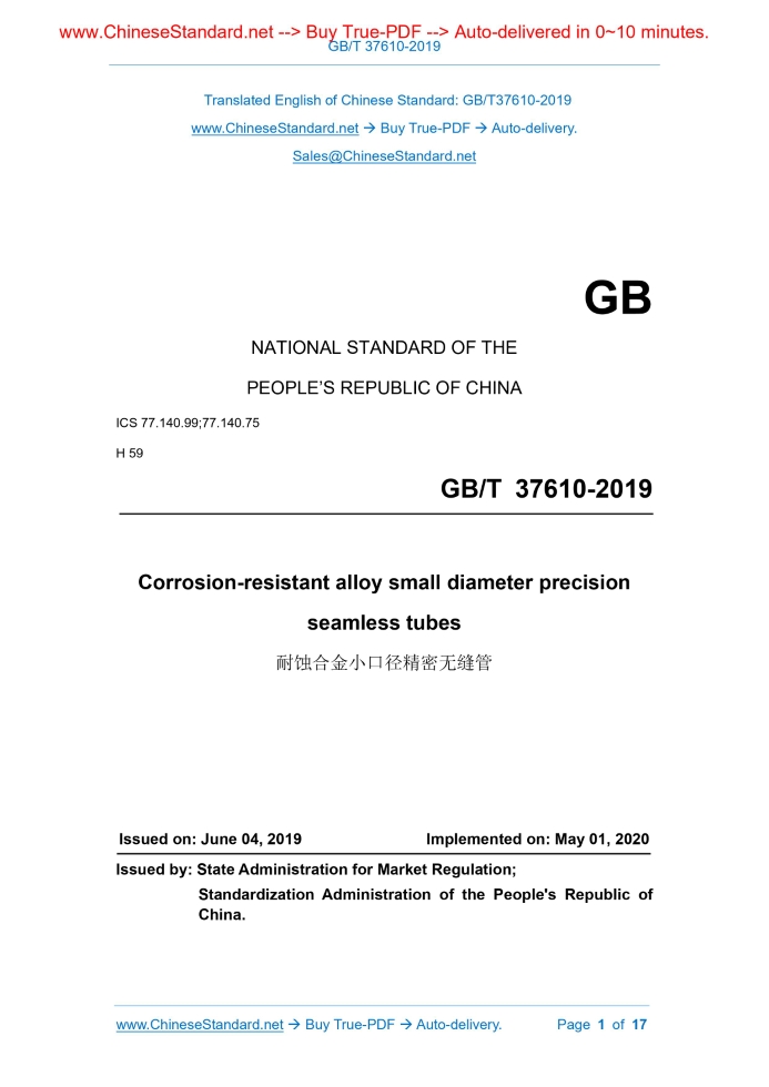 GB/T 37610-2019: Corrosion-resistant alloy small diameter precision seamless tubes Delivery: 9 seconds. True-PDF full-copy in English & invoice will be downloaded + auto-delivered via email. See step-by-step procedure Status: Valid