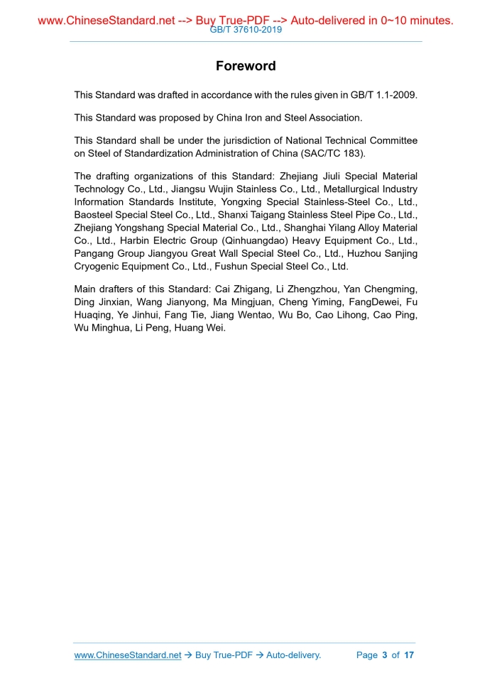 Similar standardsGB/T 37610-2019: Corrosion-resistant alloy small diameter precision seamless tubes---This is an excerpt. Full copy of true-PDF in English version (including equations, symbols, images, flow-chart, tables, and figures etc.), auto-downloaded/delivered in 9 seconds, can be purchased online: https://www.ChineseStandard.net/PDF.aspx/GBT37610-2019NATIONAL STANDARD OF THE PEOPLE’S REPUBLIC OF CHINA ICS 77.140.99;77.140.75 H 59 Corrosion-resistant alloy small diameter precision seamless tubes ISSUED ON: JUNE 04, 2019 IMPLEMENTED ON: MAY 01, 2020 Issued by: State Administration for Market Regulation; Standardization Administration of the People's Republic of China. Table of ContentsForeword ... 3 1 Scope ... 4 2 Normative references ... 4 3 Order content ... 6 4 Size, appearance ... 7 5 Technical requirements ... 8 6 Test methods ... 15 7 Inspection rules ... 16 8 Packaging, marks and quality certificate ... 17ForewordThis Standard was drafted in accordance with the rules given in GB/T 1.1-2009. This Standard was proposed by China Iron and Steel Association. This Standard shall be under the jurisdiction of National Technical Committee on Steel of Standardization Administration of China (SAC/TC 183). The drafting organizations of this Standard: Zhejiang Jiuli Special Material Technology Co., Ltd., Jiangsu Wujin Stainless Co., Ltd., Metallurgical Industry Information Standards Institute, Yongxing Special Stainless-Steel Co., Ltd., Baosteel Special Steel Co., Ltd., Shanxi Taigang Stainless Steel Pipe Co., Ltd., Zhejiang Yongshang Special Material Co., Ltd., Shanghai Yilang Alloy Material Co., Ltd., Harbin Electric Group (Qinhuangdao) Heavy Equipment Co., Ltd., Pangang Group Jiangyou Great Wall Special Steel Co., Ltd., Huzhou Sanjing Cryogenic Equipment Co., Ltd., Fushun Special Steel Co., Ltd. Main drafters of this Standard: Cai Zhigang, Li Zhengzhou, Yan Chengming, Ding Jinxian, Wang Jianyong, Ma Mingjuan, Cheng Yiming, FangDewei, Fu Huaqing, Ye Jinhui, Fang Tie, Jiang Wentao, Wu Bo, Cao Lihong, Cao Ping, Wu Minghua, Li Peng, Huang Wei. Corrosion-resistant alloy small diameter precision seamless tubes1 ScopeThis Standard specifies order content, size, appearance, technical requirements, test methods, inspection rules, packaging, marks and quality certificate of corrosion-resistant alloy small diameter precision seamless tubes. This Standard is applicable to corrosion-resistant alloy cold-rolled (drawn) small diameter precision seamless tubes such as nickel based, iron nickel based, pure nickel and nickel copper of which nominal outer diameter is 3mm~30mm, and wall thickness is 0.3mm~3.0mm (hereinafter referred to as alloy tubes).2 Normative referencesThe following referenced documents are indispensable for the application of this document. For dated references, only the edition cited applies. For undated references, the latest edition of the referenced document (including any amendments) applies. GB/T 223.4, Alloyed steel - Determination of manganese content - Potentiometric or visual titration method GB/T 223.5, Steel and iron - Determination of acid-soluble silicon and total silicon content - Reduced molybdosilicate spectrophotometric method GB/T 223.11, Iron, Steel and Alloy - Determination of Chromium Content - Visual Titration or Potentiometric Titration Method GB/T 223.14, Methods for Chemical Analysis of Iron, Steel and Alloy - The N-Benzoy-N-Phenylhydroxylamine Extraction Photometric Method for the Determination of Vanadium Content GB/T 223.17, Methods for chemical analysis of iron, steel and alloy - The diantipyryl methane photometric method for the determination of titanium content GB/T 223.18, Methods for chemical analysis of iron, steel and alloy - The sodium thiosulfate separation iodometric method for the determination of copper content GB/T 223.25, Methods for chemical analysis of iron, steel and alloy - The dimethylglyoxime gravimetric method for the determination of nickel content GB/T 223.26, Iron, steel and alloy - Determination of molybdenum content - The thiocyanate spectrophotometric method GB/T 223.38, Methods for chemical analysis of iron, steel and alloy - The anion-exchange separation-gravimetric method for the determination of niobium content GB/T 223.43, Iron, steel and alloy - Determination of tungsten content - Gravimetric method and spectrophotometric method GB/T 223.62, Methods for chemical analysis of iron, steel and alloy - The butyl acetate extraction photometric method for the determination of phosphorus content GB/T 223.65, Steel, iron and alloy - Determination of cobalt content - Flame atomic absorption spectrometric method GB/T 223.70, Iron, steel and alloy - Determination of iron contents - O- phenanthroline spectrophotometric method GB/T 223.79, Iron and steel - Determination of multi - element contents - X - ray fluorescence spectrometry (Routine method) GB/T 223.81, Iron, steel and alloy - Determination of total aluminum and total boron contents - Microwave digestion - inductively coupled plasma mass spectrometric method GB/T 228.1, Metallic materials - Tensile testing - Part 1: Method of test at room temperature GB/T 228.2, Metallic materials - Tensile testing - Part 2: Method of test at elevated temperature GB/T 241, Metal Materials - Tube - Hydrostatic pressure test GB/T 242, Metal Materials - Tube - Drift-expending test GB/T 246, Metallic materials - Tube - Flattening test GB/T 2102, Acceptance, packing, marking and quality certification of steel pipe GB/T 5777-2008, Seamless Steel Pipe and Tubing Methods for Ultrasonic Testing GB/T 6394, Metal - Methods for estimating the average grain size GB/T 7735-2016, Automated eddy current testing of seamless and welded (except submerged arc-welded) steel tubes for detection of imperfections GB/T 10561-2005, Steel - Determination of Content of Nonmetallic Inclusions - Micrographic Method Using Standards Diagrams GB/T 11170, Stainless steel - Determination of multi-element contents - Spark disc