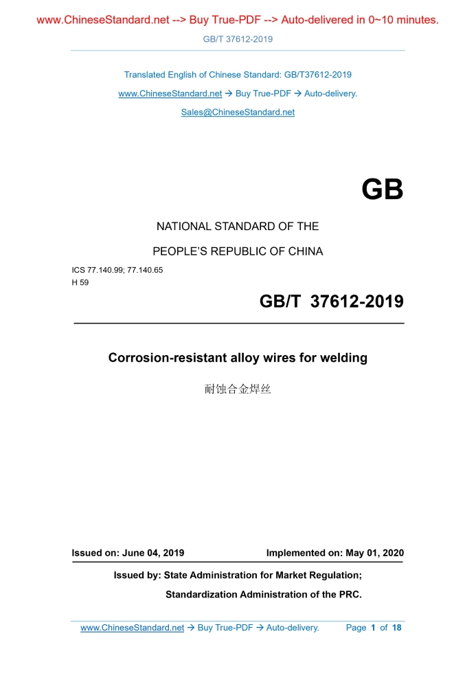 GB/T 37612-2019: Corrosion-resistant alloy wires for welding Delivery: 9 seconds. True-PDF full-copy in English & invoice will be downloaded + auto-delivered via email. See step-by-step procedure Status: Valid