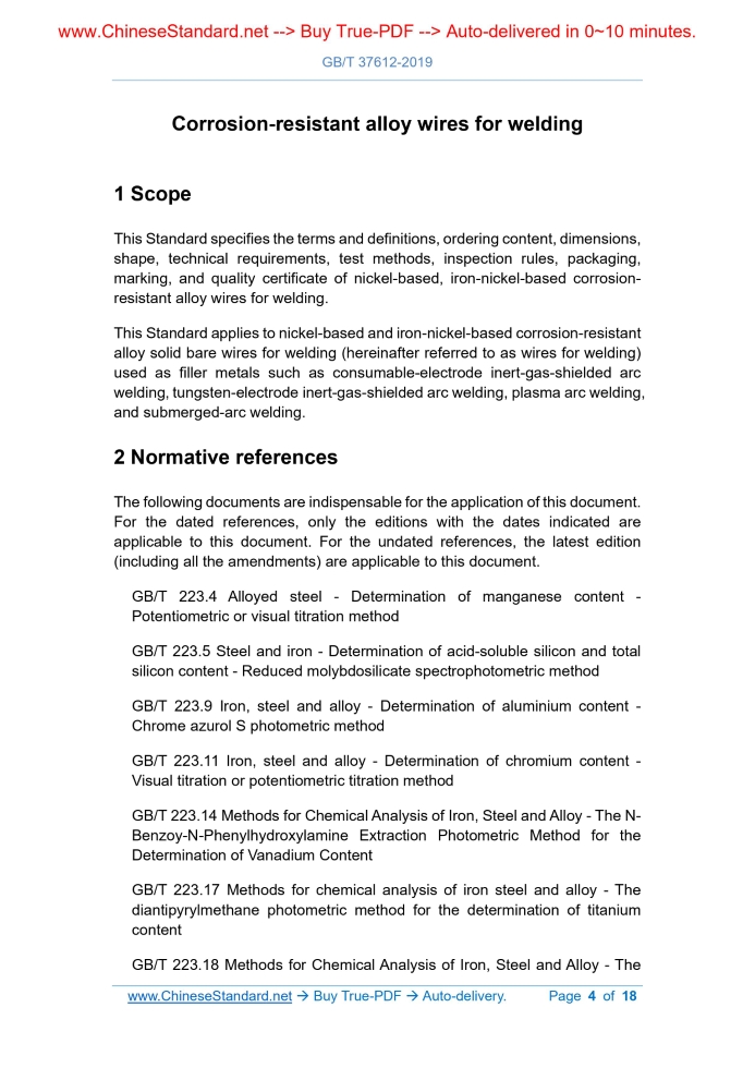 Similar standardsGB/T 37612-2019: Corrosion-resistant alloy wires for welding---This is an excerpt. Full copy of true-PDF in English version (including equations, symbols, images, flow-chart, tables, and figures etc.), auto-downloaded/delivered in 9 seconds, can be purchased online: https://www.ChineseStandard.net/PDF.aspx/GBT37612-2019NATIONAL STANDARD OF THE PEOPLE’S REPUBLIC OF CHINA ICS 77.140.99; 77.140.65 H 59 Corrosion-resistant alloy wires for welding ISSUED ON: JUNE 04, 2019 IMPLEMENTED ON: MAY 01, 2020 Issued by: State Administration for Market Regulation; Standardization Administration of the PRC. Table of ContentsForeword ... 3 1 Scope ... 4 2 Normative references ... 4 3 Terms and definitions ... 6 4 Ordering content ... 6 5 Dimensions and shape ... 6 6 Technical requirements ... 7 7 Test methods ... 10 8 Inspection rules ... 10 9 Packaging, marking, and quality certificate ... 10 Appendix A (Informative) Table for comparison of domestic and foreign designations for wires for welding ... 11 Appendix B (Informative) Characteristics and use of corrosion-resistant alloy wires for welding ... 13 Appendix C (Informative) Recommended solution treatment temperatures .. 17 Appendix D (Informative) Mechanical properties of wires for welding ... 18 Corrosion-resistant alloy wires for welding1 ScopeThis Standard specifies the terms and definitions, ordering content, dimensions, shape, technical requirements, test methods, inspection rules, packaging, marking, and quality certificate of nickel-based, iron-nickel-based corrosion- resistant alloy wires for welding. This Standard applies to nickel-based and iron-nickel-based corrosion-resistant alloy solid bare wires for welding (hereinafter referred to as wires for welding) used as filler metals such as consumable-electrode inert-gas-shielded arc welding, tungsten-electrode inert-gas-shielded arc welding, plasma arc welding, and submerged-arc welding.2 Normative referencesThe following documents are indispensable for the application of this document. For the dated references, only the editions with the dates indicated are applicable to this document. For the undated references, the latest edition (including all the amendments) are applicable to this document. GB/T 223.4 Alloyed steel - Determination of manganese content - Potentiometric or visual titration method GB/T 223.5 Steel and iron - Determination of acid-soluble silicon and total silicon content - Reduced molybdosilicate spectrophotometric method GB/T 223.9 Iron, steel and alloy - Determination of aluminium content - Chrome azurol S photometric method GB/T 223.11 Iron, steel and alloy - Determination of chromium content - Visual titration or potentiometric titration method GB/T 223.14 Methods for Chemical Analysis of Iron, Steel and Alloy - The N- Benzoy-N-Phenylhydroxylamine Extraction Photometric Method for the Determination of Vanadium Content GB/T 223.17 Methods for chemical analysis of iron steel and alloy - The diantipyrylmethane photometric method for the determination of titanium content GB/T 223.18 Methods for Chemical Analysis of Iron, Steel and Alloy - The Sodium Thiosulfate Separation Iodimetric Method for the Determination of Copper Content GB/T 223.22 Methods for chemical analysis of iron, steel and alloy - The nitroso-R-salt spectrophotometric method for the determination of cobalt content GB/T 223.25 Methods for chemical analysis of iron, steel and alloy - The dimethylglyoxime gravimetric method for the determination of nickel content GB/T 223.28 Methods for chemical analysis of iron, steel and alloy - The α- benzoin oxime gravimetric method for the determination of molybdenum content GB/T 223.38 Methods for chemical analysis of iron, steel and alloy - The anion-exchange separation-gravimetric method for the determination of niobium content GB/T 223.43 Iron, steel and alloy - Determination of tungsten content - Gravimetric method and spectrophotometric method GB/T 223.59 Iron, steel and alloy - Determination of phosphorus content - Bismuth phosphomolybdate blue spectrophotometric method and antimony phosphomolybdate blue spectrophotometric method GB/T 223.63 Methods for chemical analysis of iron, steel and alloy - The sodium (potassium) periodate photometric method for the determination of manganese content GB/T 223.73 Iron steel and alloy - Determination of iron contents - Titanium trichloride-potassium dichromate titration method GB/T 223.79 Iron and steel - Determination of multi-element contents - X-ray fluorescence spectrometry (Routine method) GB/T 223.85 Steel and iron - Determination of sulfur content - Infrared absorption method after combustion in an induction furnace GB/T 223.86 Steel and iron - Determination of total carbon content - Infrared absorption method after combustion in an induction furnace GB/T 228.1 Metallic materials - Tensile testing - Part 1: Method of test at room temperature GB/T 2975-2018 Steel and Steel Products - Location and Preparation of Test Pieces for Mechanical Testing6 Technical requirements6.1 Designation and chemical composition The designation and chemical composition (product analysis) of the alloy shall comply with the requirements of Table 1. For the comparison of domestic and foreign designations and unified digital codes for wires for welding, refer to Appendix A. For the characteristics and use of wires for welding, refer to Appendix B. 6.2 Smelting method The alloy is smelted by vacuum induction furnace or by vacuum induction furnace plus electroslag remelting. Through consultation between the supplier and the purchaser, other smelting methods which can meet the requirements of this Standard may also be used. 6.3 Delivery state The wire for welding is delivered in a cold-drawn or solution-treated state. The delivery state shall be indicated in the contract; those not indicated shall be delivered in the cold-drawn state. For recommended solution treatment temperatures, see Appendix C. 6.4 Surface quality The surfac