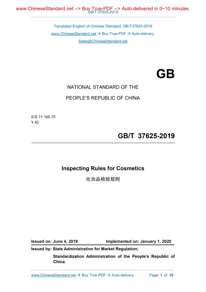 GB/T 37625-2019: Inspecting Rules for Cosmetics Delivery: 9 seconds. True-PDF full-copy in English & invoice will be downloaded + auto-delivered via email. See step-by-step procedure Status: Valid