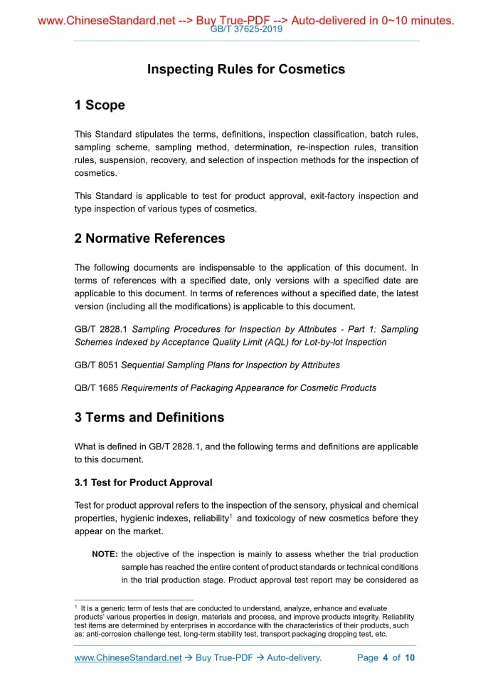 Similar standardsGB/T 37625-2019: Inspecting Rules for Cosmetics---This is an excerpt. Full copy of true-PDF in English version (including equations, symbols, images, flow-chart, tables, and figures etc.), auto-downloaded/delivered in 9 seconds, can be purchased online: https://www.ChineseStandard.net/PDF.aspx/GBT37625-2019NATIONAL STANDARD OF THE PEOPLE’S REPUBLIC OF CHINA ICS 71.100.70 Y 42 Inspecting Rules for Cosmetics ISSUED ON: JUNE 4, 2019 IMPLEMENTED ON: JANUARY 1, 2020 Issued by: State Administration for Market Regulation; Standardization Administration of the People’s Republic of China. Table of ContentsForeword ... 3 1 Scope ... 4 2 Normative References ... 4 3 Terms and Definitions ... 4 4 Inspection Classification ... 5 5 Batch Rules and Sampling Scheme ... 6 6 Sampling Methods ... 7 7 Determination and Re-inspection Rules ... 8 8 Transition Rules ... 8 9 Suspension and Recovery ... 9 10 Inspection and Sampling Rules of Cosmetics ... 9 Inspecting Rules for Cosmetics1 ScopeThis Standard stipulates the terms, definitions, inspection classification, batch rules, sampling scheme, sampling method, determination, re-inspection rules, transition rules, suspension, recovery, and selection of inspection methods for the inspection of cosmetics. This Standard is applicable to test for product approval, exit-factory inspection and type inspection of various types of cosmetics.2 Normative ReferencesThe following documents are indispensable to the application of this document. In terms of references with a specified date, only versions with a specified date are applicable to this document. In terms of references without a specified date, the latest version (including all the modifications) is applicable to this document. GB/T 2828.1 Sampling Procedures for Inspection by Attributes - Part 1: Sampling Schemes Indexed by Acceptance Quality Limit (AQL) for Lot-by-lot Inspection GB/T 8051 Sequential Sampling Plans for Inspection by Attributes QB/T 1685 Requirements of Packaging Appearance for Cosmetic Products3 Terms and DefinitionsWhat is defined in GB/T 2828.1, and the following terms and definitions are applicable to this document. 3.1 Test for Product Approval Test for product approval refers to the inspection of the sensory, physical and chemical properties, hygienic indexes, reliability1 and toxicology of new cosmetics before they appear on the market. NOTE: the objective of the inspection is mainly to assess whether the trial production sample has reached the entire content of product standards or technical conditions in the trial production stage. Product approval test report may be considered as 1 It is a generic term of tests that are conducted to understand, analyze, enhance and evaluate products’ various properties in design, materials and process, and improve products integrity. Reliability test items are determined by enterprises in accordance with the characteristics of their products, such as: anti-corrosion challenge test, long-term stability test, transport packaging dropping test, etc. one of the conditions of applying for appraisal and approval. 3.2 Routine Inspection Routine inspection refers to the inspection of the sensory, physical and chemical properties (excluding heat and cold resistance), net weight, requirements pf packaging appearance, and total bacterial count, molds and yeasts in hygienic indexes for each batch of cosmetics. 3.3 Non-routine Inspection Non-routine inspection refers to the inspection of the heat and cold resistance in physical and chemical properties, and other hygienic indexes other than total bacterial count, molds and yeasts for each batch of cosmetics. 3.4 Item Item refers to cosmetics whose basic unit is bottle, stick, bag and box. 3.5 Proper Disposal Proper disposal refers to the process of picking out individual products that do not comply with the requirements of packaging appearance from an entire batch of cosmetics on the premise of not destroying the sales packaging.4 Inspection Classification4.1 Test for Product Approval After product design is completed, conduct one-time inspection. If product’s properties are safe and reliable, further inspection may be unnecessary. 4.2 Exit-factory Inspection 4.2.1 Before exiting factory, cosmetics shall receive batch-by-batch inspection by manufacturer’s inspection personnel in accordance with the requirements of cosmetic product standards. Those that pass the inspection may be allowed to exit factory. 4.2.2 Exit-factory inspection items are routine inspection items. 4.2.3 Through risk assessment, and the implementation of inspection, tests, verification and confirmation at a proper frequency within a certain period of time, if the accumulated relevant data can prove its applicability, some routine inspection items (excluding total bacterial count, molds and yeasts) may be exempted during exit- factory inspection. 4.3 Type Inspection the inspection batch is constituted of several layers, adopt stratified method to take items. It is allowed to put items that are intact after the inspection back to the previous batch. 6.3 In type inspection, non-routine inspection items may randomly take 2 ~ 4 units from any batch of products, then, in accordance with the method stipulated in product standards, conduct the inspection. 6.4 When type inspection is conducted, routine inspection items shall be subject to the exit-factory inspection result. If type inspection is conducted on reserved samples, it is unnecessary to repeatedly take samples.7 Determination and Re-inspection Rules7.1 In accordance with product standards, determine whether the inspection results of sensory, physical and chemical properties, net weight and hygienic indexes are qualified. If an index in the inspection result is disqualified, both parties are allowed to jointly re-take samples in accordance with the stipulations in Chapter 6 in this Standard and conduct re-inspection of the index (excluding microbial index). If the re-in