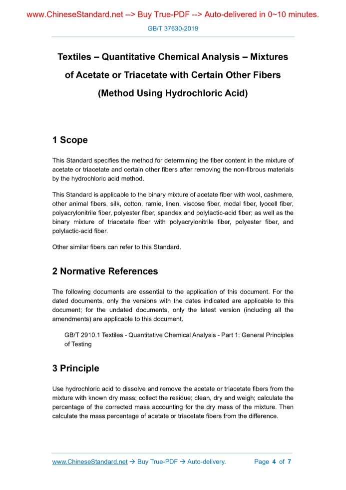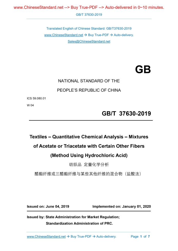 GB/T 37630-2019: Textiles - Quantitative chemical analysis - Mixtures of acetate or triacetate with certain other fibres (method using hydrochloric acid) Delivery: 9 seconds. True-PDF full-copy in English & invoice will be downloaded + auto-delivered via email. See step-by-step procedure Status: Valid