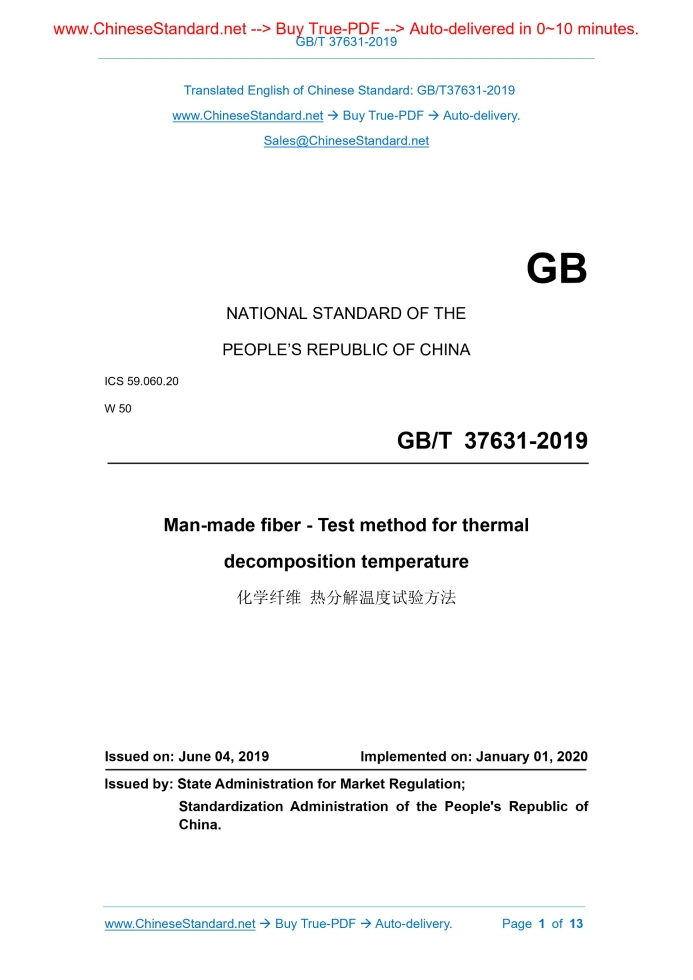 GB/T 37631-2019: Man-made fiber - Test method for thermal decomposition temperature Delivery: 9 seconds. True-PDF full-copy in English & invoice will be downloaded + auto-delivered via email. See step-by-step procedure Status: Valid
