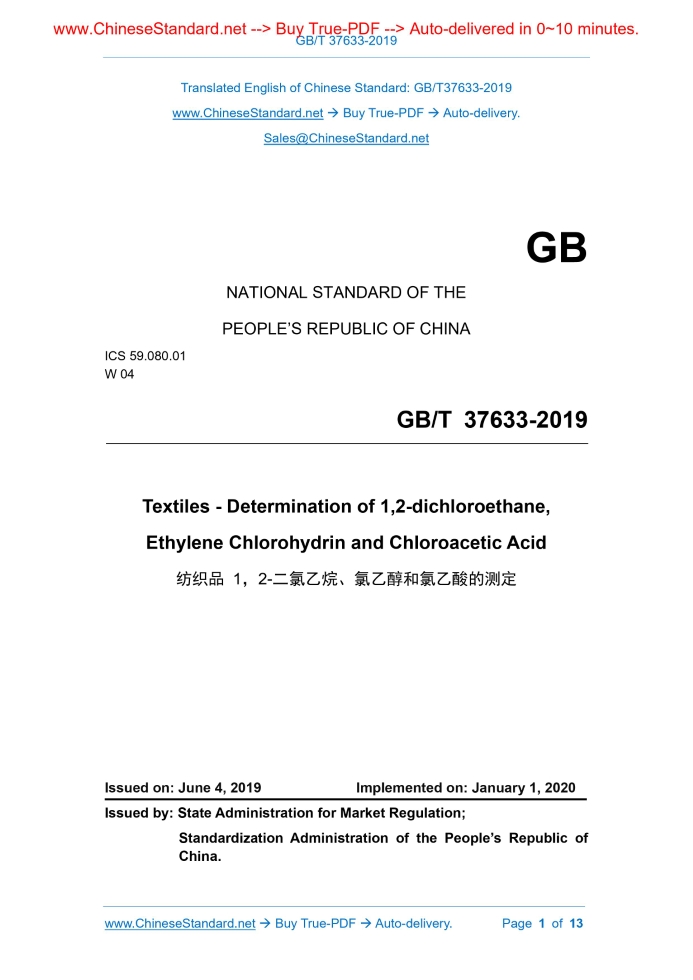 GB/T 37633-2019: Textiles - Determination of 1,2-dichloroethane, Ethylene Chlorohydrin and Chloroacetic Acid Delivery: 9 seconds. True-PDF full-copy in English & invoice will be downloaded + auto-delivered via email. See step-by-step procedure Status: Valid