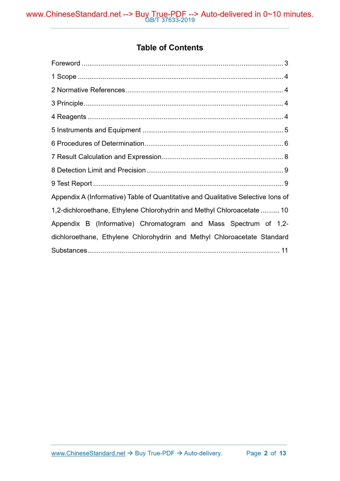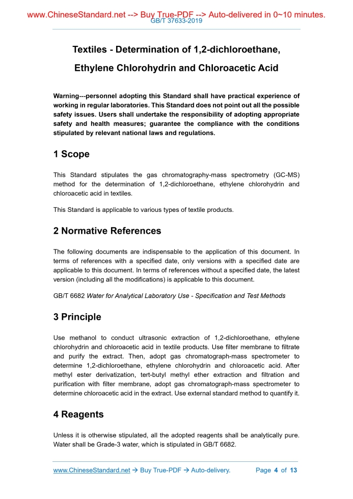 Similar standardsGB/T 37633-2019: Textiles - Determination of 1,2-dichloroethane, Ethylene Chlorohydrin and Chloroacetic Acid---This is an excerpt. Full copy of true-PDF in English version (including equations, symbols, images, flow-chart, tables, and figures etc.), auto-downloaded/delivered in 9 seconds, can be purchased online: https://www.ChineseStandard.net/PDF.aspx/GBT37633-2019 NATIONAL STANDARD OF THE PEOPLE’S REPUBLIC OF CHINA ICS 59.080.01 W 04 Textiles - Determination of 1,2-dichloroethane, Ethylene Chlorohydrin and Chloroacetic Acid ISSUED ON: JUNE 4, 2019 IMPLEMENTED ON: JANUARY 1, 2020 Issued by: State Administration for Market Regulation; Standardization Administration of the People’s Republic of China. Table of ContentsForeword ... 3 1 Scope ... 4 2 Normative References ... 4 3 Principle ... 4 4 Reagents ... 4 5 Instruments and Equipment ... 5 6 Procedures of Determination ... 6 7 Result Calculation and Expression ... 8 8 Detection Limit and Precision ... 9 9 Test Report ... 9 Appendix A (Informative) Table of Quantitative and Qualitative Selective Ions of 1,2-dichloroethane, Ethylene Chlorohydrin and Methyl Chloroacetate ... 10 Appendix B (Informative) Chromatogram and Mass Spectrum of 1,2- dichloroethane, Ethylene Chlorohydrin and Methyl Chloroacetate Standard Substances ... 11 Textiles - Determination of 1,2-dichloroethane, Ethylene Chlorohydrin and Chloroacetic Acid Warning---personnel adopting this Standard shall have practical experience of working in regular laboratories. This Standard does not point out all the possible safety issues. Users shall undertake the responsibility of adopting appropriate safety and health measures; guarantee the compliance with the conditions stipulated by relevant national laws and regulations.1 ScopeThis Standard stipulates the gas chromatography-mass spectrometry (GC-MS) method for the determination of 1,2-dichloroethane, ethylene chlorohydrin and chloroacetic acid in textiles. This Standard is applicable to various types of textile products.2 Normative ReferencesThe following documents are indispensable to the application of this document. In terms of references with a specified date, only versions with a specified date are applicable to this document. In terms of references without a specified date, the latest version (including all the modifications) is applicable to this document. GB/T 6682 Water for Analytical Laboratory Use - Specification and Test Methods3 PrincipleUse methanol to conduct ultrasonic extraction of 1,2-dichloroethane, ethylene chlorohydrin and chloroacetic acid in textile products. Use filter membrane to filtrate and purify the extract. Then, adopt gas chromatograph-mass spectrometer to determine 1,2-dichloroethane, ethylene chlorohydrin and chloroacetic acid. After methyl ester derivatization, tert-butyl methyl ether extraction and filtration and purification with filter membrane, adopt gas chromatograph-mass spectrometer to determine chloroacetic acid in the extract. Use external standard method to quantify it.4 ReagentsUnless it is otherwise stipulated, all the adopted reagents shall be analytically pure. Water shall be Grade-3 water, which is stipulated in GB/T 6682. 5.7 Vortex mixer. 5.8 Centrifuge: rotating speed shall be not lower than 3,500 r/min. 5.9 Muffle furnace. 5.10 Gas chromatograph-mass spectrometer: equipped with electron impact (EI) source.6 Procedures of Determination6.1 Extraction Take a representative sample; cut it into pieces under the size of 5 mm 5 mm; mix them up. Weigh-take (1.00 ± 0.01) g of sample; place it in the extractor (5.2). Add 10 mL of methanol (4.1), then, seal it up. In the ultrasonic generator (5.3), conduct constant-temperature extraction for 30 min. Thus, obtain the extract. 6.2 Preparation of Sample Solution 6.2.1 Preparation of 1,2-dichloroethane and ethylene chlorohydrin sample solution Use the filter membrane (5.4) to filter the extract (6.1). It shall be used for gas chromatography-mass spectrometry, and the determination of 1,2-dichloroethane and ethylene chlorohydrin. 6.2.2 Preparation of chloroacetic acid derivatized sample solution Accurately transfer-take 5.0 mL of the extract (6.1), then, place it into the centrifuge tube with a plug (5.5). Add 0.9 mL of concentrated sulfuric acid (4.3); accurately add 5 mL of tert-butyl methyl ether (4.2). After mixing it up, place it still in water bath at (50 ± 2) °C and conduct esterification reaction for 60 min. After cooling it down in ice bath, add 2 mL of sodium sulfate solution (4.6). After vortex mixing and centrifugation, remove the lower layer of solution. Then, add 2 mL of statured sodium carbonate solution (4.7). After vortex mixing, conduct centrifugation, remove the lower layer of solution. Add around 2 g of anhydrous sodium sulfate (4.4) to dehydrate it. After filtering it through the filter membrane (5.4), reserve it for gas chromatography-mass spectrometry, and the determination of chloroacetic acid. NOTE 1: when adding concentrated sulfuric acid, slowly add it drop-by-drop along the tube wall, so as to prevent dramatic temperature rise and bumping of the solution. NOTE 2: when adding saturated sodium carbonate solution, slowly add it, so as to prevent bumping of the solution. NOTE 3: during the experiment, safety goggles and protective gloves should be used, so In accordance with the conditions stipulated in 6.4.1, respectively conduct iso- volumetric inserted sample injection into the standard working solution and the sample solution. The response value of the substance being tested in the standard working solution and the sample solution shall be within the linear range of instrument detection. If the content exceeds the range of the standard curve, dilute the sample solution into an appropriate concentration, then, conduct the analysis. If in the selective ion chromatogram of the sample solution and the standard working solution, chromatographic peak emerges in the same retention time, then, take t