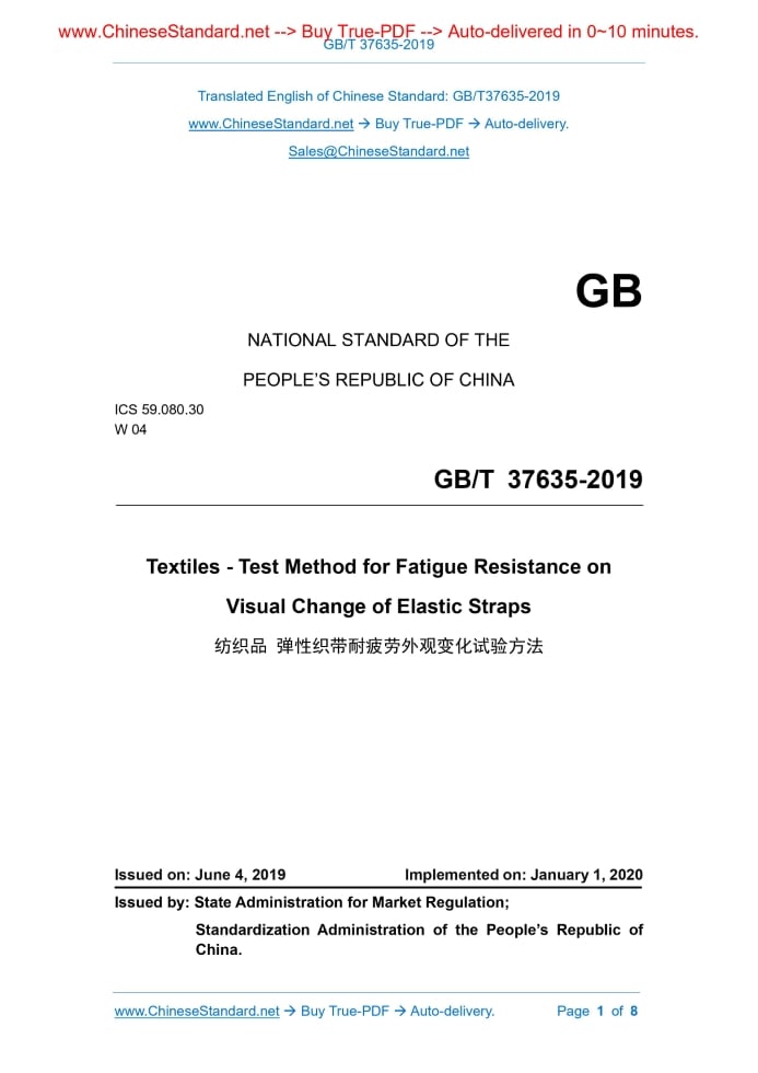 GB/T 37635-2019: Textiles - Test method for fatigue resistance on visual change of elastic straps Delivery: 9 seconds. True-PDF full-copy in English & invoice will be downloaded + auto-delivered via email. See step-by-step procedure Status: Valid