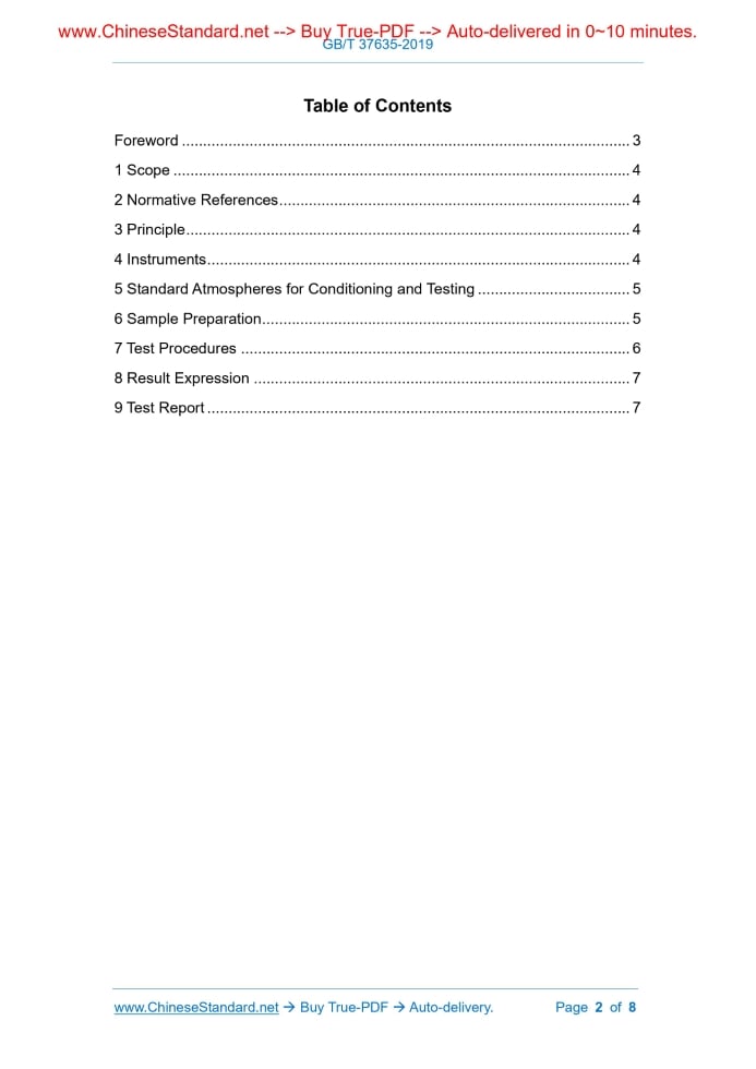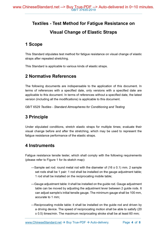 Similar standardsGB/T 37635-2019: Textiles - Test method for fatigue resistance on visual change of elastic straps---This is an excerpt. Full copy of true-PDF in English version (including equations, symbols, images, flow-chart, tables, and figures etc.), auto-downloaded/delivered in 9 seconds, can be purchased online: https://www.ChineseStandard.net/PDF.aspx/GBT37635-2019NATIONAL STANDARD OF THE PEOPLE’S REPUBLIC OF CHINA ICS 59.080.30 W 04 Textiles - Test Method for Fatigue Resistance on Visual Change of Elastic Straps ISSUED ON: JUNE 4, 2019 IMPLEMENTED ON: JANUARY 1, 2020 Issued by: State Administration for Market Regulation; Standardization Administration of the People’s Republic of China. Table of ContentsForeword ... 3 1 Scope ... 4 2 Normative References ... 4 3 Principle ... 4 4 Instruments ... 4 5 Standard Atmospheres for Conditioning and Testing ... 5 6 Sample Preparation ... 5 7 Test Procedures ... 6 8 Result Expression ... 7 9 Test Report ... 7 Textiles - Test Method for Fatigue Resistance on Visual Change of Elastic Straps1 ScopeThis Standard stipulates test method for fatigue resistance on visual change of elastic straps after repeated stretching. This Standard is applicable to various kinds of elastic straps.2 Normative ReferencesThe following documents are indispensable to the application of this document. In terms of references with a specified date, only versions with a specified date are applicable to this document. In terms of references without a specified date, the latest version (including all the modifications) is applicable to this document. GB/T 6529 Textiles - Standard Atmospheres for Conditioning and Testing3 PrincipleUnder stipulated conditions, stretch elastic straps for multiple times; evaluate their visual change before and after the stretching, which may be used to represent the fatigue resistance performance of the elastic straps.4 InstrumentsFatigue resistance tensile tester, which shall comply with the following requirements (please refer to Figure 1 for its sketch map): ---Sample set rod: round metal rod with the diameter of (16 ± 0.1) mm. 2 sample set rods shall be 1 pair: 1 rod shall be installed on the gauge adjustment table; 1 rod shall be installed on the reciprocating mobile table; ---Gauge adjustment table: it shall be installed on the guide rod. Gauge adjustment table can be moved by adjusting the adjustment lever between 2 guide rods. It can adjust sample’s initial tensile gauge. The minimum gauge shall be 100 mm, accurate to 1 mm; ---Reciprocating mobile table: it shall be installed on the guide rod and driven by a driving device. The speed of reciprocating motion shall be able to satisfy (20 ± 0.5) times/min. The maximum reciprocating stroke shall be at least 60 mm; 6.2 At a distance of at least 100 mm from both ends of the sample, at a certain interval, clip at least 3 strip samples with the length of (300 ± 2) mm and the width of the breadth of the strap. The samples shall be representative. There shall be no defects that might affect the test result, such as wrinkling and damage, etc. 6.3 Oppositely overlap both ends of the strip samples; sew into an annular sample, whose perimeter is (250 ± 2) mm. NOTE 1: tests may also be conducted in accordance with other appointed dimensions; this content shall be indicated in the test report. NOTE 2: seam joints shall be firm; stitches shall be parallel and level, so as to prevent from disconnection or uneven tensile force during the tensile test.7 Test Procedures7.1 In accordance with Figure 1, install the annular sample on the sample set rod. Adjust the gauge adjustment table, so that the annular sample on the set rod can maintain a natural straightened state. Set up the speed of the reciprocating mobile table to be 20 times/min; set up the stroke to be 60 mm. NOTE: tests may also be conducted in accordance with other parameters appointed by both parties; this content shall be indicated in the test report. 7.2 Initiate the fatigue resistance tensile tester, then, start the test. In accordance with the following two modes, observe the visual change of the annular sample: a) In terms of test with stipulated fatigue stretching times, firstly, set up the stipulated stretching times, then, start the test. Take 20% of the stipulated stretching times as the interval of inspection; inspect and record the visual change of the annular sample after reaching the stipulated stretching times. Generally speaking, visual change has the following circumstances: ---Partial existence of bending deflection; ---Exposure of yarn; ---Breakage of yarn. NOTE: if the stipulated stretching times is less than 1,000 times, directly inspect and record the visual change of the annular sample after reaching the stipulated stretching times. b) In terms of test which needs to determine the limit of fatigue stretching times, in accordance with the inspection interval stipulated in Table 1, observe the visual change of the sample. When it is found that the annular sample manifests fiber breakage or exposed yarn, stop the test and record the times. ......Source: Above contents are excerpted from the full-copy PDF -- translated/reviewed by: www.ChineseStandard.net / Wayne Zheng et al. Tips & Frequently Asked Questions:Question 1: How long will the true-PDF of English version of GB/T 37635-2019 be delivered?Answer: The full copy PDF of English version of GB/T 37635-2019 can be downloaded in 9 seconds, and it will also be emailed to you in 9 seconds (double mechanisms to ensure the delivery reliably), with PDF-invoice.Question 2: Can I share the purchased PDF of GB/T 37635-2019_English with my colleagues?Answer: Yes. The purchased PDF of GB/T 37635-2019_English will be deemed to be sold to your employer/organization who actually paid for it, including your colleagues and your employer's intranet.Question 3: Does the price include tax/VAT?Answer: Yes. Our tax invoice, downloaded/delivered in 9 seconds, includes all tax/VAT and